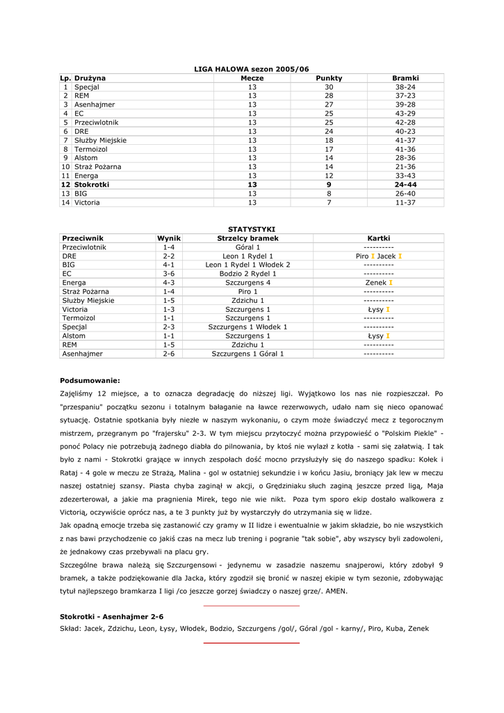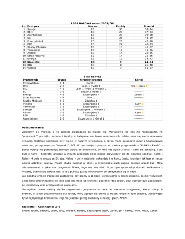 Lp. 1 2 3 4 5 6 7 8 9 10 11 12 13 14 LIGA HALOWA sezon 2005/06 Mecze 13 13 13 13 13 13 13 13 13 13 13 13 13 13 Drużyna Specjal REM Asenhajmer EC Przeciwlotnik DRE Służby Miejskie Termoizol Alstom Straż Pożarna Energa Stokrotki BIG Victoria Przeciwnik Przeciwlotnik DRE BIG EC Energa Straż Pożarna Służby Miejskie Victoria Termoizol Specjal Alstom REM Asenhajmer Wynik 1-4 2-2 4-1 3-6 4-3 1-4 1-5 1-3 1-1 2-3 1-1 1-5 2-6 Punkty 30 28 27 25 25 24 18 17 14 14 12 9 8 7 STATYSTYKI Strzelcy bramek Góral 1 Leon 1 Rydel 1 Leon 1 Rydel 1 Włodek 2 Bodzio 2 Rydel 1 Szczurgens 4 Piro 1 Zdzichu 1 Szczurgens 1 Szczurgens 1 Szczurgens 1 Włodek 1 Szczurgens 1 Zdzichu 1 Szczurgens 1 Góral 1 Bramki 38-24 37-23 39-28 43-29 42-28 40-23 41-37 41-36 28-36 21-36 33-43 24-44 26-40 11-37 Kartki ---------Piro I Jacek I ------------------Zenek I ------------------Łysy I ------------------Łysy I ------------------- Podsumowanie: Zajęliśmy 12 miejsce, a to oznacza degradację do niższej ligi. Wyjątkowo los nas nie rozpieszczał. Po "przespaniu" początku sezonu i totalnym bałaganie na ławce rezerwowych, udało nam się nieco opanować sytuację. Ostatnie spotkania były niezłe w naszym wykonaniu, o czym może świadczyć mecz z tegorocznym mistrzem, przegranym po "frajersku" 2-3. W tym miejscu przytoczyć można przypowieść o "Polskim Piekle" ponoć Polacy nie potrzebują żadnego diabła do pilnowania, by ktoś nie wylazł z kotła - sami się załatwią. I tak było z nami - Stokrotki grające w innych zespołach dość mocno przysłużyły się do naszego spadku: Kołek i Rataj - 4 gole w meczu ze Strażą, Malina - gol w ostatniej sekundzie i w końcu Jasiu, broniący jak lew w meczu naszej ostatniej szansy. Piasta chyba zaginął w akcji, o Grędziniaku słuch zaginą jeszcze przed ligą, Maja zdezerterował, a jakie ma pragnienia Mirek, tego nie wie nikt. Poza tym sporo ekip dostało walkowera z Victorią, oczywiście oprócz nas, a te 3 punkty już by wystarczyły do utrzymania się w lidze. Jak opadną emocje trzeba się zastanowić czy gramy w II lidze i ewentualnie w jakim składzie, bo nie wszystkich z nas bawi przychodzenie co jakiś czas na mecz lub trening i pogranie "tak sobie", aby wszyscy byli zadowoleni, że jednakowy czas przebywali na placu gry. Szczególne brawa należą się Szczurgensowi - jedynemu w zasadzie naszemu snajperowi, który zdobył 9 bramek, a także podziękowanie dla Jacka, który zgodził się bronić w naszej ekipie w tym sezonie, zdobywając tytuł najlepszego bramkarza I ligi /co jeszcze gorzej świadczy o naszej grze/. AMEN. Stokrotki - Asenhajmer 2-6 Skład: Jacek, Zdzichu, Leon, Łysy, Włodek, Bodzio, Szczurgens /gol/, Góral /gol - karny/, Piro, Kuba, Zenek Stokrotki - REM 1-5 Skład: Jacek, Zdzichu /gol/, Leon, Łysy, Włodek, Bodzio, Szczurgens, Góral, Piro, Kuba, Zenek Stokrotki - Alstom 1-1 /0-0/ Skład: Jacek, Zdzichu, Kuba, Piro, Rydel, Leon, Łukasz, Włodek, Łysy I, Szczurgens /gol/ Zenek - kontuzja Stokrotki - Specjal 2-3 /2-1/ Skład: Jacek, Piro, Zdzichu, Łukasz, Leon, Szczurgens /1 gol/, Włodek /1 gol/, Kuba, Łysy, Rydel Zenek - kontuzja /nie zagrał/ Stokrotki - Termoizol 1-1 /0-0/ Skład: Jacek, Zenek, Piro, Zdzichu, Łukasz, Leon, Szczurgens /1 gol/, Włodek, Kuba, Łysy Stokrotki - Służby Miejskie 1-5 /1-3/ Skład: Jacek, Zenek, Piro, Rydel, Zdzichu /1 gol/, Łukasz, Leon, Szczurgens, Góral, Włodek, Zbyszek Stokrotki - Straż Pożarna 1-4 /1-2/ Skład: Jacek, Zenek, Piro /1 gol/, Rydel, Łukasz, Łysy, Bodzio, Szczurgens, Góral, Zdzichu /bramki strzelały tylko Stokrotki - 3 Kołek, 1 Michał, 1 Piro/ Stokrotki - Energia 4-3 /2-2/ Skład: Jacek, Zenek I, Zbyszek, Piro, Rydel, Włodek, Łukasz, Leon, Łysy, Bodzio, Szczurgens /4 gole/ Rezerwa: Kuba, Góral Stokrotki - EC 3-6 Skład: Łysy, Zenek, Piro, Rydel /gol/, Zbyszek, Bodzio /2 gole/, Kuba, Leon, Szczurgens Stokrotki - BIG 4-1 /3-1/ Skład: Jacek, Zenek, Zbyszek, Piro, Kuba, Rydel /gol/, Leon /gol/, Włodek /2 gole/, Łysy Stokrotki - DRE 2-2 /1-1/ Skład: Jacek I /debiut w Stokrotkach/, Zenek, Kuba, Góral, Bodzio, Szczurgens, Piro I, Zbyszek, Leon /gol/, Rydel /gol/, Łysy, Łukasz Stokrotki - Przeciwlotnik 1-4 /0-2/ Skład: Maja, Zenek, Góral /gol/, Włodek, Kuba, Łysy, Zdzichu, Leon, Bodzio, Piro, Zbyszek, Łukasz