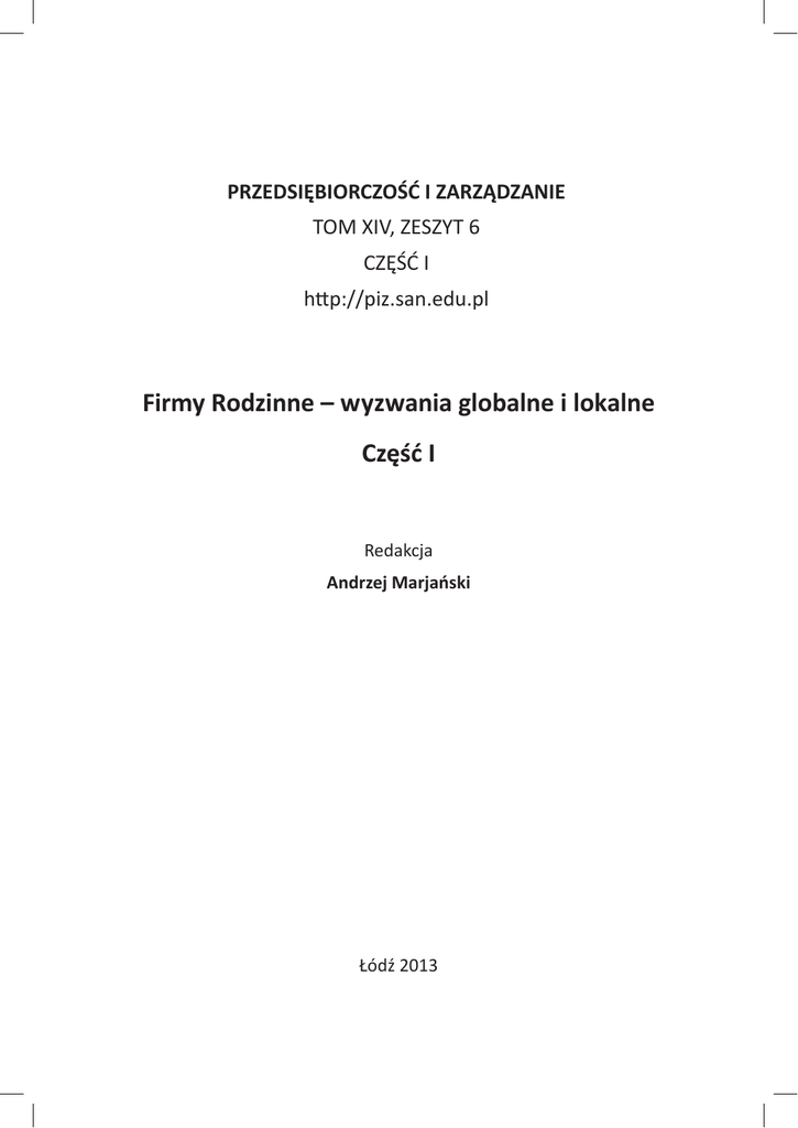 PRZEDSIĘBIORCZOŚĆ I ZARZĄDZANIE TOM XIV, ZESZYT 6 CZĘŚĆ I http://piz.san.edu.pl Firmy Rodzinne – wyzwania globalne i lokalne Część I Redakcja Andrzej Marjański Łódź 2013 Całkowity koszt wydania Zeszytu 6, części I sfinansowany ze środków Społecznej Akademii Nauk Zeszyt recenzowany Redaktor tematyczny: Andrzej Marjański Korekta językowa: Dominika Świech Skład i łamanie: Dominika Świech Projekt okładki: Marcin Szadkowski © Copyright by Społeczna Akademia Nauk ISSN: 1733-2486 Wydawnictwo Społecznej Akademii Nauk ul. Kilińskiego 109, 90-011 Łódź 42 676 25 29, w. 339, e-mail: [email protected] Wersja drukowana wydania jest wersją podstawową Druk i oprawa: Mazowieckie Centrum Poligrafii, ul. Duża 1, 05-270 Marki, www.c-p.com.pl; [email protected] Spis treści Wstęp ................................................................................................................5 I. Dylematy sukcesji w przedsiębiorstwach rodzinnych.................................3 Krzysztof Safin, Jacek Pluta, Stan i kierunki badań nad procesami sukcesyjnymi w Polsce i na świecie.......................................................................11 Nicoletta Baskiewicz, Izabela Niziałek, Sukcesja w firmach rodzinnych a przekazywanie władzy według japońskiej koncepcji Lean management...............37 Marta Gasińska, Managing the succession process in the family business................47 Marcin Olkiewicz, Jakość zasobów ludzkich determinantą procesu sukcesji...........57 Jacek Pluta, Sytuacja sukcesji i procesy socjalizacyjne w polskich przedsiębiorstwach rodzinnych............................................................................73 Łukasz Martyniec, Paweł Rataj, Prawo jako narzędzie planowania sukcesji w firmie rodzinnej. Uwagi wprowadzające..........................................................83 Agnieszka Wróblewska-Kazakin, Aspekty prawne sukcesji majątku w firmach rodzinnych.........................................................................................................95 Elżbieta Roszko-Wójtowicz, Przygotowanie polskich przedsiębiorców do transferu przedsiębiorstwa – stan aktualny i perspektywy przyszłe.......................103 Katarzyna Magdalena Orzechowska, Magdalena Rybicka, Sukcesja w rodzinnych biurach księgowych na terenie Warszawy i okolic..........................121 Elżbiera Roszko-Wójtowicz, Transfer przedsiębiorstwa – problemy i wyzwania związane ze znalezieniem sukcesora w opinii przedsiębiorców.......... 131 Tomasz Budziak, Family Office – zewnętrzna struktura wzmacniająca procesy zarządzania i sukcesji rodzin biznesowych......................................................... 145 II. Strategie firm rodzinnych........................................................................ 161 Jacek Lipiec, Statut Dziedzictwa Grupy Łapaj jako przykład właścicielskiego nadzoru rodzinnego..........................................................................................163 Adrianna Lewandowska, Alicja Hadryś-Nowak, Wpływ czynników rodzinności na postrzeganie przedsiębiorstwa rodzinnego przez interesariuszy zewnętrznych w świetle badań własnych............................................................ 173 Olga Martyniuk, Wartość przedsiębiorstwa rodzinnego – rozważania nad istotą i pomiarem..............................................................................................187 Joanna Stefańska, Zasobowe czynniki sukcesu przedsiębiorstw rodzinnych w literaturze i praktyce....................................................................199 Anna Lemańska-Majdzik, Specyfika strategicznej działalności śląskich firm rodzinnych................................................................................... 211 Andrzej Marjański, Rodzinne grupy kapitałowe................................................223 III. Warunki funkcjonowania firm rodzinnych..........................................235 Jarosław Ropęga, Zagrożenie małych firm rodzinnych zjawiskiem niepowodzenia gospodarczego............................................................................237 Karolina Gałązka, Wpływ dofinansowania z Unii Europejskiej na funkcjonowanie firm rodzinnych na obszarze województwa lubelskiego...............249 Krystyna Leszczewska, Katarzyna Zaniewska, Motywy i formy internacjonalizacji firm rodzinnych...................................................................261 IV. Sektor MSP jako dominujące środowisko funkcjonowania biznesów rodzinnych....................................................................................273 Ewa Kempa, Miejsce firm rodzinnych w sektorze MSP......................................275 Rebeca de Gortari Rabiela, El papel de las redes sociales en el desarrollo de las microempresas: ejemplos de la zona rural de la ciudad de México...............285 Emilia Grzegorzewska, Magdalena Olkowicz, Determinanty realizacji procesu rozwoju nowych mebli w sektorze MŚP..................................................299 Wstęp Przed naukami o zarządzaniu oraz praktyką zarządzania jednym z kluczowych wyzwań staje się koncepcja rozwoju przedsiębiorstw rodzinnych. Pomimo, że firmy rodzinne stanowią najstarszą i najbardziej naturalną formę przedsiębiorczości, muszą nadal wychodzić naprzeciw pojawiającym się wyzwaniom. Współczesne warunki gospodarowania stawiają zarządzających przedsiębiorstwami rodzinnymi przed koniecznością rozwiązywania wielu specyficznych problemów, obejmujących zarówno strategiczne, jak i operacyjne wyzwania, wynikające z uwarunkowań i reguł rodzinnego biznesu. Badaczy przedsiębiorczości rodzinnej zawsze zastanawia zakres specyfiki i szczególnych uwarunkowań, powodujących, ze przedsiębiorstwa rodzinne w wielu obszarach funkcjonowania wykazują sobie tylko właściwe cechy. Problematyka związana z sukcesją, budową strategii przedsiębiorstwa rodzinnego oraz warunkami funkcj