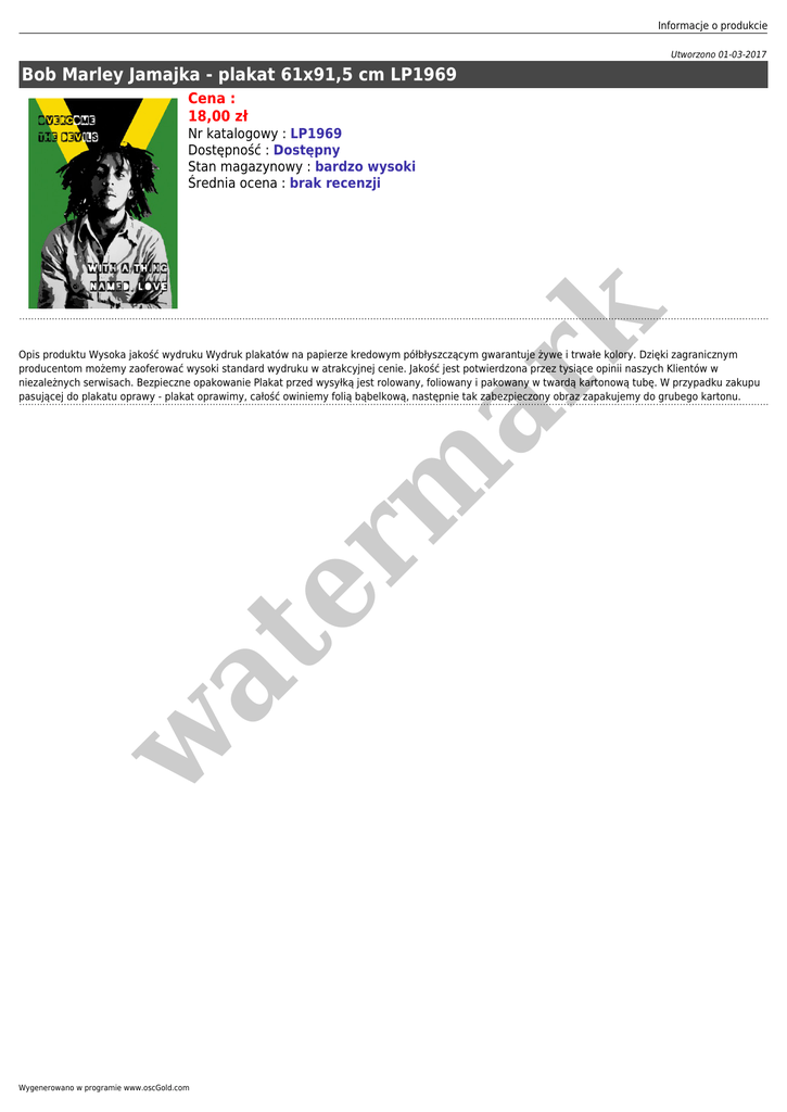 Informacje o produkcie Utworzono 01-03-2017 Bob Marley Jamajka - plakat 61x91,5 cm LP1969 Cena : 18,00 zł er m ar k Nr katalogowy : LP1969 Dostępność : Dostępny Stan magazynowy : bardzo wysoki Średnia ocena : brak recenzji w at Opis produktu Wysoka jakość wydruku Wydruk plakatów na papierze kredowym półbłyszczącym gwarantuje żywe i trwałe kolory. Dzięki zagranicznym producentom możemy zaoferować wysoki standard wydruku w atrakcyjnej cenie. Jakość jest potwierdzona przez tysiące opinii naszych Klientów w niezależnych serwisach. Bezpieczne opakowanie Plakat przed wysyłką jest rolowany, foliowany i pakowany w twardą kartonową tubę. W przypadku zakupu pasującej do plakatu oprawy - plakat oprawimy, całość owiniemy folią bąbelkową, następnie tak zabezpieczony obraz zapakujemy do grubego kartonu. Wygenerowano w programie www.oscGold.com