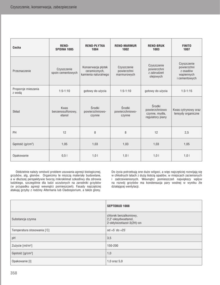 Czyszczenie, konserwacja, zabezpieczanie RENOSPOINA 1005 RENO-PŁYTKA 1004 RENO-MARMUR 1002 RENO-BRUK 1003 FINITO 1007 Czyszczenie spoin cementowych Konserwacja płytek ceramicznych, kamienia naturalnego Czyszczenie powierzchni marmurowych Czyszczenie powierzchni z zabrudzeń olejowych Czyszczenie powierzchni z osadów wapiennych i cementowych 1:5-1:10 gotowy do użycia 1:5-1:10 gotowy do użycia 1:3-1:15 Kwas benzenosulfonowy, etanol Środki powierzchniowoczynne Środki powierzchniowoczynne Środki powierzchniowo czynne, mydła, regulatory piany Kwas cytrynowy oraz tensydy organiczne 12 8 8 12 2,5 Gęstość (g/cm3) 1,05 1,03 1,03 1,03 1,05 Opakowanie 0,5 l 1,0 l 1,0 l 1,0 l 1,0 l Cecha Przeznaczenie Proporcje mieszania z wodą Skład PH Oddzielnie należy omówić problem usuwania agresji biologicznej, grzybów, alg, glonów. Organizmy te niszczą materiały budowlane, a w dłuższej perspektywie tworzą mikroklimat szkodliwy dla zdrowia ludzkiego, szczególnie dla ludzi uczulonych na zarodniki grzybów (w przypadku agresji wewnątrz pomieszczeń). Fasady najczęściej atakują grzyby z rodziny Alternaria lub Cladosporium, a także glony. Do życia potrzebują one dużo wilgoci, a więc najczęściej rozwijają się w chłodnych latach z dużą ilością opadów, w miejscach zacienionych i zadrzewienionych. Wewnątrz pomieszczeń największy wpływ na rozwój grzybów ma kondensacja pary wodnej w wyniku źle działającej wentylacji. SEPTOBUD 1008 Substancja czynna chlorek benzalkoniowy, 2,2’-oksydwuetanol, 2-oktyloizotiazol-3(2H)-on Temperatura stosowania [°C] od +5° do +25° pH 3,5 Zużycie [ml/m2] 150-200 Gęstość [g/cm3] 1,0 Opakowanie [l] 1,0 oraz 5,0 358 Czyszczenie, konserwacja, zabezpieczanie Dobór preparatu czyszczącego w zależności od rodzaju zabrudzenia RENO-SPOINA 1005 RENO-MARMUR 1002 RENO-BRUK 1003 FINITO 1007 SEPTOBUD 1008 Wykwity solne, kamień kotłowy – – – + – Osady z opadów atmosferycznych + + – + – Rdza i inne tlenki metali – – – + – Smary, oleje silnikowe – – + – – Tłuszcze w kuchniach + + + – – Osady z mydlin i innych środków higieny + + – – – Osady z cementu i wapna – – – + – Agresja biologiczna – – – – + po dokładnym oczyszczeniu takiego podłoża. Pokrycie preparatami impregnacyjnymi spowoduje uszczelnienie powierzchni i zabezpieczy przed zabrudzeniami, wnikaniem wilgoci (hydrofobizacja powierzchni), a także przed powstawaniem przebarwień spowodowanych wykwitami solnymi. Impregnacja i konserwacja. Czynności te polegają na nasyceniu bądź powleczeniu powierzchni materiału budowlanego środkami chemicznymi, celem zabezpieczenia przed szkodliwym wpływem czynników atmosferycznych, wody, kurzu, brudu i powstawaniem plam. Jest ona bezwzględnie potrzebna FRONTA 1001 HYDROMUR-W 1010 Polimer akrylowy, węglowodory alifatyczne, olej parafinowy Wodna dyspersja żywic silikonowych od +5° do +25° od +5° do +25° Zużycie [ml/m2] 80-120 200-700 Gęstość [g/cm3] 0,80 1,0 Odporność na działanie deszczu [h] Po wyschnięciu 4 Czas pełnego działania hydrofobowego [dni] Po wyschnięciu 7 1 l puszka metalowa 1 l i 5 l pojemniki plastikowe Skład Temperatura stosowania [°C] Opakowania 359 Czyszczenie, konserwacja, zabezpieczanie Dobór preparatów do konserwacji i impregnacji FRONTA 1001 HYDROMUR-W 1010 Elementy klinkierowe + + Elementy ceramiczne (zwykłe cegły, dachówka) + + Kamień naturalny + + Tynki dekoracyjne – + Tynki cementowo-wapienne, gipsowe – + Elementy cementowe – + Płytki ceramiczne i gresowe elewacyjne + – Płytki ceramiczne i gresowe podłogowe – – PCW – – Lakierowane drewno podłogowe – – Panele podłogowe drewnopochodne – – Schemat doboru środka czyszczącego 360