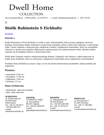 www.momastudio.pl | INFOLINIA.: 22 2437671 | e-mail: [email protected] | 2017-03-01 Stolik Rubinstein S Eichholtz Eichholtz 6050.00 zł Stolik Rubinstein S firmy Eichholtz to stolik w stylu wiktoriańskim, który swoim wyglądem zachwyci każdego. Konstrukcja stolika wykonana z antycznego mosiądzu, górny i dolny blat wykonany z antycznego szkła. Całość zrobiona z dużą precyzją i dbałością o detale z najlepszych materiałów, które są szczególnie widoczne w bardzo precyzyjnych dekoracjach umieszczonych na wykończeniach nóżek. Idealnie będzie wpasuje się do każdego wnętrza w klasycznym stylu. Stolik doda Twojemu wnętrzu niepowtarzalnego klimatu i elegancji oraz luksusu z jakim kojarzone są meble firmy Eichholtz, które są wykonane z najlepszych materiałów przez najlepszych rzemieślników. Produkty firmy Eichholtz są znane z tego, że nie ma dwóch identycznych produktów, każdy produkt jest unikatowy. Wymiary ● ● ● ● Szerokość: 0.00 cm Wysokość: 71.00 cm Głębokość: 0.00 cm Średnica: 51 cm Dane techniczne ● ● Wykonanie: antyczny mosiądz Blat: szkło antyczne WARSZAWA Al. Krakowska 6a 05-090 Janki k/Warszawy tel: +48 22 2437671 +48 664 890 337 e-mail: [email protected] GDAŃSK CH RENTAL PARK ul. Przywidzka 7 80-001 Gdańsk tel: +48 58 3508790 e-mail: [email protected] KRAKÓW ul. Zakopiańska 56 30-418 Kraków tel: +48 505 436 669 tel: +48 12 3070112 e-mail: [email protected] WROCŁAW ul. Wrocławska 7 55-040 Wrocław tel: +48 71 3461885 e-mail: [email protected]