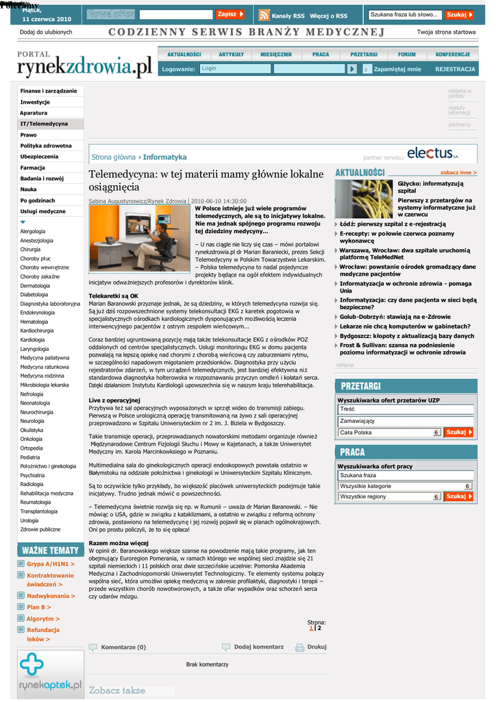 yAktualno Artyku Miesi Konferencje cForum Gor Praca i i tematy znik e Raporty łśPrzetargi ę ą Piątek, Polecamy Kanały RSS Więcej o RSS 11 czerwca 2010 Szukana fraza lub słowo... Dodaj do ulubionych Twoja strona startowa Logowanie: c Zapamiętaj mnie d e f g Login REJESTRACJA Finanse i zarządzanie reklama w portalu Inwestycje Aparatura moduły informacji IT/Telemedycyna partnerzy Prawo Polityka zdrowotna Strona główna › Informatyka Ubezpieczenia Farmacja Badania i rozwój Nauka Po godzinach Usługi medyczne Alergologia Anestezjologia Chirurgia Choroby płuc Choroby wewnętrzne Choroby zakaźne Dermatologia Diabetologia Diagnostyka laboratoryjna Endokrynologia Hematologia Kardiochirurgia Kardiologia Laryngologia Medycyna paliatywna Medycyna ratunkowa Medycyna rodzinna Mikrobiologia lekarska partner serwisu: Telemedycyna: w tej materii mamy głównie lokalne osiągnięcia Sabina Augustynowicz/Rynek Zdrowia 2010-06-10 14:30:00 W Polsce istnieje już wiele programów telemedycznych, ale są to inicjatywy lokalne. Nie ma jednak spójnego programu rozwoju tej dziedziny medycyny... – U nas ciągle nie liczy się czas – mówi portalowi rynekzdrowia.pl dr Marian Baraniecki, prezes Sekcji Telemedycyny w Polskim Towarzystwie Lekarskim. – Polska telemedycyna to nadal pojedyncze projekty będące na ogół efektem indywidualnych inicjatyw odważniejszych profesorów i dyrektorów klinik. Telekaretki są OK Marian Baranowski przyznaje jednak, że są dziedziny, w których telemedycyna rozwija si ę. Są już dziś rozpowszechnione systemy telekonsultacji EKG z karetek pogotowia w specjalistycznych ośrodkach kardiologicznych dysponujących możliwością leczenia interwencyjnego pacjentów z ostrym zespołem wieńcowym... Coraz bardziej ugruntowaną pozycję mają także telekonsultacje EKG z o środków POZ oddalonych od centrów specjalistycznych. Usługi monitoringu EKG w domu pacjenta pozwalają na lepszą opiekę nad chorymi z chorobą wieńcow ą czy zaburzeniami rytmu, w szczególności napadowym migotaniem przedsionków. Diagnostyka przy u życiu rejestratorów zdarzeń, w tym urządzeń telemedycznych, jest bardziej efektywna ni ż standardowa diagnostyka holterowska w rozpoznawaniu przyczyn omdleń i kołatań serca. Dzięki działaniom Instytutu Kardiologii upowszechnia si ę w naszym kraju telerehabilitacja. zobacz inne > Giżycko: informatyzują szpital Pierwszy z przetargów na systemy informatyczne już w czerwcu Łódź: pierwszy szpital z e-rejestracją E-recepty: w połowie czerwca poznamy wykonawcę Warszawa, Wrocław: dwa szpitale uruchomią platformę TeleMedNet Wrocław: powstanie ośrodek gromadzący dane medyczne pacjentów Informatyzacja w ochronie zdrowia - pomaga Unia Informatyzacja: czy dane pacjenta w sieci będą bezpieczne? Golub-Dobrzyń: stawiają na e-Zdrowie Lekarze nie chcą komputerów w gabinetach? Bydgoszcz: kłopoty z aktualizacją bazy danych Frost & Sullivan: szansa na podniesienie poziomu informatyzacji w ochronie zdrowia reklama Nefrologia Neonatologia Neurochirurgia Neurologia Live z operacyjnej Przybywa też sal operacyjnych wyposażonych w sprzęt wideo do transmisji zabiegu. Pierwszą w Polsce urologiczną operację transmitowaną na żywo z sali operacyjnej przeprowadzono w Szpitalu Uniwersyteckim nr 2 im. J. Biziela w Bydgoszczy. Wyszukiwarka ofert przetarów UZP Treść Zamawiający Okulistyka Onkologia Ortopedia Takie transmisje operacji, przeprowadzanych nowatorskimi metodami organizuje również Międzynarodowe Centrum Fizjologii Słuchu i Mowy w Kajetanach, a także Uniwersytet Medyczny im. Karola Marcinkowksiego w Poznaniu. Cała Polska 6 Pediatria Położnictwo i ginekologia Psychiatria Radiologia Rehabilitacja medyczna Reumatologia Transplantologia Urologia Zdrowie publiczne Multimedialna sala do ginekologicznych operacji endoskopowych powstała ostatnio w Białymstoku na oddziale położnictwa i ginekologii w Uniwersyteckim Szpitalu Klinicznym. Są to oczywiście tylko przykłady, bo większość placówek uniwersyteckich podejmuje takie inicjatywy. Trudno jednak mówić o powszechno ści. – Telemedycyna świetnie rozwija się np. w Rumunii – uważa dr Marian Baranowski. – Nie mówiąc o USA, gdzie w zwi ązku z kataklizmami, a ostatnio w związku z reformą ochrony zdrowia, postawiono na telemedycyn ę i jej rozwój pojawił się w planach ogólnokrajowych. Oni po prostu policzyli, że to się opłaca! Nadwykonania > Razem można więcej W opinii dr. Baranowskiego wi ększe szanse na powodzenie mają takie programy, jak ten obejmujący Euroregion Pomerania, w ramach którego we wspólnej sieci znajdzie si ę 21 szpitali niemieckich i 11 polskich oraz dwie szczeci ńskie uczelnie: Pomorska Akademia Medyczna i Zachodniopomorski Uniwersytet Technologiczny. Te elementy systemu połączy wspólna sieć, która umożliwi opiekę medyczną w zakresie profilaktyki, diagnostyki i terapii – przede wszystkim chorób nowotworowych, a także ofiar wypadków oraz schorzeń serca czy udarów mózgu. Plan B > Grypa A/H1N1 > Kontraktowanie świadczeń > Algorytm > Strona: 1 2 Refundacja leków > Dodaj komentarz Komentarze (0) Brak komentarzy Drukuj Wyszukiwarka ofert pracy Szukana fraza 6 Wszystkie kategorie Wszystkie regiony 6 Poznań: nie ma pieniędzy na system przesyłania zapisu pracy serca Robot pomo że w rehabilitacji dzieci z porażeniem mózgowym Przez telefon o diecie Płock: weszli w ratunkowy system telemedyczny Szczecin: Medical Radio zamilknie Gliwice: zostanie wdrożony system teleonkologii Ostrowiec Świętokrzyski: uruchomiono Medyczną Stację Odbiorczą Golub-Dobrzyń: stawiają na e-Zdrowie Warszawa, Wrocław: dwa szpitale uruchomią platformę TeleMedNet Belgia: przypadki eutanazji bez zgody pacjentów PTBB: ból wydłuża pobyt w szpitalu Sejm poszerzył listę dopalaczy Maj 2010 Najnowsze Rewolucja? Sęk w monitorowaniu RTG ma się dobrze Niekoniecznie Aktualne wydanie > jakości Archiwum > Popularne Prenumera