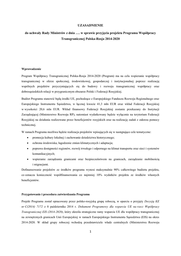 UZASADNIENIE do uchwały Rady Ministrów z dnia …. w sprawie przyjęcia projektu Programu Współpracy Transgranicznej Polska-Rosja 2014-2020 Wprowadzenie Program Współpracy Transgranicznej Polska-Rosja 2014-2020 (Program) ma na celu wspieranie współpracy transgranicznej w sferze społecznej, środowiskowej, gospodarczej i instytucjonalnej poprzez realizację wspólnych projektów przyczyniających się do budowy i rozwoju transgranicznej współpracy oraz dobrosąsiedzkich relacji w przygranicznym obszarze Polski i Federacji Rosyjskiej. Budżet Programu stanowić będą środki UE, pochodzące z Europejskiego Funduszu Rozwoju Regionalnego oraz Europejskiego Instrumentu Sąsiedztwa, w łącznej kwocie 41,3 mln EUR oraz wkład Federacji Rosyjskiej w wysokości 20,6 mln EUR. Wkład finansowy Federacji Rosyjskiej zostanie przekazany do Instytucji Zarządzającej (Ministerstwo Rozwoju RP), natomiast wydatkowany będzie wyłącznie na terytorium Federacji Rosyjskiej na działania realizowane przez beneficjentów rosyjskich oraz na realizację zadań z zakresu pomocy technicznej. W ramach Programu możliwa będzie realizacja projektów wpisujących się w następujące cele tematyczne: promocja kultury lokalnej i zachowanie dziedzictwa historycznego; ochrona środowiska, łagodzenie zmian klimatycznych i adaptacja; poprawa dostępności regionów, rozwój trwałego i odpornego na klimat transportu oraz sieci i systemów komunikacyjnych; wspieranie zarządzania granicami oraz bezpieczeństwem na granicach, zarządzanie mobilnością i migracjami. Dofinansowanie projektów ze środków programu wynosi maksymalnie 90% całkowitego budżetu projektu, co oznacza konieczność współfinansowania co najmniej 10% wydatków projektu ze środków własnych beneficjentów. Przygotowanie i procedura zatwierdzania Programu Projekt Programu został opracowany przez polsko-rosyjską grupę roboczą, w oparciu o przyjęty Decyzją KE nr C(2014) 7172 z 8 października 2014 r. Dokument Programowy dla wsparcia UE na rzecz Współpracy Transgranicznej EIS (2014-2020), który określa strategiczne ramy wsparcia UE dla współpracy transgranicznej na zewnętrznych granicach Unii Europejskiej w ramach Europejskiego Instrumentu Sąsiedztwa (EIS) na okres 2014-2020. W skład grupy roboczej wchodzą przedstawiciele władz centralnych (Ministerstwa Rozwoju 1 Gospodarczego i Ministerstwa Spraw Zagranicznych Federacji Rosyjskiej oraz Ministerstwa Rozwoju i Ministerstwa Spraw Zagranicznych Rzeczpospolitej Polskiej), a także instytucji regionalnych z obszarów wsparcia Programu (w Polsce są to przedstawiciele Urzędów Marszałkowskich województw: pomorskiego, warmińsko-mazurskiego oraz podlaskiego), a także euroregionów (Bałtyk, Niemen) oraz Komisji Europejskiej (w charakterze obserwatora). Prace grupy roboczej prowadzone były w okresie sierpień 2013 - czerwiec 2016 r. W dniu 28 czerwca 2016 r. grupa robocza zatwierdziła projekt Programu. W dniach 6 maja – 10 czerwca 2016 r. zostały przeprowadzone konsultacje publiczne projektu Programu. Uwagi zgłoszone podczas konsultacji zostały częściowo uwzględnione w projekcie Programu. W dniu 29 czerwca 2016 r. projekt Programu został przedłożony do KE w trybie art. 4 ust. 7 Rozporządzenia Parlamentu Europejskiego i Rady (UE) Nr 1299/2013 z dnia 17 grudnia 2013 r. w sprawie przepisów szczegółowych dotyczących wsparcia z Europejskiego Funduszu Rozwoju Regionalnego w ramach celu „Europejska współpraca terytorialna”. Zgodnie z art. 5 ust. 3 Rozporządzenia wykonawczego Komisji (UE) nr 897/2014 z dnia 18 sierpnia 2014 r. ustanawiającego przepisy szczegółowe dotyczące wdrażania programów współpracy transgranicznej finansowanych na podstawie rozporządzenia Parlamentu Europejskiego i Rady (UE) nr 232/2014 ustanawiającego Europejski Instrument Sąsiedztwa (Rozporządzenie wykonawcze), w terminie trzech miesięcy od daty przedłożenia Programu Komisja Europejska przedstawia swoje uwagi i wnioskuje o wprowadzenie ewentualnych zmian. Kraje uczestniczące w Programie są zobowiązane do przedłożenia niezbędnych informacji w terminie dwóch miesięcy od wniosku Komisji Europejskiej. W ciągu sześciu miesięcy od daty przedłożenia Programu Komisja Europejska zatwierdza Program, pod warunkiem, że wszystkie uwagi Komisji zostały odpowiednio uwzględnione. Komisja może przedłużyć powyższe terminy w zależności od charakteru wymaganych zmian. Po przyjęciu projektu Programu przez Radę Ministrów Minister Rozwoju przekaże do Komisji Europejskiej informację w tym zakresie. Po zatwierdzeniu Programu przez Komisję Europejską Minister Rozwoju przedłoży Radzie Ministrów do zatwierdzenia informację o zmianach w projekcie Programu wynikających z negocjacji z Komisją Europejską wraz z tekstem projektu Programu odzwierciedlającym wprowadzone zmiany. Podsumowanie Niniejsza Uchwała Rady Ministrów w sprawie przyjęcia projektu Programu Współpracy Transgranicznej Polska-Rosja 2014-2020 ma na celu wypełnienie postanowień art. 5. ust. 1 Rozporządzenia wykonawczego. Zgodnie z informacją uzyskaną z KE, w tym celu wystarczające jest oświadczenie właściwego ministra zawierające informację o rozpoczęciu procedury zatwierdzenia Programu zgodnie obowiązującym prawem krajowym oraz wskazujące przewidywany termin jej zakończenia; Projekt Programu jest zgodny z regulacjami unijnymi zawartymi w Rozporządzeniu Parlamentu Europejskiego i Rady (UE) nr 232/2014 z dnia 11 marca 2014 r. ustanawiającym Europejski Instrument Sąsiedztwa, 2 Rozporządzeniu wykonawczym Komisji Europejskiej(UE) nr 897/2014 z dnia 18 sierpnia 2014 r. ustanawiającym przepisy szczegółowe dotyczące wdrażania programów współpracy transgranicznej finansowanych na podstawie rozporządzenia Parlamentu Europejskiego i Rady (UE) nr 232/2014 ustanawiającego Europejski Instrument Sąsiedztwa oraz w Rozporządzeniu Parlamentu Europejskiego i Rady (UE) Nr 236/2014