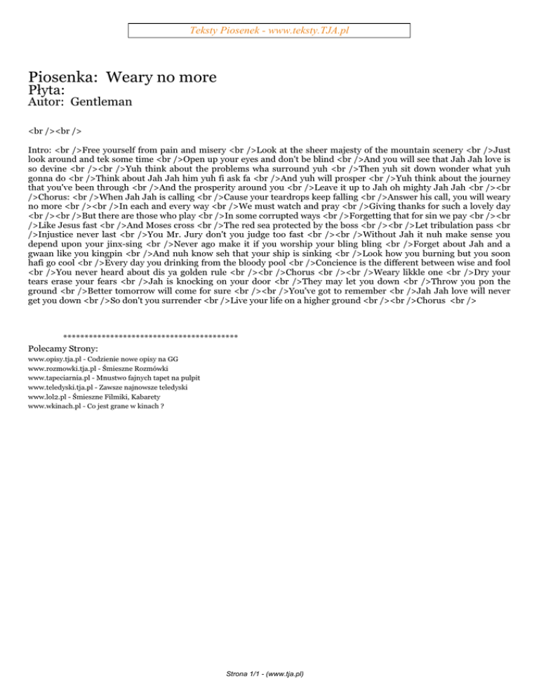 Teksty Piosenek - www.teksty.TJA.pl Piosenka: Weary no more Płyta: Autor: Gentleman <br /><br /> Intro: <br />Free yourself from pain and misery <br />Look at the sheer majesty of the mountain scenery <br />Just look around and tek some time <br />Open up your eyes and don't be blind <br />And you will see that Jah Jah love is so devine <br /><br />Yuh think about the problems wha surround yuh <br />Then yuh sit down wonder what yuh gonna do <br />Think about Jah Jah him yuh fi ask fa <br />And yuh will prosper <br />Yuh think about the journey that you've been through <br />And the prosperity around you <br />Leave it up to Jah oh mighty Jah Jah <br /><br />Chorus: <br />When Jah Jah is calling <br />Cause your teardrops keep falling <br />Answer his call, you will weary no more <br /><br />In each and every way <br />We must watch and pray <br />Giving thanks for such a lovely day <br /><br />But there are those who play <br />In some corrupted ways <br />Forgetting that for sin we pay <br /><br />Like Jesus fast <br />And Moses cross <br />The red sea protected by the boss <br /><br />Let tribulation pass <br />Injustice never last <br />You Mr. Jury don't you judge too fast <br /><br />Without Jah it nuh make sense you depend upon your jinx-sing <br />Never ago make it if you worship your bling bling <br />Forget about Jah and a gwaan like you kingpin <br />And nuh know seh that your ship is sinking <br />Look how you burning but you soon hafi go cool <br />Every day you drinking from the bloody pool <br />Concience is the different between wise and fool <br />You never heard about dis ya golden rule <br /><br />Chorus <br /><br />Weary likkle one <br />Dry your tears erase your fears <br />Jah is knocking on your door <br />They may let you down <br />Throw you pon the ground <br />Better tomorrow will come for sure <br /><br />You've got to remember <br />Jah Jah love will never get you down <br />So don't you surrender <br />Live your life on a higher ground <br /><br />Chorus <br /> ***************************************** Polecamy Strony: www.opisy.tja.pl - Codzienie nowe opisy na GG www.rozmowki.tja.pl - Śmieszne Rozmówki www.tapeciarnia.pl - Mnustwo fajnych tapet na pulpit www.teledyski.tja.pl - Zawsze najnowsze teledyski www.lol2.pl - Śmieszne Filmiki, Kabarety www.wkinach.pl - Co jest grane w kinach ? Strona 1/1 - (www.tja.pl)
