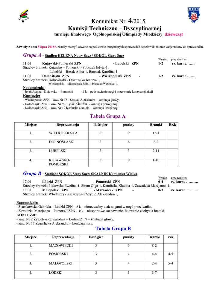 Komunikat Nr. 4/2015 Komisji Techniczno – Dyscyplinarnej turnieju finałowego Ogólnopolskiej Olimpiady Młodzieży dziewcząt Zawody z dnia 8 lipca 2015r. zostały zweryfikowane na podstawie otrzymanych sprawozdań sędziowskich oraz załączników do sprawozdań. Grupa A - Stadion HELENA Nowy Sącz / SOKÓŁ Stary Sącz Wynik: 11.00 Kujawski-Pomorski ZPN - Lubelski ZPN Strzelcy bramek: Kujawko – Pomorski - Sobczyk Edyta-1, Lubelski – Bosak Anita-1, Barczak Karolina-1, 11.00 Dolnośląski ZPN - Wielkopolski ZPN Strzelcy bramek: Dolnośląski - Olszewska Joanna-1, przy remisie : 1-2 rz. karne…….. 1-2 rz. karne ……. Wielkopolski – Mikołajczak Julia-1, Piasecka Weronika-1, Napomnienia : - Jeleń Joanna - Kujawsko – Pomorski - ż k - podstawienie nogi i przerwanie korzystnej akcji Kontuzje: - Wielkopolski ZPN – zaw. Nr 18 - Stasiak Aleksandra – kontuzja głowy, - Dolnośląski ZPN – zaw. Nr 9 – Tylak Klaudia - kontuzja prawej nogi, - Dolnośląski ZPN – zaw. Nr 12 Kosińska Daniela – kontuzja lewej nogi Tabela Grupa A Miejsce Reprezentacja Ilość gier punkty Bramki 1. WIELKOPOLSKA 3 9 15-1 2. DOLNOŚLASKI 3 6 6-2 3. LUBELSKI 3 3 2-11 4. KUJAWSKOPOMORSKI 3 0 1-10 Rz.k Grupa B - Stadion; SOKÓŁ Stary Sącz/ SKALNIK Kamionka Wielka: Wynik: przy remisie : 17.00 Łódzki ZPN - Pomorski ZPN 0-4 rz. karne ………. Strzelcy bramek: Pielowska Ewelina-1, Sirant Olga-1, Kamińska Klaudia-1, Zawadzka Marcjanna-1, 17.00 Małopolski ZPN - Mazowiecki ZPN 0-3 rz. karne ………. Strzelcy bramek: Włodarczyk Katarzyna-2,Szydło Aleksandra-1, Napomnienia: - Steczkowska Gabriela – Łódzki ZPN – ż k – nierozważny atak nogami w nogi przeciwnika, - Zawadzka Marcjanna – Pomorski ZPN – ż k – niesportowe zachowanie, fetowanie zdobycia bramki, KONTUZJE: - zaw. Nr 2 Żygielewicz Karolina – Łódzki ZPN – kontuzja głowy, - zaw. Nr 17 Zegarlicka Aleksandra – kontuzja nosa, Tabela Grupa B Miejsce Reprezentacja Ilość gier punkty Bramki rzk 1. MAZOWIECKI 3 6 8-2 2. POMORSKI 3 4 4-4 4-5 3. MAŁOPOLSKI 3 4 2-4 5-4 4. ŁÓDZKI 3 3 3-7 MECZE PÓŁFINAŁOWE W DNIU 09.07.2015 R.: MECZ: I. II. III IV 11.00 Helena 11.00 Barciczanka 17.00 Sokół 17.00 Barciczanka LUBELSKI ZPN ( zielono-czarne) MAŁOPOLSKI ZPN WIELKOPOLSKI ZPN ( biało-czarne) MAZOWIECKI ( czerwone ) - ŁÓDZKI ZPN (niebiesko-żółte ) - Kujawsko – Pomorski ZPN ( białe ) - POMORSKI ( czerwone ) - DOLNOŚLĄSKI ZPN(żółto- czarne ) III. KLASYFIKACJA O TYTUŁ KRÓLA STRZELCÓW: LP. 1-4 5-9 10-30 NAZWISKO Marszewska Mikołajczak Olszewska Włodarczyk Witczak Fil Olszewska Tylak Szydło Kucharska Szmatuła Krzykoś Sikorska Nogalska Węcławek Sowalska Marszewska Olszewska Miłek Pietrzyk Wójcik Osińska Jedzińska Pielowska Girant Kamińska Zawadzka Bosak Barczak Sobczak IMIĘ Wiktoria Julia Joanna Katarzyna Aleksandra Marta Joanna Karolina Aleksandra Agata Weronika Alicja Faustyna Klaudia Joanna Weronika Wiktoria Joanna Klaudia Wiktoria Weronika Maja Klaudia Ewelina Olga Klaudia Marcjanna Anita Karolina Karolina ZPN Wielkopolski Wielkopolski Dolnośląski Mazowiecki Wielkopolski Wielkopolski Dolnośląski Dolnośląski Mazowiecki Mazowiecki Wielkopolski Wielkopolski Wielkopolski Wielkopolski Wielkopolski Wielkopolski Wielkopolski Dolnośląski Dolnośląski Małopolski Małopolski Łódzki Łódzki Pomorski Pomorski Pomorski Pomorski Lubelski Lubelski Kuj. – Pomorski ILOŚĆ BRAMEK 3 3 3 3 2 2 2 2 2 1 1 1 1 1 1 1 1 1 1 1 1 1 1 1 1 1 1 1 1 1 IV REJESTR Ż K: Nazwisko Hossa Jeleń Turowska Zawadzka Rogalska Kucharska Trytek Węglarz Deruś Steczkowska Piasecka Imię Weronika Joanna Armanda Marcjanna Patrycja Agata Katarzyna Zuzanna Agnieszka Gabriela Weronika ZNP Kujawsko-Pomorski Kujawsko – Pomorski Pomorski Pomorski Mazowiecki Mazowiecki Małopolski Małopolski Małopolski Łódzki Wielkopolski 5.07 1-żk Brak 1-żk Brak Brak Brak Brak Brak Brak Brak Brak 6.07 Brak Brak Brak Brak 1-2 -żk 1-żk 1-żk 1-żk 1-żk Brak Brak 8.07 9.07 11.07 Brak 1-żk Brak 1-ż k Brak Brak Brak Brak Brak 1-ż k 1-ż k Przewodniczący Komisji Techniczno-Dyscyplinarnej Jerzy Gawarkiewicz
