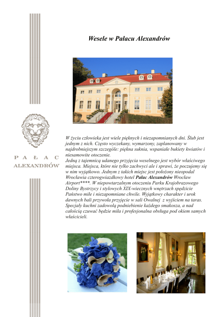 Wesele w Pałacu Alexandrów W życiu człowieka jest wiele pięknych i niezapomnianych dni. Ślub jest jednym z nich. Często wyczekany, wymarzony, zaplanowany w najdrobniejszym szczególe: piękna suknia, wspaniałe bukiety kwiatów i niesamowite otoczenie. Jedną z tajemnicą udanego przyjęcia weselnego jest wybór właściwego miejsca. Miejsca, które nie tylko zachwyci ale i sprawi, że poczujemy się w nim wyjątkowo. Jednym z takich miejsc jest położony nieopodal Wrocławia czterogwiazdkowy hotel Pałac Alexandrów Wrocław Airport****. W niepowtarzalnym otoczeniu Parku Krajobrazowego Doliny Bystrzycy i stylowych XIX-wiecznych wnętrzach spędzicie Państwo miłe i niezapomniane chwile. Wyjątkowy charakter i urok dawnych bali przywoła przyjęcie w sali Owalnej z wyjściem na taras. Specjały kuchni zadowolą podniebienie każdego smakosza, a nad całością czuwać będzie miła i profesjonalna obsługa pod okiem samych właścicieli. Propozycja menu I Przystawka Marynowane grillowane warzywa sezonowe Zupy Krem brokułowy z pieczonymi migdałami lub Rosół drobiowy z makaronem i warzywami Dania główne Sznycel wieprzowy z serem i szynką Filet z kurczaka w puszystym sosie pieczarkowym Pieczeń wieprzowa z karczku w sosie tymiankowym Ziemniaki gotowane z masłem koperkowym Kluski śląskie Warzywa ogrodowe Wybór surówek Zimne przekąski Filet z indyka z musem awokado Pieczeń wieprzowa przekładana warzywami Galaretka drobiowa z groszkiem zielonym Pasztet z drobiowych wątróbek i konfiturą jabłkową Śledzie à la Matias w oleju i ziołach Mięsa na zimna pieczone w pałacu Jajka faszerowane musem i kawiorem z łososia Mieszana sałatka z sezonowych warzyw Sałatka jarzynowa Wybór pikli Pieczywo mieszane Dania gorące Węgierska zupa gulaszowa z ziemniakami i papryką lub Barszcz czerwony z pasztecikami z ciasta francuskiego Bufet Kawowo-herbaciany Ciasta pałacowego wypieku (dwa rodzaje, np. jabłecznik, biszkoptowe z owocami) Soki owocowe (jabłkowy/pomarańczowy) bez ograniczeń cena 240 zł/os. Propozycja menu II Przystawka Marynowane warzywa w ziołach i w oliwie z oliwek z wędzona szynka i małym bukietem sałat Zupa Bulion drobiowy z domowym makaronem i warzywami jukienne lub Zupa grzybowa z makaronem Dania główne Pierś z kurczaka nadziewana serem mozzarella i pomidorem Polędwiczki wieprzowe w sosie grzybowym Zrazy wołowe w sosie Ziemniaki gotowane z masłem koperkowym Kolorowy ryż z warzywamy Kluski śląskie Warzywa ogrodowe Wybór surówek Zimne przekąski Mięsa na zimna pieczone w pałacu Pasztet z drobiu z sosem żurawinowym Wybór polskich kiełbas, (k. myśliwska, jałowcowa, kabanos) Wybór serów Śledź w sosie jogurtowym z jabłkami i cebulka Sałatka śledziowa w buraczkach Galaretka z nóżek wieprzowych Wybór pikli Pieczywo mieszane Sałatki Sałatka grecka z serem koneckim Sałatka ziemniaczana z sosem jogurtowym Dania gorące Barszczyk czerwony z pasztecikiem francuskim Potrawa à la Stroganow (drobiowy lub wieprzowy) z papryką i pieczarkami Bufet Kawowo-herbaciany Ciasta pałacowego wypieku ( dwa rodzaje, np. jabłecznik, biszkoptowe z owocami) Soki owocowe (jabłkowy/pomarańczowy) bez ograniczeń cena 270 zł /os Dodatkowo proponujemy Bufety tematyczne w formie : - Stołu wiejskiego- myśliwskiego – od 4000 zł - Stołu rybnego- wegetariańskiego – od 3500 zł - Stołu deserowego – od 3500 zł - Płonący udziec / prosię faszerowane kaszą 100zł/kg - Bufet alkoholowy – cena do ustalenia Dodatkowe możliwości: Wynajem sali (w przypadku rezerwacji poniżej 50 osób) Sala Langhansa - 2500 zł Sala Owalna i taras – 3500zł Oprawa muzyczna od - 3000zł Dekoracja stołów ziołami 100zł/10 os Barman – 600zł Czerwony dywan – 400 zł Wino musujące na powitanie gości od 8 zł / os Opłata serwisowa za wniesiony alkohol od butelki – 15 zł Oplata serwisowa od ciasta i tortów( z wyjątkiem weselnego) – 8 zł / os Wódka ,, Pałacowa '' lub podobna 0,5l - cena 44 zł / but. Wino wytrawne ( czerwone, białe 0,75 l )- 49 zł / but. Pakiet napoi gazowanych ( Sprite, Fanta, Coca – Cola) b/o 14 zł/os Stoły okrągłe 160 zł – od stołu Ceny menu zostały skalkulowane dla min 50 gości. Przy mniejszej liczby gości ceny mogą ulec zmiany. Poprawiny w formie grilla od – 120/ zł od osoby Warunki rezerwacji terminów Przyjęcia Weselnego : Potwierdzenie rezerwacji zostanie przyjęte po dokonaniu wpłaty wysokosci 20% zaliczki (min 3000 zł) Miesiąc przed przyjęciem weselnym należy wpłacić zaliczkę do wysokosci 90% . Pozostała częsć kosztów za organizacje przyjęcia weselnego zostanie rozliczona w dniu po weselu. Ostateczną liczbęę osób oraz menu należy potwierdzić 14 dni przed przyjęciem weselnym Hotel: Do dyspozycji Panstwa oddajemy do 50 miejsc noclegowych w cenach 230 zł – za pokój 2 osobowy oraz 170 zł – za pokój 1 osobowy typu Classic Pokój typu Junior Suite dla Pary Młodej gratis. Dodatkowe informacje: We wszystkich propozycjach wliczone w cenę menu są Kawa i herbata z ekspresu przelewowego bez ograniczeń Wody mineralne bez ograniczeń Powitanie Pary Młodej chlebem i solą Świeżo wypieczone pieczywo Obsługa kelnerska Dekorację i wystrój sal i stołów zaproponowanych przez Pałac Alexandrów. Dzieci w wieku 0-3 lat są liczone w cenie menu, od 3-10 lat 70% ceny menu Obsługa muzyczna ( fotograf, DJ lub zespół muzyczny, kamerzysta) – 70% ceny Możliwość wykonania bezpłatnej sesji zdjęciowej na terenie z wizerunkiem Pałacu Podane ceny zawierają podatek VAT. Zapraszamy do kontaktu tel. 71-373 12 34 email: [email protected]