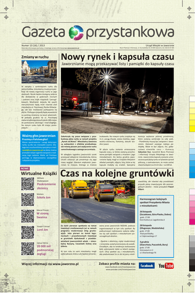 Gazeta przystankowa Urząd Miejski w Jaworznie Numer 13 (16) / 2013 Materiały informacyjne pochodzą z miejskiego serwisu informacyjnego www.jaworzno.pl Zmiany w ruchu Biuro Promocji i Informacji, ul. Grunwaldzka 33, 43-600 Jaworzno, tel. (32) 61 81 585 Nowy rynek i kapsuła czasu Jaworznianie mogą przekazywać listy i pamiątki do kapsuły czasu W związku z zamknięciem rynku dla samochodów, mieszkańcy muszą przywyknąć do nowej organizacji ruchu w jego okolicach. Rynek będzie dostępny jedynie dla dostawców w godzinach nocnych i rankiem oraz służb miejskich i porządkowych. Możliwość dojazdu do swych nieruchomości będą mieli również stali mieszkańcy ul. Pocztowej i Rynku Głównego, ale bez możliwości parkowania na płycie. Parkujące pojazdy będą wywożone na parking strzeżony na koszt właścicieli. W połowie grudnia na ul. Pocztowej zostanie udostępnionych około 100 miejsc do parkowania ukośnego i równoległego. Na starym rynku było 40 miejsc postojowych. Ważny głos jaworznian Prosimy o Państwa głos! Wasze spostrzeżenia i uwagi dotyczące rynku są dla nas niezwykle ważne. Dlatego też uruchomiliśmy specjalny e-mail: [email protected] na który można przesyłać swoje sugestie związane z realizacją tego zadania. Maile od Państwa pomogą w dopracowaniu szczegółów i ulepszeniu projektu. NOWE Wirtualne Książki William Shakespeare Zakończyły się prace związane z przebudową płyty rynku w ramach projektu „Rynek od.Nowa”. Mieszkańcy Jaworzna są zadowoleni z efektów przebudowy. Jak mówią plusem jest wyłączenie ruchu samochodowego z samego serca miasta. W ubiegłym tygodniu jaworznicki rynek przeżywał oblężenie mieszkańców, którzy chcieli zobaczyć jak prezentuje się jego nowy wygląd. Zdaniem większości jaworznian to miejsce, którego w mieście brakowało. Na nowym rynku znajduje się m.in. posąg drwala, wieża mediów, zegar wodno-słoneczny, fontanny, skoczki wodne i jawor. W płycie rynku zostanie umieszczona kapsuła czasu, w której zostaną przechowane pamiątki związane z miastem i jego mieszkańcami. Do końca grudnia jaworznianie będą mogli w Urzędzie Miejskim składać pamiątki, zdjęcia, listy, które w tej kapsule miałyby się znaleźć. Specjalna komisja wybierze później przedmioty, które zostaną zamknięte na cały wiek. - Przedmioty muszą być związane z Jaworznem. Stanowić swojego rodzaju pamiątkę. Może to być zdjęcie, list, gabarytowo niewielka rzecz – tłumaczy Sebastian Kuś, naczelnik Biura Promocji i Informacji Urzędu Miejskiego w Jaworznie. Jaworznicka kapsuła zostanie umieszczona pod płytą rynku w Sylwestra przed północą, z zastrzeżeniem, że może zostać otwarta dopiero w 2113 roku – za 100 lat. Czas na kolejne gruntówki zowaliśmy, ale również aby przedstawić przyszłe plany inwestycyjne dla poszczególnych dzielnic - mówi prezydent Paweł Silbert. Poskromienie złośnicy Moliere Szkoła żon Harmonogram kolejnych spotkań Prezydenta Miasta z mieszkańcami: Marcel Proust 26 listopada (Szczakowa, Góra Piasku, Dobra) W stronę Swanna Joseph Conrad Lord Jim Juliusz Verne 20 000 mil podmorskiej żeglugi godz. 17:00 Dom Kultury ul. Jagiellońska 3 Za nami pierwsze spotkania na temat inwestycji zrealizowanych już w ramach programu modernizacji dróg gruntowych. Jako pierwsi na temat tegorocznych i przyszłorocznych inwestycji w gruntówki dyskutowali z przedstawicielami jaworznickich władz – mieszkańcy Byczyny, Cezarówki Dolnej oraz Jelenia. W tym roku to sami mieszkańcy mogli zadecydować, która z ulic będzie remonto- wana przez jaworznicki MZDiM, podczas organizowanych w tym celu spotkań. By podsumować realizowane zadania odbywa się cykl spotkań z mieszkańcami poszczególnych dzielnic. - Zgodnie z obietnicą, ciężar modernizacji i remontów został przeniesiony do osiedli. Chciałbym, aby ta tendencja realizowana była sukcesywnie także w latach następnych. Chcę spotkać się z mieszkańcami, aby podsumować to co do tej pory zreali- 28 listopada (Długoszyn, Niedzieliska) godz. 17:00 Klub pod Skałką ul. Dąbrowskiego 17 3 grudnia (Stara Huta, Pszczelnik, Bory) godz. 17:00 Gimnazjum nr 2 ul. Olszewskiego 76 㤵 㜵 ㈵ Więcej informacji na www.jaworzno.pl Zobacz profile miasta na: 㔀 www.facebook.com/miastojaworzno www.youtube.com/miastojaworzno