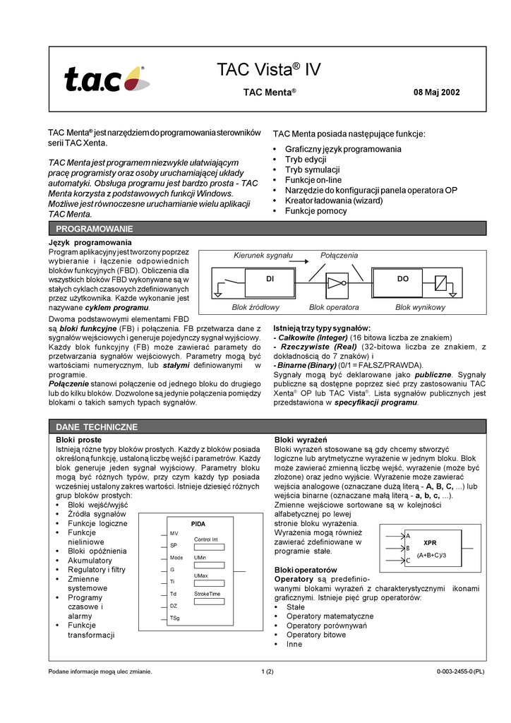 TAC Vista® IV TAC Menta® TAC Menta® jest narzêdziem do programowania sterowników serii TAC Xenta. TAC Menta jest programem niezwykle u³atwiaj¹cym pracê programisty oraz osoby uruchamiaj¹cej uk³ady automatyki. Obs³uga programu jest bardzo prosta - TAC Menta korzysta z podstawowych funkcji Windows. Mo¿liwe jest równoczesne uruchamianie wielu aplikacji TAC Menta. 08 Maj 2002 TAC Menta posiada nastêpuj¹ce funkcje: Graficzny jêzyk programowania Tryb edycji Tryb symulacji Funkcje on-line Narzêdzie do konfiguracji panela operatora OP Kreator ³adowania (wizard) Funkcje pomocy PROGRAMOWANIE Jêzyk programowania Program aplikacyjny jest tworzony poprzez wybieranie i ³¹czenie odpowiednich bloków funkcyjnych (FBD). Obliczenia dla wszystkich bloków FBD wykonywane s¹ w sta³ych cyklach czasowych zdefiniowanych przez u¿ytkownika. Ka¿de wykonanie jest nazywane cyklem programu. Kierunek sygna³u Po³¹czenia DI DO Blok ród³owy Dwoma podstawowymi elementami FBD s¹ bloki funkcyjne (FB) i po³¹czenia. FB przetwarza dane z sygna³ów wejciowych i generuje pojedynczy sygna³ wyjciowy. Ka¿dy blok funkcyjny (FB) mo¿e zawieraæ paramety do przetwarzania sygna³ów wejciowych. Parametry mog¹ byæ wartociami numerycznym, lub sta³ymi definiowanymi w programie. Po³¹czenie stanowi po³¹czenie od jednego bloku do drugiego lub do kilku bloków. Dozwolone s¹ jedynie po³¹czenia pomiêdzy blokami o takich samych typach sygna³ów. Blok operatora Blok wynikowy Istniej¹ trzy typy sygna³ów: - Ca³kowite (Integer) (16 bitowa liczba ze znakiem) - Rzeczywiste (Real) (32-bitowa liczba ze znakiem, z dok³adnoci¹ do 7 znaków) i - Binarne (Binary) (0/1 = FA£SZ/PRAWDA). Sygna³y mog¹ byæ deklarowane jako publiczne. Sygna³y publiczne s¹ dostêpne poprzez sieæ przy zastosowaniu TAC Xenta® OP lub TAC Vista®. Lista sygna³ów publicznych jest przedstawiona w specyfikacji programu. DANE TECHNICZNE Bloki wyra¿eñ Bloki wyra¿eñ stosowane s¹ gdy chcemy stworzyæ logiczne lub arytmetyczne wyra¿enie w jednym bloku. Blok mo¿e zawieraæ zmienn¹ liczbê wejæ, wyra¿enie (mo¿e byæ z³o¿one) oraz jedno wyjcie. Wyra¿enie mo¿e zawieraæ wejcia analogowe (oznaczane du¿¹ liter¹ - A, B, C, ...) lub wejcia binarne (oznaczane ma³¹ liter¹ - a, b, c, ...). Zmienne wejciowe sortowane s¹ w kolejnoci alfabetycznej po lewej stronie bloku wyra¿enia. Wyra¿enia mog¹ równie¿ $ zawieraæ zdefiniowane w ;35 % programie sta³e. $%& Bloki proste Istniej¹ ró¿ne typy bloków prostych. Ka¿dy z bloków posiada okrelon¹ funkcjê, ustalon¹ liczbê wejæ i parametrów. Ka¿dy blok generuje jeden sygna³ wyjciowy. Parametry bloku mog¹ byæ ró¿nych typów, przy czym ka¿dy typ posiada wczeniej ustalony zakres wartoci. Istnieje dziesiêæ ró¿nych grup bloków prostych: Bloki wejæ/wyjæ ród³a sygna³ów Funkcje logiczne 3,'$ Funkcje nieliniowe Bloki opónienia Akumulatory Regulatory i filtry Zmienne systemowe Programy czasowe i alarmy Funkcje transformacji 09 &RQWURO,QW 63 0RGH & 80LQ Bloki operatorów Operatory s¹ predefiniowanymi blokami wyra¿eñ z charakterystycznymi graficznymi. Istnieje piêæ grup operatorów: Sta³e Operatory matematyczne Operatory porównywañ Operatory bitowe Inne * 80D[ 7L 7G 6WURNH7LPH '= 76J Podane informacje mog¹ ulec zmianie. 1 (2) ikonami 0-003-2455-0 (PL) TRYBY PRACY Tryb edycji (Edit Mode) G³ówne okno trybu edycji TAC Menta sk³ada siê z pojedynczego okna schematu z dwoma paskami przewijania, gdzie bêd¹ wywietlone bloki funkcyjne. Programista tworzy program FBD przy pomocy myszy, klawiszy funkcyjnych, rozwijanychmenu, poprzez umieszczanie bloków funkcyjnych w oknie schematu i rysowaniu po³¹czeñ pomiêdzy blokami funkcyjnymi. Ka¿dy plik FBD mo¿e mieæ do³¹czony plik tekstowy o tej samej nazwie. Edytor tekstu wybierany jest przez u¿ytkownika. Plik tekstowy mo¿e byæ stosowany do opisu funkcji programu. Tryb on-line (po³¹czenia ze sterownikiem) Tryb on-line TAC Menta jest stosowany do ³adowania i i uruchamiania programu aplikacyjnego. U¿ytkownik mo¿e odczytywaæ i zmieniaæ dynamicznie aktualizowane wartoci sygna³u w trakcie wykonywania programu aplikacjnego przez sterownik TAC Xenta. Programy czasowe mog¹ byæ pobierane, zmieniane i z powrotem wysy³ane do sterownika. Tryb demo TAC Menta mo¿e pracowaæ bez licencji w trybie demo. Tryb demo umo¿liwia u¿ytkownikowi wypróbowanie wszystkich funkcji programu (takich jak: zapamiêtywanie, symulacje, edycje). Jednak¿e aplikacja mo¿e byæ zapamiêtana jedynie jako aplikacja demo. Oznacza to, ¿e nie bêdzie mo¿liwe za³adowanie aplikacji do jakiegokolwiek sterownika TAC Xenta. Aplikacja demo mo¿e byæ otwarta w licencjonowanym programie TAC Menta, ale nie mo¿e byæ przekonwertowana na wersjê daj¹c¹ siê wgraæ do sterownika. Tryb symulacji (Simulation Mode) W trybie symulacji okno aplikacji posiada dwa podokna, okno schematu i okno rejestrów. Okno schematu wywietla bloki FBD albo tabelê ze wszystkimi publicznymi sygna³ami i parametrami. W trybie symulacji program aplikacyjny mo¿e byæ wykonywany w sposób ci¹g³y, krokowo - co jeden cykl lub w okrelonej liczbie cykli. Podczas symulacji, mo¿na obserwowaæ zmieniaj¹ce siê wartoci sygna³ów. Mo¿na zmieniaæ wartoci sygna³ów, symulowaæ stan wejæ fizycznych oraz rejestrowaæ sygna³y na wykresie w oknie rejestracji. NARZÊDZIA Narzêdzie konfiguracyjne panelu operatora (OP) Narzêdzie konfiguracyjne OP jest stosowane do tworzenia wywietlacza panelu operatora (OP). Ekran panela OP zawiera 4x20 znaków. Panel OP daje operatorowi dostêp do statusów, alarmów i parametrów instalacji. Menu na wywietlaczu ma strukturê drzewa, które mo¿e byæ ró¿ne dla ka¿dego sterownika. W TAC Xenta 280 mo¿na wywietliæ jedynie standardowe drzewo OP. Narzêdzie do konfiguracji OP umo¿liwia rêczne tworzenie menu lub zaimportowanie gotowego menu z pliku tekstowego (DOP). Gdy narzêdzie do konfiguracji OP jest wywo³ywane z okna edycj