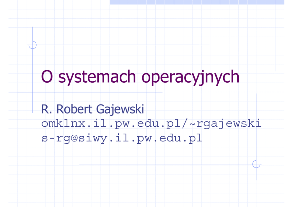 O systemach operacyjnych R. Robert Gajewski omklnx.il.pw.edu.pl/~rgajewski [email protected] CP/M Zdecydowanym standardem światowym wśród komputerów 8_bitowych był i jest system operacyjny CP/M (Control Program for Microprocessors) opracowany w 1973 przez firmę Intel. Może on współpracować z pamięcią RAM do 16kB!!! Łatwy do zaadaptowania dla wielu typów i konfiguracji mikrokomputerów dzięki modułowi BIOS (Basic Input/Output System). Składa się z 3 grup programów: 2•09 startu i wznowienia działania (restartu) systemu, transmisji pojedynczego znaku, wejścia i wyjścia dyskowego. © 2001, R. Robert Gajewski Miłe złego poczatki CCP (Console Command Processing) zapewnia łączność operatora z systemem operacyjnym. Umożliwia on czytanie, interpretację i wykonywanie dyrektyw systemu oraz ładowanie i wykonywanie programów użytkowych. W systemie CP/M wyróżnia się dwa typy dyrektyw: 3•09 rezydentne, znajdujące się w rezydentnej części systemu operacyjnego, wykonywane bez odwołania się do dysku, nierezydentne, wykonywanie których wymaga odwołania się do dyskietki. © 2001, R. Robert Gajewski Wzorzec DOS’u Sterowanie plikami jest niezależne od fizycznych urządzeń wejścia/wyjścia i jest zgrupowane w BDOS (Basic Disc Operating System) umożliwiającym zarządzanie zasobami dyskowymi poprzez dynamiczne rozmieszczenie plików i organizację dostępu do nich. Pamięć operacyjna RAM podzielona jest na następujące obszary 4•09 obszar obszar BDOS, obszar obszar podstawowego systemy wejścia/wyjścia BIOS, zajęty przez podstawowy system dyskowy przetwarzania dyrektyw operatora CCP, TPA (Transient Program Area) dla programów. © 2001, R. Robert Gajewski Projekt DOS’u CP/M stanowił wzorzec dla systemu DOS. DOS został zaprojektowany do prostej i podstawowej obsługi mikrokomputera z jednym miejscem pracy, na którym w danej chwili pracuje zawsze jeden program. 5•09 program ten jest przyporządkowany jednemu użytkownikowi (single user), który przetwarza zawsze jedno zadanie (single task). © 2001, R. Robert Gajewski Struktura DOS’u DOS nieco rozrzutnie udostępnia całe zasoby mikrokomputera jednemu użytkownikowi, ale dzięki temu ma prosta i nieskomplikowaną budowę. 6•09 Do wprowadzania poleceń służy prosty system obsługi (shell). Niektórzy twierdzą, że DOS nie jest „prawdziwym” systemem operacyjnym tylko systemem ładowania i uruchamiania programów. Według nich system operacyjny zaczyna się tam, gdzie pojawia się „walka” procesów o zasoby. © 2001, R. Robert Gajewski Proces i środowisko Proces jest obiektem dynamicznym składającym się z: programu, określającego ciąg wykonywanych instrukcji otoczenia, zbioru obiektów (zasobów) dostępnych dla procesu zarówno fizycznie (PAO) jak i logicznie (pliki, urządzenia). Środowisko to część otoczenia, zbiór symboli i przypisanych im tekstów, którymi są najczęściej nazwy plików i katalogów. W systemie DOS w każdej chwili aktywny jest dokładnie tylko jeden proces zabiegający o czas i zasoby procesora. 7•09 © 2001, R. Robert Gajewski Środowisko DOS’u DOS musi pracować na sprzęcie wyposażonym w procesor Intela 80*86 o podobnej do wzorcowej architekturze. Istniejące rozwiązania tego problemu to sprzętowe bądź programowe emulatory symulujące architekturę i środowisko IBM PC. Siłą DOS’u jest olbrzymia ilość oprogramowania. 8•09 © 2001, R. Robert Gajewski OS/2 - podstawy OS/2 (Operating System 2) przeznaczony był przede wszystkim dla nowej serii mikrokomputerów PS/2 (Personal System 2) firmy IBM. Najważniejsze cechy to: możliwość wykonywania jednocześnie wielu aplikacji, zgodność ze standardowymi aplikacjami DOS’u. Oprócz możliwości dzielenia czasu system oferuje możliwość pracy równoległej przez mechanizm wątków (threat). 9•09 © 2001, R. Robert Gajewski OS/2 - wieloprogramowość OS/2 - równoczesne uruchamianie wielu programów. 10•09 Zadanie podzielone na podzadania - procesy (process, task). Zegar systemu przerywa w jednakowych odcinkach czasu działanie CPU i oblicza nowe priorytety tak, by wznowione zostało przetwarzanie następnego procesu z listy procesów oczekujących. Każdy proces otrzymuje jednostkę czasu CPU, tylko wtedy wykonuje się. © 2001, R. Robert Gajewski OS/2 - komunikacja OS/2 jest znacznie lepiej przygotowany do komunikacji między komputerami niż DOS. Zadanie to realizuje podsystem LAN-Manager (Local Area Network). Niestety nie jest w nim zapewniona przezroczystość sieci ani bezpieczeństwo danych. 11•09 © 2001, R. Robert Gajewski OS/2 - pliki System organizacji plików HPFS (High Performance File System) przypominający system plików UNIX’a oznacza się dużą szybkością - zastąpił znany z DOS’u FAT. Komunikację z użytkownikiem zapewnia podsystem PM (Presentation Manager), standardowa graficzna platforma użytkownika. Pracę z systemem ułatwia podobny do hipertekstu system podpowiedzi IPF (Information Prresentation Facility). 12•09 © 2001, R. Robert Gajewski UNIX (Linux) UNIX (Linux) jest systemem operacyjnym: wielodostępnym (Multi User) wielozadaniowym (Multi Tasking) Na tej samej maszynie, w tym samym czasie może pracować wielu użytkowników dzieląc zasoby komputera. Daje to obniżenie kosztów eksploatacji i optymalne wykorzystanie. 13•09 © 2001, R. Robert Gajewski Windows 1.0/2.0 Zapowiadany na 1983 rok system pojawił się w listopadzie 1985 w wersji 1.0, a w grudniu 1989 w wersji 2.0. Okna miały tę sama wielkość i nie mogły na siebie zachodzić. W wersji 2.1 dodano opcję dynamicznej wymiany danych (Dynamic Data Exchange) – DDE 14•09 © 2001, R. Robert Gajewski Windows 3.0 System narodził się w maju 1990. Usprawniono mechanizmy posługiwania się oknami. Praca z plikami odbywa się w sposób graficzny. System potrafi współpracować z siecią. 15•09 © 2001, R. Robert Gajewski Windows 3.1 Narodziny w kwietniu 1992. Poprawiono czcion