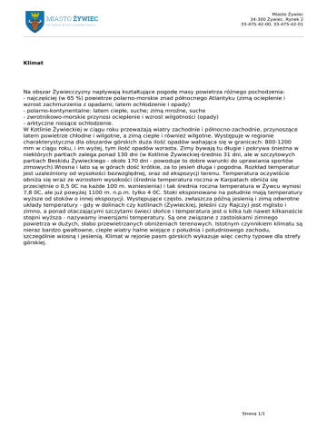 Miasto Żywiec 34-300 Żywiec, Rynek 2 33-475-42-00, 33-475-42-01 Klimat Na obszar Żywiecczyzny napływają kształtujące pogodę masy powietrza różnego pochodzenia: - najczęściej (w 65 %) powietrze polarno-morskie znad północnego Atlantyku (zimą ocieplenie i wzrost zachmurzenia z opadami; latem ochłodzenie i opady) - polarno-kontynentalne: latem ciepłe, suche; zimą mroźne, suche - zwrotnikowo-morskie przynosi ocieplenie i wzrost wilgotności (opady) - arktyczne niosące ochłodzenie. W Kotlinie Żywieckiej w ciągu roku przeważają wiatry zachodnie i północno-zachodnie, przynoszące latem powietrze chłodne i wilgotne, a zimą ciepłe i również wilgotne. Występuje w regionie charakterystyczna dla obszarów górskich duża ilość opadów wahająca się w granicach: 800-1200 mm w ciągu roku, i im wyżej, tym ilość opadów wzrasta. Zimy bywają tu długie i pokrywa śnieżna w niektórych partiach zalega ponad 130 dni (w Kotlinie Żywieckiej-średnio 31 dni, ale w szczytowych partiach Beskidu Żywieckiego - około 170 dni - powoduje to dobre warunki do uprawiania sportów zimowych).Wiosna i lato są w górach dość krótkie, za to jesień długa i pogodna. Rozkład temperatur jest uzależniony od wysokości bezwzględnej, oraz od ekspozycji terenu. Temperatura oczywiście obniża się wraz ze wzrostem wysokości (średnia temperatura roczna w Karpatach obniża się przeciętnie o 0,5 0C na każde 100 m. wzniesienia) i tak średnia roczna temperatura w Żywcu wynosi 7,8 0C, ale już powyżej 1100 m. n.p.m. tylko 4 0C. Stoki eksponowane na południe mają temperatury wyższe od stoków o innej ekspozycji. Występujące często, zwłaszcza późną jesienią i zimą odwrotne układy temperatury - gdy w dolinach czy kotlinach (Żywieckiej, Jeleśni czy Rajczy) jest mglisto i zimno, a ponad otaczającymi szczytami świeci słońce i temperatura jest o kilka lub nawet kilkanaście stopni wyższa - nazywamy inwersjami temperatury. Są one związane z zastoiskami zimnego powietrza w dużych, słabo przewietrzanych obniżeniach terenowych. Istotnym czynnikiem klimatu są nieraz bardzo gwałtowne, ciepłe wiatry halne wiejące z południa i południowego zachodu, szczególnie wiosną i jesienią. Klimat w rejonie pasm górskich wykazuje więc cechy typowe dla strefy górskiej. Strona 1/1 Powered by TCPDF (www.tcpdf.org)