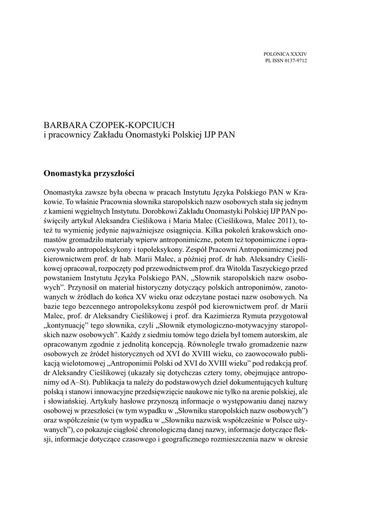 POLONICA XXXIV PL ISSN 0137-9712 BARBARA CZOPEK-KOPCIUCH i pracownicy Zakładu Onomastyki Polskiej IJP PAN Onomastyka przyszłości Onomastyka zawsze była obecna w pracach Instytutu Języka Polskiego PAN w Krakowie. To właśnie Pracownia słownika staropolskich nazw osobowych stała się jednym z kamieni węgielnych Instytutu. Dorobkowi Zakładu Onomastyki Polskiej IJP PAN poświęciły artykuł Aleksandra Cieślikowa i Maria Malec (Cieślikowa, Malec 2011), toteż tu wymienię jedynie najważniejsze osiągnięcia. Kilka pokoleń krakowskich onomastów gromadziło materiały wpierw antroponimiczne, potem też toponimiczne i opracowywało antropoleksykony i topoleksykony. Zespół Pracowni Antroponimicznej pod kierownictwem prof. dr hab. Marii Malec, a później prof. dr hab. Aleksandry Cieślikowej opracował, rozpoczęty pod przewodnictwem prof. dra Witolda Taszyckiego przed powstaniem Instytutu Języka Polskiego PAN, „Słownik staropolskich nazw osobowych”. Przynosił on materiał historyczny dotyczący polskich antroponimów, zanotowanych w źródłach do końca XV wieku oraz odczytane postaci nazw osobowych. Na bazie tego bezcennego antropoleksykonu zespół pod kierownictwem prof. dr Marii Malec, prof. dr Aleksandry Cieślikowej i prof. dra Kazimierza Rymuta przygotował „kontynuację” tego słownika, czyli „Słownik etymologiczno-motywacyjny staropolskich nazw osobowych”. Każdy z siedmiu tomów tego dzieła był tomem autorskim, ale opracowanym zgodnie z jednolitą koncepcją. Równolegle trwało gromadzenie nazw osobowych ze źródeł historycznych od XVI do XVIII wieku, co zaowocowało publikacją wielotomowej „Antroponimii Polski od XVI do XVIII wieku” pod redakcją prof. dr Aleksandry Cieślikowej (ukazały się dotychczas cztery tomy, obejmujące antroponimy od A–St). Publikacja ta należy do podstawowych dzieł dokumentujących kulturę polską i stanowi innowacyjne przedsięwzięcie naukowe nie tylko na arenie polskiej, ale i słowiańskiej. Artykuły hasłowe przynoszą informacje o występowaniu danej nazwy osobowej w przeszłości (w tym wypadku w „Słowniku staropolskich nazw osobowych”) oraz współcześnie (w tym wypadku w „Słowniku nazwisk współcześnie w Polsce używanych”), co pokazuje ciągłość chronologiczną danej nazwy, informacje dotyczące fleksji, informacje dotyczące czasowego i geograficznego rozmieszczenia nazw w okresie 168 Barbara Czopek-Kopciuch średniopolskim, pokazanie funkcjonowania nazw w kontekstach (z uwzględnieniem sygnałów dotyczących np. stabilności nazwiska, związków rodzinnych i statusu społecznego osób), informacje dotyczące frekwencji oraz kwalifikacji — nazwisko częste : nazwisko rzadkie. Ogromnie ważną część omawianej pracy stanowią wykazy nazwisk wraz z chronologią i geografią, pozwalające na wnioski dotyczące tworzenia się nazwiska rodzinnego w przekroju historycznym i geograficznym. To wyjątkowe dzieło stanowić też może bazę dalszych badań nad średniopolską antroponimią i ostatecznych syntez kategorialnych i uogólniających ujęć teoretycznych w obrębie onomastyki. Antropoleksykony dotyczące współczesności, przynoszące wykazy imion i nazwisk współcześnie w Polsce używanych wraz z frekwencją i geografią, zawdzięczamy Kazimierzowi Rymutowi. Mam tu na myśli „Słownik imion współcześnie w Polsce używanych”, „Słownik nazwisk współcześnie w Polsce używanych” i późniejsze CD z uaktualnionymi danymi statystycznymi i geograficznymi z początku XXI wieku oraz dwutomowy słownik „Nazwiska Polaków. Słownik etymologiczno-historyczny”, który pokazuje zarazem budowę i motywację nazwisk. Powstawały też prace o charakterze syntetycznym. Dotyczyły one poszczególnych subkategorii antroponimów, np. praca Marii Malec „Imię w polskiej antroponimii i kulturze”, „Imiona chrześcijańskie w średniowiecznej Polsce” oraz „O imionach i nazwiskach w Polsce”, praca Katarzyny Skowronek „Współczesne nazwisko polskie” ale i zagadnień gramatycznych, np. Marii Malec „Budowa morfologiczna staropolskich złożonych imion dwuczłonowych”, „Staropolskie skrócone nazwy osobowe od imion dwuczłonowych”, Aleksandry Cieślikowej „Derywacja paradygmatyczna w staropolskiej antroponimii”, „Staropolskie odapelatywne nazwy osobowe. Proces onimizacji”. Od chwili powstania Instytutu Języka Polskiego PAN z inicjatywy prof. dra Henryka Borka i przede wszystkim prof. dra Kazimierza Rymuta rozpoczęły się prace nad gromadzeniem materiału toponimicznego. Kilkuosobowy zespół zebrał materiały historyczne i współczesne dotyczące nazw miejscowych Polski, co pozwoliło w efekcie na publikację słownika „Nazwy miejscowe Polski. Historia. Pochodzenie. Zmiany” (ukazało się dotychczas IX tomów słownika A–Q). Na bazie tych materiałów powstawały monografie dotyczące nazewnictwa miejscowego poszczególnych regionów Polski, np. Urszuli Bijak „Nazwy miejscowe południowej części historycznego województwa mazowieckiego”, Urszuli Wójcik „Nazwy miejscowe historycznego województwa rawskiego”, Rozalii Przybytek, „Nazwy miejscowe pochodzenia bałtyckiego w południowej części Prus Wschodnich”, cząstkowe opracowania typu gramatycznego, np. Kazimierza Rymuta „Słowotwórstwo polskich patronimicznych nazw miejscowych z przyrostkiem *-(ov)itjona tle zachodniosłowiańskim”, prace poświęcone nazwom obcojęzycznym, np. Barbary Czopek-Kopciuch „Adaptacje niemieckich nazw miejscowych w języku polskim”, bardzo wiele artykułów poświęconych zagadnieniom teoretycznym, np. Kazimierza Rymuta „Granica czy strefa przejściowa między nomen appellativum a nomen proprium” czy „Apelatywy onimiczne i ich miejsce w systemie języka”. Drugim nurtem badań toponimicznych są prace dotyczące nazw wodnych. Powstała baza polskich hydronimów, która obecnie jest podstawą przygotowania elektronicznego Onomast