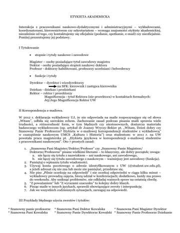 ETYKIETA AKADEMICKA Interakcja z pracownikami naukowo-dydaktycznymi i administracyjnymi – wykładowcami, koordynatorami, kierownictwem czy sekretariatem – wymaga znajomości etykiety akademickiej, niezależnie od tego, czy kontaktujemy się oficjalnie (podanie, spotkanie, e-mail) czy nieoficjalnie. Poniżej prezentujemy jej podstawy. I Tytułowanie stopnie i tytuły naukowe i zawodowe Magister – osoby posiadające tytuł zawodowy magistra Doktor - osoby posiadające stopień naukowy doktora Profesor - doktorzy habilitowani, profesorzy uczelniani i belwederscy funkcje i tytuły Dyrektor – dyrektor i wicedyrektorzy na SFK: kierownik i zastępca kierownika Dziekan - dziekan i prodziekani Rektor – rektor i prorektorzy Magnificencja - tytuł Rektora (nie prorektora) w kontaktach formalnych: Jej/Jego Magnificencja Rektor UW II Korespondencja e-mailowa. W 2012 r. deklaracja wykładowcy UJ, że nie odpowiada na maile rozpoczynające się od słowa „Witam”, odbiła się szerokim echem. Zachowanie zasad podczas pisania maili sprawia wiele trudności, a różnorodność form, w tym błędnych czy niestosownych, dostarcza materiału badawczego wykładowcom (np. artykuł dr Joanny Wryczy-Bekier pt. „Witam, Dzień dobry czy Szanowny Panie Profesorze? Etykieta w e-mailowej korespondencji studentów z wykładowcą” w czasopiśmie naukowym UMCS „Kultura i Historia”) oraz studentom: w 2011 r. na UW powstała praca magisterska pt. „Etykieta językowa w korespondencji e-mailowej studentów z pracownikami naukowymi”. Oto 7 prostych zasad: 1. „Szanowna Pani Magister/Doktor/Profesor” czy „Szanowny Panie Magistrze/ Doktorze/Profesorze” pisane wielkimi literami – to klasyczny, ale dobry początek; uwaga: a. nie łączy się tytułu z nazwiskiem – ani naukowego, ani zawodowego, b. nie łączy się tytułu zawodowego z naukowym – ważniejszy jest zawodowy (funkcja). 2. Pamiętaj o wpisaniu tytułu wiadomości. 3. Używaj konta pocztowego o adresie identyfikowanym z UW (@student.uw.edu.pl), a jeżeli adresat cię nie zna lub może nie pamiętać, przedstaw się. 4. Nie pisz „Pilnie oczekuję na odpowiedź” i nie oczekuj odpowiedzi w ciągu kilku minut – wykładowcy prowadzą zajęcia, biorą udział w konferencjach; dodatkowo, każdy ma prawo do weekendu. Aby uniknąć problemów, nie odkładaj ważnych spraw na ostatnią chwilę. 5. “Z poważaniem” lub “Z wyrazami szacunku” to kolejny dobry klasyk. 6. Pisząc maile w innych językach, sprawdź obowiązujące zwroty i interpunkcję. 7. Jak we wszystkich codziennych sytuacjach, zareaguj na odpowiedź. III Przykłady błędnego użycia zwrotów i tytułów: * Szanowny panie profesorze * Szanowna Pani Kowalska * Szanowna Pani Doktor Kowalska * Szanowna Pani Magister Dyrektor * Szanowny Panie Dyrektorze Kowalski * Szanowny Panie Profesorze Dziekanie