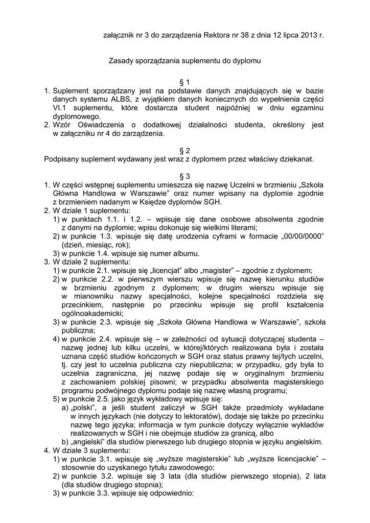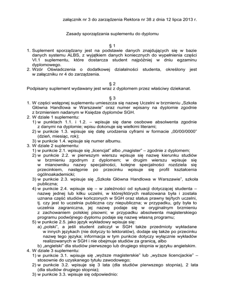 załącznik nr 3 do zarządzenia Rektora nr 38 z dnia 12 lipca 2013 r. Zasady sporządzania suplementu do dyplomu §1 1. Suplement sporządzany jest na podstawie danych znajdujących się w bazie danych systemu ALBS, z wyjątkiem danych koniecznych do wypełnienia części VI.1 suplementu, które dostarcza student najpóźniej w dniu egzaminu dyplomowego. 2. Wzór Oświadczenia o dodatkowej działalności studenta, określony jest w załączniku nr 4 do zarządzenia. §2 Podpisany suplement wydawany jest wraz z dyplomem przez właściwy dziekanat. §3 1. W części wstępnej suplementu umieszcza się nazwę Uczelni w brzmieniu „Szkoła Główna Handlowa w Warszawie” oraz numer wpisany na dyplomie zgodnie z brzmieniem nadanym w Księdze dyplomów SGH. 2. W dziale 1 suplementu: 1) w punktach 1.1. i 1.2. – wpisuje się dane osobowe absolwenta zgodnie z danymi na dyplomie; wpisu dokonuje się wielkimi literami; 2) w punkcie 1.3. wpisuje się datę urodzenia cyframi w formacie „00/00/0000” (dzień, miesiąc, rok); 3) w punkcie 1.4. wpisuje się numer albumu. 3. W dziale 2 suplementu: 1) w punkcie 2.1. wpisuje się „licencjat” albo „magister” – zgodnie z dyplomem; 2) w punkcie 2.2. w pierwszym wierszu wpisuje się nazwę kierunku studiów w brzmieniu zgodnym z dyplomem; w drugim wierszu wpisuje się w mianowniku nazwy specjalności, kolejne specjalności rozdziela się przecinkiem, następnie po przecinku wpisuje się profil kształcenia ogólnoakademicki; 3) w punkcie 2.3. wpisuje się „Szkoła Główna Handlowa w Warszawie”, szkoła publiczna; 4) w punkcie 2.4. wpisuje się – w zaleŜności od sytuacji dotyczącej studenta – nazwę jednej lub kilku uczelni, w której/których realizowana była i została uznana część studiów kończonych w SGH oraz status prawny tej/tych uczelni, tj. czy jest to uczelnia publiczna czy niepubliczna; w przypadku, gdy była to uczelnia zagraniczna, jej nazwę podaje się w oryginalnym brzmieniu z zachowaniem polskiej pisowni; w przypadku absolwenta magisterskiego programu podwójnego dyplomu podaje się nazwę własną programu; 5) w punkcie 2.5. jako język wykładowy wpisuje się: a) „polski”, a jeśli student zaliczył w SGH takŜe przedmioty wykładane w innych językach (nie dotyczy to lektoratów), dodaje się takŜe po przecinku nazwę tego języka; informacja w tym punkcie dotyczy wyłącznie wykładów realizowanych w SGH i nie obejmuje studiów za granicą, albo b) „angielski” dla studiów pierwszego lub drugiego stopnia w języku angielskim. 4. W dziale 3 suplementu: 1) w punkcie 3.1. wpisuje się „wyŜsze magisterskie” lub „wyŜsze licencjackie” – stosownie do uzyskanego tytułu zawodowego; 2) w punkcie 3.2. wpisuje się 3 lata (dla studiów pierwszego stopnia), 2 lata (dla studiów drugiego stopnia); 3) w punkcie 3.3. wpisuje się odpowiednio: a) „w wyniku postępowania kwalifikacyjnego”, jeśli chodzi o studia pierwszego stopnia, studia drugiego stopnia w języku angielskim (w tym na kierunku ekonomiczna analiza prawa w ramach programu European Master in Law and Economics), b) „na podstawie wyników postępowania kwalifikacyjnego”, jeśli chodzi o studia drugiego stopnia w języku polskim, c) „na podstawie skierowania z Biura Uznawalności Wykształcenia i Wymiany Międzynarodowej”, jeśli chodzi o stypendystów Rządu Polskiego. 5. W dziale 4 suplementu: 1) w punkcie 4.1. wpisuje się odpowiednio: „studia stacjonarne”, „studia niestacjonarne”; 2) w punkcie 4.2. wpisuje się „oparte na efektach i programach kształcenia zatwierdzonych uchwałami Senatu SGH zgodnie z obowiązującymi przepisami prawa”; 3) w punkcie 4.3. wpisuje się odpowiednio: a) dla absolwentów studiów drugiego stopnia (studiów magisterskich) w formie studiów stacjonarnych i niestacjonarnych tekst: „Studia magisterskie w SGH są prowadzone w ramach kierunków studiów; kandydat na studia magisterskie dokonuje wyboru kierunku w trakcie rekrutacji.”, po tekście wpisuje się w formie tabelarycznej wyniki osiągnięte przez absolwenta w toku zajęć w SGH wg wzoru: Lp. Sygnatura Tytuł zajęć Ocena Punkty ECTS b) dla absolwentów studiów pierwszego stopnia (studiów licencjackich) w formie studiów stacjonarnych i niestacjonarnych tekst: „Na studiach licencjackich studenci początkowo realizują wspólny program podstawowy, a następnie studiują na wybranym kierunku studiów.”, po tekście wpisuje się w formie tabelarycznej wyniki osiągnięte przez absolwenta w toku zajęć w SGH wg wzoru: Lp. Sygnatura Tytuł zajęć Ocena Punkty ECTS 4) w punkcie 4.4. wpisuje się skalę ocen: „Do dnia 30 września 2012 r. obowiązywała siedmiostopniowa skala ocen, 5,5 – celujący (najwyŜsza); 5,0 – bardzo dobry; 4,5 – dobry plus; 4,0 – dobry; 3,5 – dostateczny plus; 3,0 – dostateczny (najniŜsza zaliczająca) i 2,0 – niedostateczny (niezaliczająca). Oceny uzyskane według tej skali oznaczone są w tabelarycznym zestawieniu wyników gwiazdką. Od dnia 1 października 2012 r. obowiązuje sześciostopniowa skala ocen, 5,0 – bardzo dobry (najwyŜsza); 4,5 – dobry plus; 4,0 – dobry; 3,5 – dostateczny plus; 3,0 – dostateczny (najniŜsza zaliczająca) i 2,0 – niedostateczny (niezaliczająca).”; 5) w punkcie 4.5. wpisuje się ostateczny wynik studiów obliczony zgodnie z Regulaminem studiów z uwzględnieniem, w razie potrzeby, przeliczenia z siedmiostopniowej na sześciostopniową skalę ocen; w odniesieniu do studiów prowadzonych na podstawie wiąŜących SGH umów ostateczny wynik studiów określa się zgodnie z postanowieniami tych umów lub wydanymi w ich wykonaniu zarządzeniami Rektora. 6. W dziale 5 suplementu: 1) w punkcie 5.1. wpisuje się „magisterskie i podyplomowe”, gdy chodzi o absolwentów studiów pierwszego stopnia albo „podyplomowe, doktoranckie”, gdy chodzi o absolwentów studiów drugiego stopnia; 2) w punkcie 5.2. wpisuje się „nie dotyczy”. 7. W d