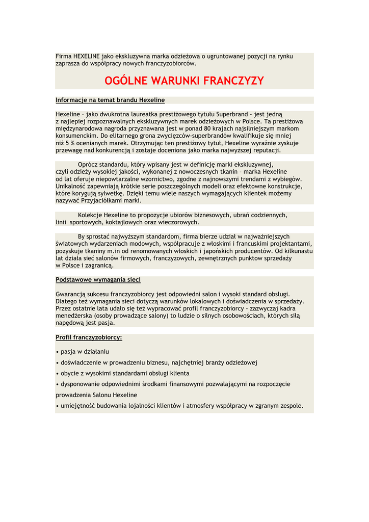 Firma HEXELINE jako ekskluzywna marka odzieŜowa o ugruntowanej pozycji na rynku zaprasza do współpracy nowych franczyzobiorców. OGÓLNE WARUNKI FRANCZYZY Informacje na temat brandu Hexeline Hexeline – jako dwukrotna laureatka prestiŜowego tytułu Superbrand - jest jedną z najlepiej rozpoznawalnych ekskluzywnych marek odzieŜowych w Polsce. Ta prestiŜowa międzynarodowa nagroda przyznawana jest w ponad 80 krajach najsilniejszym markom konsumenckim. Do elitarnego grona zwycięzców-superbrandów kwalifikuje się mniej niŜ 5 % ocenianych marek. Otrzymując ten prestiŜowy tytuł, Hexeline wyraźnie zyskuje przewagę nad konkurencją i zostaje doceniona jako marka najwyŜszej reputacji. Oprócz standardu, który wpisany jest w definicję marki ekskluzywnej, czyli odzieŜy wysokiej jakości, wykonanej z nowoczesnych tkanin – marka Hexeline od lat oferuje niepowtarzalne wzornictwo, zgodne z najnowszymi trendami z wybiegów. Unikalność zapewniają krótkie serie poszczególnych modeli oraz efektowne konstrukcje, które korygują sylwetkę. Dzięki temu wiele naszych wymagających klientek moŜemy nazywać Przyjaciółkami marki. Kolekcje Hexeline to propozycje ubiorów biznesowych, ubrań codziennych, linii sportowych, koktajlowych oraz wieczorowych. By sprostać najwyŜszym standardom, firma bierze udział w najwaŜniejszych światowych wydarzeniach modowych, współpracuje z włoskimi i francuskimi projektantami, pozyskuje tkaniny m.in od renomowanych włoskich i japońskich producentów. Od kilkunastu lat działa sieć salonów firmowych, franczyzowych, zewnętrznych punktow sprzedaŜy w Polsce i zagranicą. Podstawowe wymagania sieci Gwarancją sukcesu franczyzobiorcy jest odpowiedni salon i wysoki standard obsługi. Dlatego teŜ wymagania sieci dotyczą warunków lokalowych i doświadczenia w sprzedaŜy. Przez ostatnie lata udało się teŜ wypracować profil franczyzobiorcy - zazwyczaj kadra menedŜerska (osoby prowadzące salony) to ludzie o silnych osobowościach, których siłą napędową jest pasja. Profil franczyzobiorcy: • pasja w działaniu • doświadczenie w prowadzeniu biznesu, najchętniej branŜy odzieŜowej • obycie z wysokimi standardami obsługi klienta • dysponowanie odpowiednimi środkami finansowymi pozwalającymi na rozpoczęcie prowadzenia Salonu Hexeline • umiejętność budowania lojalności klientów i atmosfery współpracy w zgranym zespole. Idealny salon franczyzowy: • znajduje się w dobrej Galerii Handlowej/Centrum Handlowym w lokalizacji A • znajduje się przy głównej ulicy handlowej (na parterze) • ma powierzchnię handlową min. 80 m2 (wraz z zapleczem) • jest wyposaŜony zgodnie ze standardem Hexeline • posiada duŜą witrynę ekspozycyjną • posiada klimatyzację Wsparcie dla franczyzobiorców Oprócz moŜliwości rozwoju biznesowego Hexeline oferuje franczyzobiorcom: • wsparcie marketingowe w postaci katalogów i wystroju witryn, obsługę programów lojalnościowych, w niektórych regionach wypracowaną przez lata bazę klientów • przekazanie kolekcji na ustalonych zasadach • szkolenie kadry kierowniczej, udział w programach typu team-building w sieci • szkolenie produktowe oraz materiały wspierające proces sprzedaŜy • wprowadzenie w obowiązujące trendy przed kaŜdym sezonem z udziałem osobowości świata mody • pomoc w promocyjnych działaniach regionalnych • know-how ekskluzywnej marki odzieŜowej Osoby zainteresowane współpracą prosimy o kontakt pod poniŜszym adresem e-mail: [email protected]