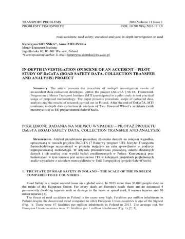 TRANSPORT PROBLEMS PROBLEMY TRANSPORTU 2016 Volume 11 Issue 1 DOI: 10.20858/tp.2016.11.1.9 road accidents; road safety; statistical analyses; in-depth investigation on road Katarzyna SICINSKA*, Anna ZIELINSKA Motor Transport Institute Jagiellońska 80, 03-301 Warsaw, Poland *Corresponding author. E-mail: [email protected] IN-DEPTH INVESTIGATION ON SCENE OF AN ACCIDENT – PILOT STUDY OF DaCoTA (ROAD SAFETY DATA, COLLECTION TRANSFER AND ANALYSIS) PROJECT Summary. The article presents the procedure of in-depth investigation on-site of an accident data collection developed within the project DaCoTA (7th EU Framework Programme). Motor Transport Institute (MTI) participated in a pilot study to test practical usage of proposed methodology. The paper presents procedure, scope of collected data, analysis and the results of research carried out in Poland. After the end of DaCoTA, MTI continues in-depth data collection & analysis of Two Powered Wheel’s accidents (with motorcyclists) as EU project named SaferWheels. POGŁĘBIONE BADANIA NA MIEJSCU WYPADKU – PILOTAŻ PROJEKTU DaCoTA (ROAD SAFETY DATA, COLLECTION TRANSFER AND ANALYSIS) Streszczenie. Artykuł przedstawia procedurę zbierania danych na miejscu wypadku, opracowaną w ramach projektu DaCoTA (7 Ramowy program UE). Instytut Transportu Samochodowego uczestniczył w pilotażu mającym na celu sprawdzenie w praktyce zaproponowanej metodologii. W artykule przedstawiono procedurę, zakres zbieranych danych i ich analizę oraz wyniki badań zrealizowanych w Polsce. Kontynuacją prac badawczych w tym temacie jest uczestnictwo ITS w kolejnych projektach pogłębionych analiz wypadków z udziałem motocyklistów w Unii Europejskiej (projekt SaferWheels). 1. THE STATE OF ROAD SAFETY IN POLAND – THE SCALE OF THE PROBLEM COMPARED TO EU COUNTRIES Road Safety is a major societal issue on a global scale. In 2013 more than 30,000 people died on the roads of the European Union. For every death on Europe's roads there are an estimated 4 permanently disabling injuries such as damage to the brain or spinal cord, 8 serious injuries and 50 minor injuries [1]. The threat of road accidents in Poland is for years very high. Fatalities per million inhabitants in Poland despite the downward trend compared to other European Union countries is one of the highest (Fig. 1). There were 87 fatalities per million inhabitants in Poland in 2013. The average risk for European Union countries were 51 fatalities per 1 million inhabitants (Fig. 1) [2, 3]. 88 K. Sicinska, A. Zielinska 93 POLAND 88 87 86 86 84 83 Fatalities per Million inhabitants 79 65 62 61 61 61 60 UE 58 54 51 51 48 51 46 43 41 41 36 34 FI SK M T IE D E ES D K N L U K SE EU SI H U IT A T C Y FR R O LV PL H R LT LU B G EL B E C Z PT EE 28 28 27 Fig. 1. Fatalities per million inhabitants by country in EU in 2013 [3] Rys. 1. Ofiary śmiertelne wypadków drogowych na 1 mln mieszkańców w krajach UE w 2013 r. [3] In 2013 the threat on Polish roads decreased [4,5]. In comparison with 2012: • the number of road accidents decreased from 37 046 to 35 847 (-3%), • the number of fatalities decreased from 3 571 to 3 357 (-6%), • the number of injured decreased from 45 792 to 44 059 (4%), • the number of seriously injured decreased from 12 046 to 11 672 (-3%). Within the past 10 years, i.e. since 2004 (Fig. 2) has decreased: • the number of accidents by 30%, • the number of fatalities by 40%, • the number of injured by 31%, including the decrease among seriously injured by 33%. In 10 years period of time the number of vehicles in the Poland has increased by 62% [5]. Fig. 2. Road fatalities in Poland 2004 - 2013 [5] Fig. 2. Ofiary śmiertelne w Polsce w latach 2004 - 2013 [5] In-Depth investigation on scene of an accident… 89 With the exception of a slight increase in the number of victims in 2011, downward trend has maintained since 2008. Despite being optimistic, these changes have not met the objectives of the National Road Safety Programme, which assumed that in the period from 2010 to 2020 number of fatalities would drop by 50% and the number of seriously injured by 40%. This means that in the course of the implementation of the assumptions of the National Road Safety Programme 2020 (NRSP 2020) on Polish roads in 2020 should not be more than 2 000 fatalities and no more than 6 900 seriously injured people [6]. If this objective is to be achieved, each year should be followed by an average drop of 6.7% among fatalities. It means that there should not have been more than 3 193 fatalities in 2013 and no more than 9 861 seriously injured people (annual drop of 5 %). Fig. 3. The objectives set in National Road Safety Programme for 2010 - 2020 [6] Fig. 3. Cele NP BRD w latach 2010 - 2020 [6] Poland significantly approach achieving this objective in 2013 because there were 164 fatalities on roads more compared to the assumptions previously made (decrease by 14% as compared to 2010). In relation to set objectives, there is unfortunately small decrease in the number of seriously injured. There were too many of them by 1 811 (increase by 1.8% as compared to 2010) (Fig. 3). According to police statistics the most frequent causes of road accidents for years in Poland are: exceeded speed, the right of way violation, improper behaviour towards pedestrians and drivers/pedestrians under the influence of alcohol. The most serious problem on Polish roads is a big threat to unprotected road users: pedestrians, cyclists, motorcyclists and moped riders. Statistical data collected by the police are the base for determination of the scale of threats and identification of major road safety problems. Unfortunately police on scene of an accident has no chances or time for cause of the incident. The main task of police work is to assist victims, secure the accident site, control traffic (then the police collects data about the circumstances of the accident). Recreating the course of road accident and determining the perpetr