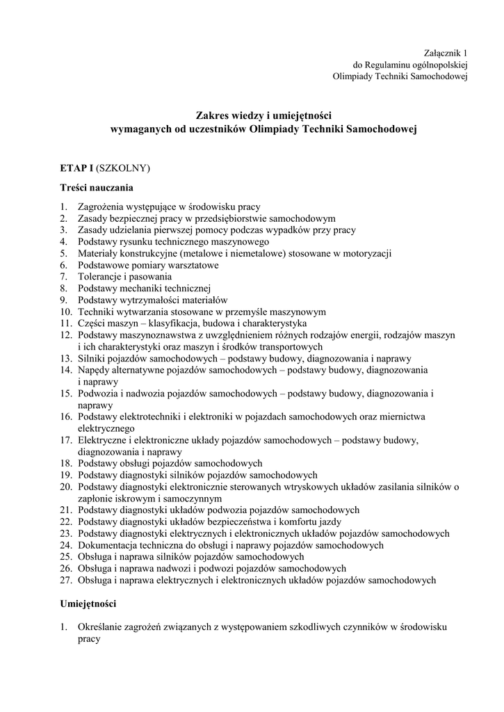 Załącznik 1 do Regulaminu ogólnopolskiej Olimpiady Techniki Samochodowej Zakres wiedzy i umiejętności wymaganych od uczestników Olimpiady Techniki Samochodowej ETAP I (SZKOLNY) Treści nauczania 1. 2. 3. 4. 5. 6. 7. 8. 9. 10. 11. 12. 13. 14. 15. 16. 17. 18. 19. 20. 21. 22. 23. 24. 25. 26. 27. Zagrożenia występujące w środowisku pracy Zasady bezpiecznej pracy w przedsiębiorstwie samochodowym Zasady udzielania pierwszej pomocy podczas wypadków przy pracy Podstawy rysunku technicznego maszynowego Materiały konstrukcyjne (metalowe i niemetalowe) stosowane w motoryzacji Podstawowe pomiary warsztatowe Tolerancje i pasowania Podstawy mechaniki technicznej Podstawy wytrzymałości materiałów Techniki wytwarzania stosowane w przemyśle maszynowym Części maszyn – klasyfikacja, budowa i charakterystyka Podstawy maszynoznawstwa z uwzględnieniem różnych rodzajów energii, rodzajów maszyn i ich charakterystyki oraz maszyn i środków transportowych Silniki pojazdów samochodowych – podstawy budowy, diagnozowania i naprawy Napędy alternatywne pojazdów samochodowych – podstawy budowy, diagnozowania i naprawy Podwozia i nadwozia pojazdów samochodowych – podstawy budowy, diagnozowania i naprawy Podstawy elektrotechniki i elektroniki w pojazdach samochodowych oraz miernictwa elektrycznego Elektryczne i elektroniczne układy pojazdów samochodowych – podstawy budowy, diagnozowania i naprawy Podstawy obsługi pojazdów samochodowych Podstawy diagnostyki silników pojazdów samochodowych Podstawy diagnostyki elektronicznie sterowanych wtryskowych układów zasilania silników o zapłonie iskrowym i samoczynnym Podstawy diagnostyki układów podwozia pojazdów samochodowych Podstawy diagnostyki układów bezpieczeństwa i komfortu jazdy Podstawy diagnostyki elektrycznych i elektronicznych układów pojazdów samochodowych Dokumentacja techniczna do obsługi i naprawy pojazdów samochodowych Obsługa i naprawa silników pojazdów samochodowych Obsługa i naprawa nadwozi i podwozi pojazdów samochodowych Obsługa i naprawa elektrycznych i elektronicznych układów pojazdów samochodowych Umiejętności 1. Określanie zagrożeń związanych z występowaniem szkodliwych czynników w środowisku pracy 2. 3. 4. 5. 6. 7. 8. 9. 10. 11. 12. 13. 14. 15. 16. 17. 18. 19. 20. 21. 22. 23. 24. 25. 26. 27. 28. 29. 30. 31. 32. 33. 34. 35. 36. 37. 38. Określanie skutków oddziaływania czynników szkodliwych na organizm człowieka Stosowanie środków ochrony indywidualnej i zbiorowej podczas wykonywania zadań zawodowych Przestrzeganie zasad bezpieczeństwa i higieny pracy oraz stosowanie przepisów prawa dotyczących ochrony przeciwpożarowej i ochrony środowiska Przestrzeganie zasad sporządzania rysunku technicznego maszynowego Sporządzanie szkiców części maszyn Rozróżnianie części maszyn i urządzeń Rozróżnianie rodzaje połączeń Przestrzeganie zasad tolerancji i pasowań Rozróżnianie materiałów konstrukcyjnych i eksploatacyjnych Rozróżnianie środków transportu wewnętrznego Rozpoznawanie rodzajów korozji oraz określanie sposobów ochrony przed korozją Rozróżnianie technik i metod wytwarzania części maszyn i urządzeń Rozróżnianie maszyn, urządzeń i narzędzi do obróbki maszynowej Rozróżnianie przyrządów pomiarowych stosowanych podczas obróbki ręcznej i maszynowej Wykonywanie pomiarów warsztatowych Określanie budowy oraz przestrzeganie zasad działania maszyn i urządzeń Posługiwanie się dokumentacją techniczną maszyn i urządzeń oraz przestrzeganie norm dotyczących rysunku technicznego, części maszyn, materiałów konstrukcyjnych i eksploatacyjnych Stosowanie praw i przestrzeganie zasad mechaniki technicznej, elektrotechniki, elektroniki i automatyki Dobieranie narzędzi i przyrządów pomiarowych do montażu i demontażu maszyn i urządzeń Wykorzystanie oprogramowania komputerowego wspomagającego wykonywanie zadań Charakteryzowanie budowy pojazdów samochodowych oraz wyjaśnianie zasady działania podzespołów i zespołów tych pojazdów Rozpoznawanie podzespołów i zespołów pojazdu samochodowego Stosowanie narzędzi i przyrządów pomiarowych do wykonania diagnostyki pojazdów samochodowych Dobieranie metod oraz określanie zakresu diagnostyki podzespołów i zespołów pojazdów samochodowych Stosowanie programów komputerowych do diagnostyki pojazdów samochodowych Wykonywanie pomiarów i badań diagnostycznych pojazdów samochodowych oraz interpretowanie ich wyników Dokonywanie oceny stanu technicznego pojazdów samochodowych Posługiwanie się dokumentacją techniczną pojazdów samochodowych Lokalizowanie uszkodzeń zespołów i podzespołów pojazdów samochodowych na podstawie pomiarów i wyników badań diagnostycznych Dobieranie metod i określanie zakresu naprawy pojazdu samochodowego Wykonywanie demontażu zespołów i podzespołów pojazdów samochodowych Przeprowadzanie weryfikacji zespołów i podzespołów pojazdów samochodowych Dobieranie zespołów lub podzespołów pojazdów samochodowych lub ich zamienników do wymiany Wymienianie uszkodzonych zespołów i podzespołów pojazdów samochodowych z wykorzystaniem urządzeń i narzędzi warsztatowych Wykonywanie montażu podzespołów i zespołów pojazdów samochodowych Rozróżnianie metod diagnostyki układów elektrycznych i elektronicznych pojazdów samochodowych Rozpoznawanie elementów oraz układów elektrycznych i elektronicznych pojazdów samochodowych 39. Określanie zakresu diagnostyki układów elektrycznych i elektronicznych pojazdów samochodowych 40. Stosowanie programów komputerowych do diagnostyki układów elektrycznych i elektronicznych pojazdów samochodowych 41. Wykonywanie pomiarów diagnostycznych układów elektrycznych i elektronicznych pojazdów samochodowych 42. Interpretowanie wyników pomiarów układów elektrycznych i elektronicznych pojazdów samochodowych 43. Ocenianie stanu technicznego elementów oraz układów elektrycznych