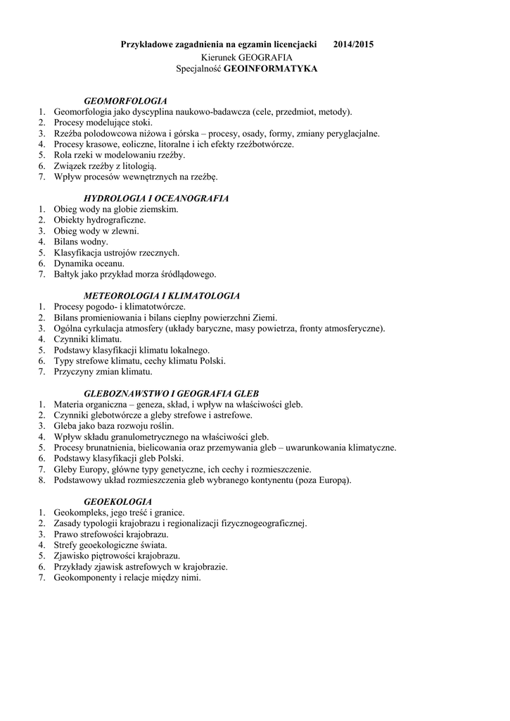 Przykładowe zagadnienia na egzamin licencjacki Kierunek GEOGRAFIA Specjalność GEOINFORMATYKA 2014/2015 1. 2. 3. 4. 5. 6. 7. GEOMORFOLOGIA Geomorfologia jako dyscyplina naukowo-badawcza (cele, przedmiot, metody). Procesy modelujące stoki. Rzeźba polodowcowa niżowa i górska – procesy, osady, formy, zmiany peryglacjalne. Procesy krasowe, eoliczne, litoralne i ich efekty rzeźbotwórcze. Rola rzeki w modelowaniu rzeźby. Związek rzeźby z litologią. Wpływ procesów wewnętrznych na rzeźbę. 1. 2. 3. 4. 5. 6. 7. HYDROLOGIA I OCEANOGRAFIA Obieg wody na globie ziemskim. Obiekty hydrograficzne. Obieg wody w zlewni. Bilans wodny. Klasyfikacja ustrojów rzecznych. Dynamika oceanu. Bałtyk jako przykład morza śródlądowego. 1. 2. 3. 4. 5. 6. 7. METEOROLOGIA I KLIMATOLOGIA Procesy pogodo- i klimatotwórcze. Bilans promieniowania i bilans cieplny powierzchni Ziemi. Ogólna cyrkulacja atmosfery (układy baryczne, masy powietrza, fronty atmosferyczne). Czynniki klimatu. Podstawy klasyfikacji klimatu lokalnego. Typy strefowe klimatu, cechy klimatu Polski. Przyczyny zmian klimatu. 1. 2. 3. 4. 5. 6. 7. 8. GLEBOZNAWSTWO I GEOGRAFIA GLEB Materia organiczna – geneza, skład, i wpływ na właściwości gleb. Czynniki glebotwórcze a gleby strefowe i astrefowe. Gleba jako baza rozwoju roślin. Wpływ składu granulometrycznego na właściwości gleb. Procesy brunatnienia, bielicowania oraz przemywania gleb – uwarunkowania klimatyczne. Podstawy klasyfikacji gleb Polski. Gleby Europy, główne typy genetyczne, ich cechy i rozmieszczenie. Podstawowy układ rozmieszczenia gleb wybranego kontynentu (poza Europą). 1. 2. 3. 4. 5. 6. 7. GEOEKOLOGIA Geokompleks, jego treść i granice. Zasady typologii krajobrazu i regionalizacji fizycznogeograficznej. Prawo strefowości krajobrazu. Strefy geoekologiczne świata. Zjawisko piętrowości krajobrazu. Przykłady zjawisk astrefowych w krajobrazie. Geokomponenty i relacje między nimi. GEOGRAFIA SPOŁECZNA 1. Geografia społeczna: zakres, metody badawcze i miejsce wśród pokrewnych subdyscyplin. 2. Orientacje badawcze we współczesnej geografii społecznej, w tym różnice między orientacją scjentystyczną (neopozytywistyczną) a orientacją postmodernistyczną. 3. Geografia kultury: zakres, metody badawcze; przykłady tematów badawczych. 4. Behawioralne i humanistyczne podejście do badań poznawania i wartościowania przestrzeni. 5. Interpretacje problemów ludnościowych współczesnego świata (rozmieszczenie, zmiany liczby ludności, struktura ludności, teoria przejścia demograficznego, narzędzia wykorzystywane w badaniach demograficznych). 6. Kategorie rasy, klasy, etniczności i płci kulturowej w badaniach geografii społecznej. 7. Geograficzne badania nad rozwojem społecznym (społeczne aspekty modernizacji i rozwoju zależnego; rozwój endogenny). 8. Przekształcenia struktury społecznej w Polsce po 1989 roku i ich wymiar przestrzenny. 9. Współczesne migracje Polaków (kierunki, wielkości przepływów, charakterystyka, tło i następstwa). GEOGRAFIA POLITYCZNA 1. Geografia polityczna – definicja, funkcje, historia subdyscypliny ze szczególnym uwzględnieniem polskiej geografii politycznej. 2. Państwo – definicja, geneza, klasyfikacje, znaczenie polityczne położenia geograficznego państwa. Granica – definicja, rodzaje, etapy ustalania granicy. Ograniczenia zwierzchnictwa terytorialnego. Terytoria niebędące państwami. Obszary morskie a suwerenność państw. Cieśniny międzynarodowe i międzynarodowe kanały morskie. Klasyfikacja rzek z punktu widzenia geografii politycznej. Obszary podbiegunowe. Niepaństwowi uczestnicy stosunków międzynarodowych i ich znaczenie. 3. Zmiany na mapie politycznej świata ze względu na ich rodzaj. Kolonizacja i dekolonizacja. Świat komunistyczny – narodziny, rozwój terytorialny, upadek i jego konsekwencje. 4. Geografia wyborcza - definicja, problemy badawcze, teoretyczne podstawy tworzenia okręgów wyborczych, przestrzenne zróżnicowanie zachowań wyborczych Polaków. 5. Polskie wielkie narracje geopolityczne – Polska jako przedmurze, kraina przejściowa i pomostowa, doktryna ULB. Zmiany granic i środowiska międzynarodowego Polski X-XXI w. 6. Polacy w świecie – wielkość diaspory, rozmieszczenie, podziały, przyczyny powstania/powstawania diaspory. Mniejszości narodowe, etniczne i regionalne w Polsce. 7. Przestrzeń publiczna jako miejsce rywalizacji politycznej, ze szczególnym uwzględnieniem Warszawy (toponimy o charakterze politycznym, architektura a polityka, przestrzenna polityka historyczna i symboliczna). 8. Najważniejsze konflikty i spory międzynarodowe w XXI w. 1. 2. 3. 4. 5. 6. 7. GEOGRAFIA REGIONALNA Problemy metodologiczne regionalizacji geograficznej Rola mórz w gospodarce Europy Przyrodnicze uwarunkowania działalności gospodarczej na obszarach górskich (na wybranych przykładach) Bariery działalności człowieka w strefie suchej (na wybranych przykładach) Środowisko przyrodnicze a rozmieszczenie ludności w wybranym regionie Zasoby i zagrożenia rolnictwa w strefie umiarkowanej Zmiany środowiska przyrodniczego spowodowane działalnością człowieka 1. 2. 3. 4. 5. 6. 7. ROZWÓJ REGIONALNY I POLITYKA REGIONALNA Omów teorię miejsc centralnych – teoretyczne i praktyczne jej aspekty. Klasyczne teorie lokalizacji – podaj przykłady. Teoria lokalizacji Alfreda Webera – założenia, lokalizacja a etapy produkcji. Rozwój regionalny w koncepcji lokalizacji Alfreda Löscha. Teoria biegunów wzrostu francuskiego ekonomisty F. Perroux i jej zastosowanie w krajach rozwijających się. Tennessee Valley AuthorityTennessee– znaczenie tego projektu dla rozwoju południa Stanów Zjednoczonych. Fordyzm i post-fordyzm – różnice w zagospodarowaniu przestrzennym. 2 GEOGRAFIA EKONOMICZNA 1. Rozwój gospodarczy w ujęciu czasowym i przestrzennym (etapy i czynniki rozwoju, koncepcja fal innowacji J. Schumpetera, mierniki poziomu rozwoju społeczno-gospodar