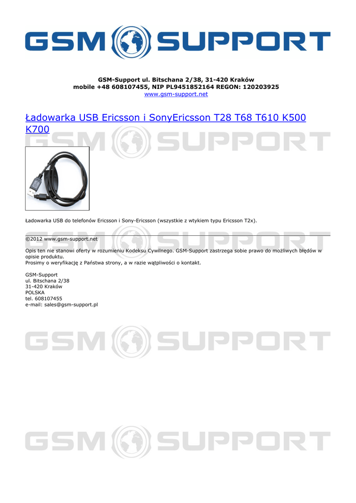GSM-Support ul. Bitschana 2/38, 31-420 Kraków mobile +48 608107455, NIP PL9451852164 REGON: 120203925 www.gsm-support.net Ładowarka USB Ericsson i SonyEricsson T28 T68 T610 K500 K700 Ładowarka USB do telefonów Ericsson i Sony-Ericsson (wszystkie z wtykiem typu Ericsson T2x). ©2012 www.gsm-support.net Opis ten nie stanowi oferty w rozumieniu Kodeksu Cywilnego. GSM-Support zastrzega sobie prawo do możliwych błędów w opisie produktu. Prosimy o weryfikację z Państwa strony, a w razie wątpliwości o kontakt. GSM-Support ul. Bitschana 2/38 31-420 Kraków POLSKA tel. 608107455 e-mail: [email protected] Powered by TCPDF (www.tcpdf.org)