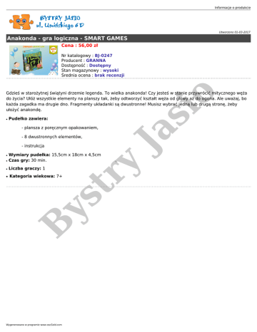 Informacje o produkcie Utworzono 01-03-2017 Anakonda - gra logiczna - SMART GAMES Cena : 56,00 zł Nr katalogowy : BJ-0247 Producent : GRANNA Dostępność : Dostępny Stan magazynowy : wysoki Średnia ocena : brak recenzji Pudełko zawiera: - plansza z poręcznym opakowaniem, - 8 dwustronnych elementów, - instrukcja ● Liczba graczy: 1 Kategoria wiekowa: 7+ B ys ● Wymiary pudełka: 15,5cm x 18cm x 4,5cm Czas gry: 30 min. y ● tr ● Wygenerowano w programie www.oscGold.com Ja ● si o Gdzieś w starożytnej świątyni drzemie legenda. To wielka anakonda! Czy jesteś w stanie przywrócić mitycznego węża do życia? Ułóż wszystkie elementy na planszy tak, żeby odtworzyć kształt węża od głowy aż do ogona. Ale uważaj, bo każda zagadka ma drugie dno. Fragmenty układanki są dwustronne! Musisz wybrać jedną lub drugą stronę, żeby ułożyć anakondę.