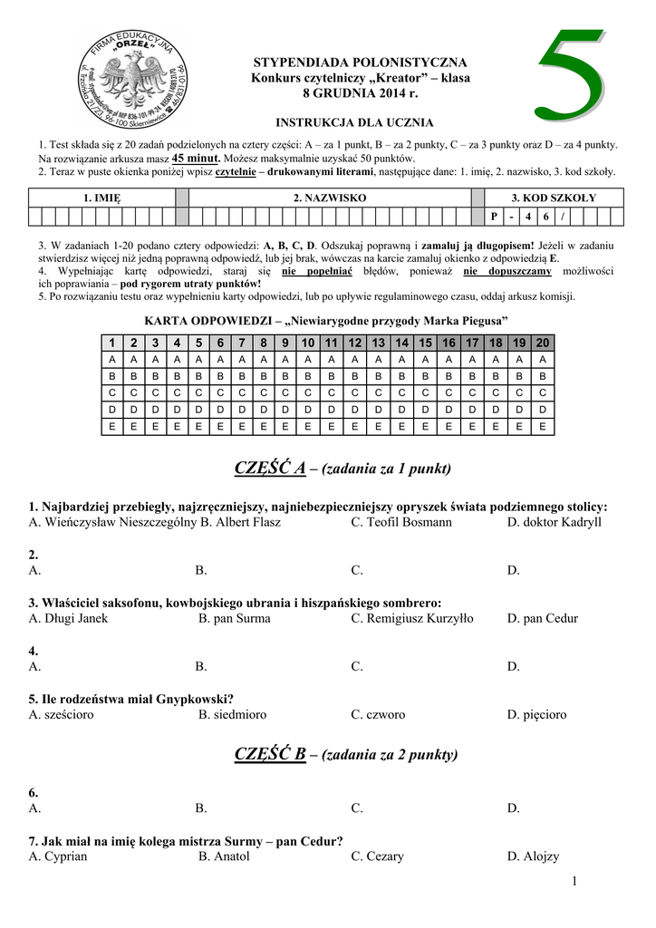 STYPENDIADA POLONISTYCZNA Konkurs czytelniczy „Kreator” – klasa 8 GRUDNIA 2014 r. INSTRUKCJA DLA UCZNIA 1. Test składa się z 20 zadań podzielonych na cztery części: A – za 1 punkt, B – za 2 punkty, C – za 3 punkty oraz D – za 4 punkty. Na rozwiązanie arkusza masz 45 minut. Możesz maksymalnie uzyskać 50 punktów. 2. Teraz w puste okienka poniżej wpisz czytelnie – drukowanymi literami, następujące dane: 1. imię, 2. nazwisko, 3. kod szkoły. 1. IMIĘ 2. NAZWISKO 3. KOD SZKOŁY P - 4 6 / 3. W zadaniach 1-20 podano cztery odpowiedzi: A, B, C, D. Odszukaj poprawną i zamaluj ją długopisem! Jeżeli w zadaniu stwierdzisz więcej niż jedną poprawną odpowiedź, lub jej brak, wówczas na karcie zamaluj okienko z odpowiedzią E. 4. Wypełniając kartę odpowiedzi, staraj się nie popełniać błędów, ponieważ nie dopuszczamy możliwości ich poprawiania – pod rygorem utraty punktów! 5. Po rozwiązaniu testu oraz wypełnieniu karty odpowiedzi, lub po upływie regulaminowego czasu, oddaj arkusz komisji. KARTA ODPOWIEDZI – „Niewiarygodne przygody Marka Piegusa” 1 2 3 4 5 6 7 8 9 A A A A A A A A A 10 11 12 13 14 15 16 17 18 19 20 A A A A A A A A A A A B B B B B B B B B B B B B B B B B B B B C C C C C C C C C C C C C C C C C C C C D D D D D D D D D D D D D D D D D D D D E E E E E E E E E E E E E E E E E E E E CZĘŚĆ A – (zadania za 1 punkt) 1. Najbardziej przebiegły, najzręczniejszy, najniebezpieczniejszy opryszek świata podziemnego stolicy: A. Wieńczysław Nieszczególny B. Albert Flasz C. Teofil Bosmann D. doktor Kadryll 2. A. B. C. D. 3. Właściciel saksofonu, kowbojskiego ubrania i hiszpańskiego sombrero: A. Długi Janek B. pan Surma C. Remigiusz Kurzyłło D. pan Cedur 4. A. C. D. C. czworo D. pięcioro B. 5. Ile rodzeństwa miał Gnypkowski? A. sześcioro B. siedmioro CZĘŚĆ B – (zadania za 2 punkty) 6. A. B. C. 7. Jak miał na imię kolega mistrza Surmy – pan Cedur? A. Cyprian B. Anatol C. Cezary D. D. Alojzy 1 8. Wskaż adres „niejakich Piegusów”: A. Akacjowa 15 B. Brzozowa 14 C. Lipowa 13 D. Klonowa 12 9. A. C. D. C. gitara D. wiolonczela B. 10. Ukochany instrument muzyczny pana Surmy: A. waltornia B. perkusja CZĘŚĆ C – (zadania za 3 punkty) 11. A. B. C. D. 12. „Przysmak” Papkiewicza: A. kulki z papieru B. atrament C. kwiatki doniczkowe D. kreda 13. A. C. D. B. 14. Jakiej rasy był psiak, którego Marek przyniósł w prezencie dla pani Okulusowej z okazji jej imienin? A. cocker B. pekińczyk C. buldog D. bokser 15. A. B. C. D. CZĘŚĆ D – (zadania za 4 punkty) 16. Owoce z makabrycznego snu Piegusa: A. wiśnie B. maliny C. czereśnie D. poziomki 17. A. C. D. B. 18. Wskaż afrykański kraj, z którego pochodził najcenniejszy w klaserze Marka znaczek pocztowy: A. Gwinea B. Gabon C. Gambia D. Botswana 19. A. B. C. D. 20. Ilu Hipolitów Kwasów podniosło niegdyś alarm i założyło protest przeciwko działalności uomo perfetto – największego detektywa współczesnego – maestro Hippollita Kwassa? A. 283 B. 382 C. 238 D. 328 2