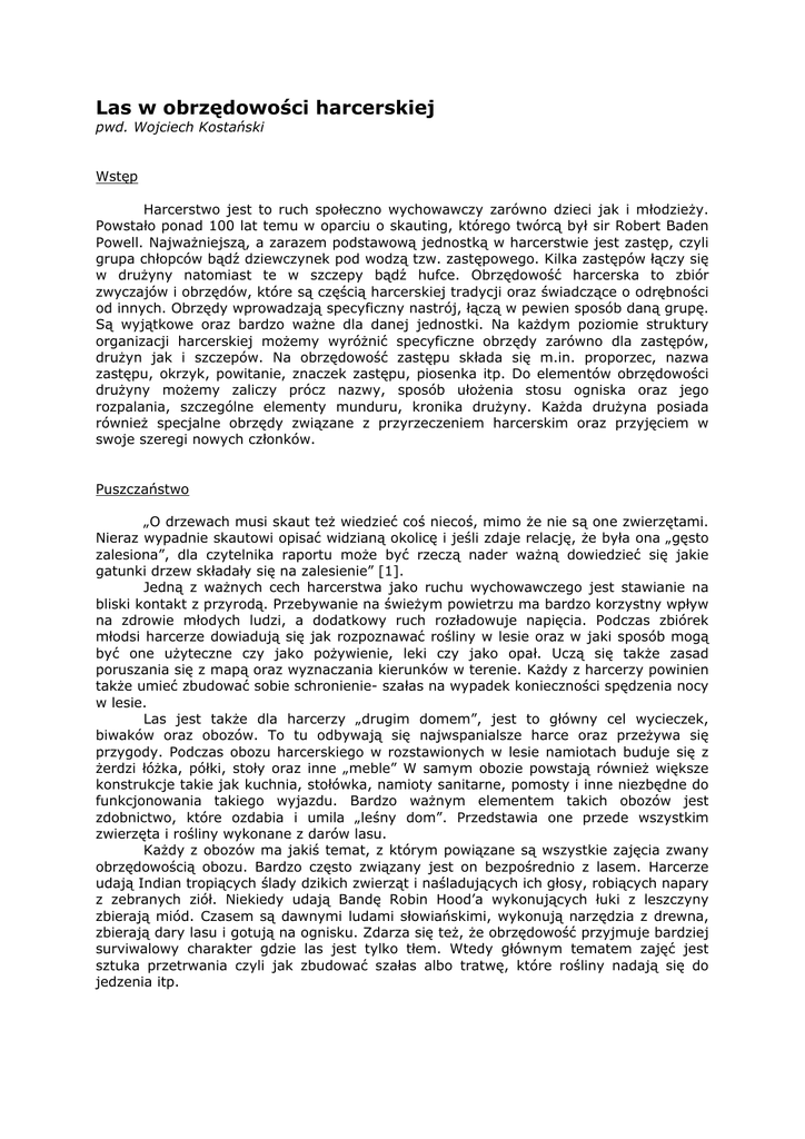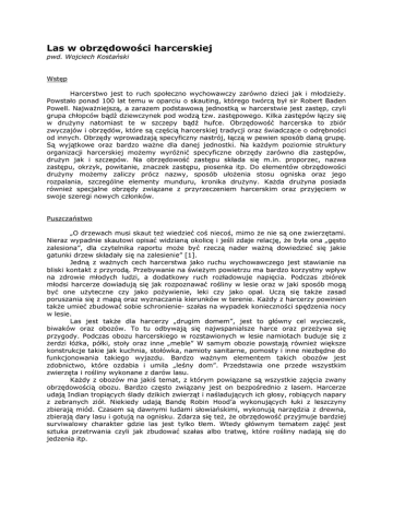Las w obrzędowości harcerskiej pwd. Wojciech Kostański Wstęp Harcerstwo jest to ruch społeczno wychowawczy zarówno dzieci jak i młodzieży. Powstało ponad 100 lat temu w oparciu o skauting, którego twórcą był sir Robert Baden Powell. Najważniejszą, a zarazem podstawową jednostką w harcerstwie jest zastęp, czyli grupa chłopców bądź dziewczynek pod wodzą tzw. zastępowego. Kilka zastępów łączy się w drużyny natomiast te w szczepy bądź hufce. Obrzędowość harcerska to zbiór zwyczajów i obrzędów, które są częścią harcerskiej tradycji oraz świadczące o odrębności od innych. Obrzędy wprowadzają specyficzny nastrój, łączą w pewien sposób daną grupę. Są wyjątkowe oraz bardzo ważne dla danej jednostki. Na każdym poziomie struktury organizacji harcerskiej możemy wyróżnić specyficzne obrzędy zarówno dla zastępów, drużyn jak i szczepów. Na obrzędowość zastępu składa się m.in. proporzec, nazwa zastępu, okrzyk, powitanie, znaczek zastępu, piosenka itp. Do elementów obrzędowości drużyny możemy zaliczy prócz nazwy, sposób ułożenia stosu ogniska oraz jego rozpalania, szczególne elementy munduru, kronika drużyny. Każda drużyna posiada również specjalne obrzędy związane z przyrzeczeniem harcerskim oraz przyjęciem w swoje szeregi nowych członków. Puszczaństwo „O drzewach musi skaut też wiedzieć coś niecoś, mimo że nie są one zwierzętami. Nieraz wypadnie skautowi opisać widzianą okolicę i jeśli zdaje relację, że była ona „gęsto zalesiona”, dla czytelnika raportu może być rzeczą nader ważną dowiedzieć się jakie gatunki drzew składały się na zalesienie” [1]. Jedną z ważnych cech harcerstwa jako ruchu wychowawczego jest stawianie na bliski kontakt z przyrodą. Przebywanie na świeżym powietrzu ma bardzo korzystny wpływ na zdrowie młodych ludzi, a dodatkowy ruch rozładowuje napięcia. Podczas zbiórek młodsi harcerze dowiadują się jak rozpoznawać rośliny w lesie oraz w jaki sposób mogą być one użyteczne czy jako pożywienie, leki czy jako opał. Uczą się także zasad poruszania się z mapą oraz wyznaczania kierunków w terenie. Każdy z harcerzy powinien także umieć zbudować sobie schronienie- szałas na wypadek konieczności spędzenia nocy w lesie. Las jest także dla harcerzy „drugim domem”, jest to główny cel wycieczek, biwaków oraz obozów. To tu odbywają się najwspanialsze harce oraz przeżywa się przygody. Podczas obozu harcerskiego w rozstawionych w lesie namiotach buduje się z żerdzi łóżka, półki, stoły oraz inne „meble” W samym obozie powstają również większe konstrukcje takie jak kuchnia, stołówka, namioty sanitarne, pomosty i inne niezbędne do funkcjonowania takiego wyjazdu. Bardzo ważnym elementem takich obozów jest zdobnictwo, które ozdabia i umila „leśny dom”. Przedstawia one przede wszystkim zwierzęta i rośliny wykonane z darów lasu. Każdy z obozów ma jakiś temat, z którym powiązane są wszystkie zajęcia zwany obrzędowością obozu. Bardzo często związany jest on bezpośrednio z lasem. Harcerze udają Indian tropiących ślady dzikich zwierząt i naśladujących ich głosy, robiących napary z zebranych ziół. Niekiedy udają Bandę Robin Hood’a wykonujących łuki z leszczyny zbierają miód. Czasem są dawnymi ludami słowiańskimi, wykonują narzędzia z drewna, zbierają dary lasu i gotują na ognisku. Zdarza się też, że obrzędowość przyjmuje bardziej surviwalowy charakter gdzie las jest tylko tłem. Wtedy głównym tematem zajęć jest sztuka przetrwania czyli jak zbudować szałas albo tratwę, które rośliny nadają się do jedzenia itp. Nazwy zastępów i drużyn Powiązanie obrzędowości harcerskiej z lasem jest bardzo naturalne. Można je dostrzec między innymi w nazwach zarówno drużyn jak i zastępów: „Młody las”, „Bukowina”, „Gaj”. Zastępy często wybierają swoje nazwy od drzew i innych roślin. Miana te związane są często z jakąś cechą przypisywaną temu gatunkowi np. zastęp „Dębów” za honor stawia sobie wykazanie swojej siły. Nazwa związana może być też z wydarzeniem z historii tego zastępu. Za przykład można podać historię gdy. jeden z zastępów zagapił się i rozbił chatkę pod leszczynami. Następnego dnia wszyscy harcerze mogli się pochwalić pokaźną kolekcją kleszczy. Po tym zdarzeniu zastęp zaczął być nazywany „Leszczyny”. I nigdy chatki pod leszczyną już nie rozbił. Zastępy często przyjmują też miana od zwierząt, podobnie jak to miało miejsce w przypadku drzew związane z jakąś cechą tego zastępu. Zastęp „Nietoperzy” nigdy nie zgubi się w nocy w lesie. W drużynach spotkamy też wilki, rysie, dziki, lisy, puchacze, sowy i wiele innych. Ognisko Najbardziej uroczystym i celebrowanym elementem w obrzędowości harcerskiej jest ognisko. Od wieków ogień skupiał ludzi i stwarzał poczucie wspólnoty i tak jest do dziś. Ognisko stwarza wspaniałą okazję do rozmowy oraz dyskusji na trudne tematy. Jest okazja do ważnych wydarzeń w życiu drużyny takich jak przyjęcia nowych w szeregi drużyny lub dopuszczenia do złożenia Przyrzeczenia Harcerskiego już przyjętych. Jest ono ważną częścią życia harcerskiego drużyny, toteż wiąże się z nim wiele zwyczajów, charakterystycznych dla każdego środowiska. Czasami ogniska mają mniej formalną formę tak zwane „śpiewanki” na których harcerze siadają razem w kręgu bawią się i śpiewają. Pierwszy obrzęd wiąże się z samym ułożeniem stosu ogniskowego. Ognisko układa jedna, wyznaczona osoba- może korzystać z pomocy innych, ale to ona odpowiada za to, żeby ogień się rozpalił. Stos musi być ułożony z darów lasu, tzn. z drewna znalezionego w lesie, kory brzozowej itp., bez udziału przetworzonego drewna czy tym bardziej papieru albo benzyny. Nigdy nie może być użyte żywe drewna - ognisko układamy z tego, co las na