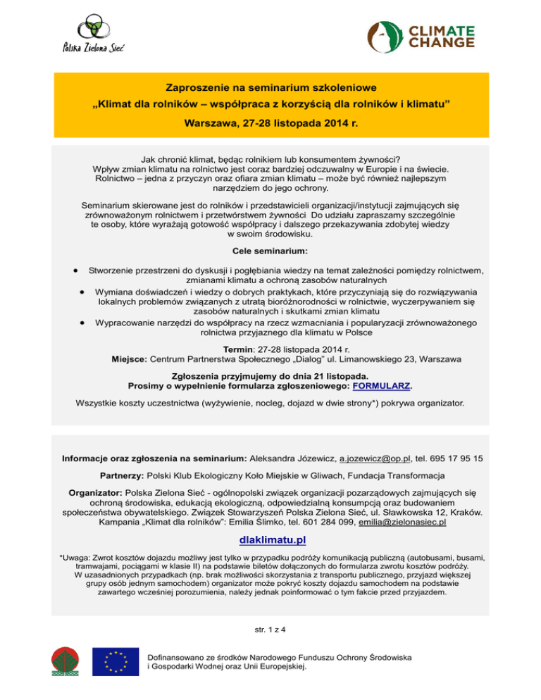 Zaproszenie na seminarium szkoleniowe „Klimat dla rolników – współpraca z korzyścią dla rolników i klimatu” Warszawa, 27-28 listopada 2014 r. Jak chronić klimat, będąc rolnikiem lub konsumentem żywności? Wpływ zmian klimatu na rolnictwo jest coraz bardziej odczuwalny w Europie i na świecie. Rolnictwo – jedna z przyczyn oraz ofiara zmian klimatu – może być również najlepszym narzędziem do jego ochrony. Seminarium skierowane jest do rolników i przedstawicieli organizacji/instytucji zajmujących się zrównoważonym rolnictwem i przetwórstwem żywności Do udziału zapraszamy szczególnie te osoby, które wyrażają gotowość współpracy i dalszego przekazywania zdobytej wiedzy w swoim środowisku. Cele seminarium: Stworzenie przestrzeni do dyskusji i pogłębiania wiedzy na temat zależności pomiędzy rolnictwem, zmianami klimatu a ochroną zasobów naturalnych Wymiana doświadczeń i wiedzy o dobrych praktykach, które przyczyniają się do rozwiązywania lokalnych problemów związanych z utratą bioróżnorodności w rolnictwie, wyczerpywaniem się zasobów naturalnych i skutkami zmian klimatu Wypracowanie narzędzi do współpracy na rzecz wzmacniania i popularyzacji zrównoważonego rolnictwa przyjaznego dla klimatu w Polsce Termin: 27-28 listopada 2014 r. Miejsce: Centrum Partnerstwa Społecznego „Dialog” ul. Limanowskiego 23, Warszawa Zgłoszenia przyjmujemy do dnia 21 listopada. Prosimy o wypełnienie formularza zgłoszeniowego: FORMULARZ. Wszystkie koszty uczestnictwa (wyżywienie, nocleg, dojazd w dwie strony*) pokrywa organizator. Informacje oraz zgłoszenia na seminarium: Aleksandra Józewicz, [email protected], tel. 695 17 95 15 Partnerzy: Polski Klub Ekologiczny Koło Miejskie w Gliwach, Fundacja Transformacja Organizator: Polska Zielona Sieć - ogólnopolski związek organizacji pozarządowych zajmujących się ochroną środowiska, edukacją ekologiczną, odpowiedzialną konsumpcją oraz budowaniem społeczeństwa obywatelskiego. Związek Stowarzyszeń Polska Zielona Sieć, ul. Sławkowska 12, Kraków. Kampania „Klimat dla rolników”: Emilia Ślimko, tel. 601 284 099, [email protected] dlaklimatu.pl *Uwaga: Zwrot kosztów dojazdu możliwy jest tylko w przypadku podróży komunikacją publiczną (autobusami, busami, tramwajami, pociągami w klasie II) na podstawie biletów dołączonych do formularza zwrotu kosztów podróży. W uzasadnionych przypadkach (np. brak możliwości skorzystania z transportu publicznego, przyjazd większej grupy osób jednym samochodem) organizator może pokryć koszty dojazdu samochodem na podstawie zawartego wcześniej porozumienia, należy jednak poinformować o tym fakcie przed przyjazdem. str. 1 z 4 Dofinansowano ze środków Narodowego Funduszu Ochrony Środowiska i Gospodarki Wodnej oraz Unii Europejskiej. Program Dzień I, czwartek 27 listopada 2014 11.00-11.30 Powitanie i zapoznanie się uczestników seminarium. 11.30-12.00 Wprowadzenie do tematu i celów seminarium. Prowadzenie: Polska Zielona Sieć, Emilia Ślimko 12.00-13.45 Rolnictwo przyjazne środowisku. Wykorzystanie naturalnych procesów dla zwiększenia wydajności gospodarstwa i ograniczenia negatywnego wpływu produkcji rolnej na klimat. Prowadzenie: Fundacja Transformacja, Łukasz Nowacki 13.45-14.30 Obiad 14.30-15.15 Wybrane propozycje wsparcia dla „zielonych” gospodarstw rolnych w PROW 2014-2020. Prowadzenie: Ministerstwo Rolnictwa i Rozwoju Wsi, Katarzyna Kowalczewska 15.15-15.30 Przerwa 15.30-17.00 Rolnictwo przyjazne człowiekowi. Budowanie długofalowych relacji i wzajemnego zaufania dla zachowania stabilności dochodu z gospodarstwa i dostaw. Prowadzenie: Mieczysław Babalski 17.00-18.30 Prezentacja inicjatyw społecznych dla zrównoważonego rolnictwa i konsumpcji żywności (w tym Rolnictwa Wspieranego Społecznie i kooperatyw spożywczych). Prowadzenie: Wojciech Mejor 18.30-18.45 Podsumowanie I dnia 19.00-20.00 Kolacja Dzień II, piątek 28 listopada 2014 07.45-8.30 Śniadanie 8.30-10.00 Ponadnarodowe i krajowe sieci współpracy na rzecz zrównoważonego rolnictwa – wpływ finansowania na rolnictwo. Prowadzenie: Polski Klub Ekologiczny Koło Miejskie w Gliwicach 10.00-12.00 W jaki sposób współpracować? – Panel dyskusyjny z udziałem przedstawicieli rolników, organizacji konsumenckich, NGO, administracji państwowej i przedsiębiorców. 12.15-12.30 Przerwa 12.30-14.30 Karta przyjaznego rolnictwa – możliwe do podjęcia działania na rzecz popularyzacji zrównoważonego rolnictwa przyjaznego dla klimatu - praca w grupach 14.30-15.00 Podsumowanie seminarium 15.00-16.00 Obiad Dofinansowano ze środków Narodowego Funduszu Ochrony Środowiska i Gospodarki Wodnej oraz Unii Europejskiej. str. 2 z 4 Wskazówki dojazdu Miejsce seminarium: Centrum Partnerstwa Społecznego DIALOG ul. Limanowskiego 23 02-943 Warszawa Z dworca kolejowego Warszawa Centralna: - Autobus 501 (kierunek STEGNY) - Autobus 519 (kierunek POWSIN-PARK KULTURY, z przystanku przed galerią Złote Tarasy) - Autobus 522 (kierunek BRANICKIEGO) MAPA Należy wysiąść na przystanku MANGALIA na ul. Sobieskiego, przejść na światłach na drugą stronę ulicy (ul. Limanowskiego znajduje się po lewej stronie od ul. Sobieskiego). Centrum DIALOG znajduje się po prawej stronie ul. Limanowskiego. Dojście z przystanku ok. 3 min. Inne autobusy do przystanku MANGALIA: 116 - z Nowego Światu (kierunek Wilanów) 172 - z Dworca Zachodniego (kierunek Sadyba) N33, N31, N81 - kursy nocne A – Centrum DIALOG Dofinansowano ze środków Narodowego Funduszu Ochrony Środowiska i Gospodarki Wodnej oraz Unii Europejskiej. str. 3 z 4 O kampanii „Klimat dla rolników” Kampania „Klimat dla rolników” jest odpowiedzią na współczesne wyzwania związane z wzajemnym wpływaniem na siebie zmian klimatu oraz rolnictwa. Wpisuje się on w trwające obecnie na świecie dyskusje i działania dotyczące ograniczania wpływu człowieka na zmiany klimatu oraz adaptacji do ich sk