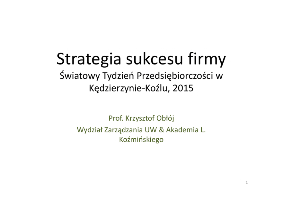 Strategia sukcesu firmy Światowy Tydzień Przedsiębiorczości w Kędzierzynie-Koźlu, 2015 Prof. Krzysztof Obłój Wydział Zarządzania UW & Akademia L. Koźmińskiego 1 Cykl budowy strategii • Strategie mają 3 typowe odsłony bo taki jest cykl życia typowej firmy Strategii prostych reguł – gdy firma rośnie od małego start - upu do SME Strategii doskonalenia firmy czyli wyzwanie Królowej Kier – gdy firma jest dojrzała, ale musi walczyć o utrzymanie szybszego niż branża tempa wzrostu Strategii innowacji czyli okresowej renowacji firmy – gdy firma wpada w nieuniknioną rutynę i skala utrudnia zmianę 2 I. Strategia jako proste reguły • Sukces wielu polskich firm-liderów, małych i dużych, – SMG/KRC (dzisiaj Millward Brown), Kamis, Ambry, Eris, Corporate Profiles, TZMO, Atlasa, Impela, Wieltonu, K2 i wielu innych firm, nie był dziełem skomplikowanych strategii, przełomowych innowacji lub wyjątkowych, charyzmatycznych liderów • Punktem wyjścia sukcesów wielu polskich firm w latach 90tych był przypadek i logika prostych reguł strategicznych 3 Strategia jako proste reguły Wielkie, prawdziwe wyzwania Pamiętaj porażki Wykorzystuj potencjał ludzi Kasuj nieudane eksperymenty Kontroluj kosztów Koncentruj się na ważnych odbiorcach 4 Reguła 1: Stwarzaj jasne wyzwania • Wszystkie najlepsze firmy gdy zaczynały to sięgały dalej niż wydaje się to możliwe. • Ich cele mają charakter zorientowanych zewnętrznie , optymistycznych wyzwań mobilizujących firmy i ludzi. 5 Reguła 2: Marzenia są kosztowne • Najlepsze firmy przestrzegały zasady, że Firma to KOSZTY, KOSZTY i jeszcze raz KOSZTY. • Marzenia wielkich wyzwań są równoważone brutalnymi faktami o biznesowej rzeczywistości. I żelazną regułą jest kontrola kosztów realizacji marzeń. Każde poluźnienie tej reguły oznacza szybko kłopoty. 6 Reguła 3: Eksperymentuj, ale bezlitośnie • Wszystkie najlepsze firmy podejmowały więcej „strategicznych” decyzji niż firmy przeciętne (przeciętnie jedną na rok, w przeciętnych firmach było to jedna na trzy lata). • Firmy przedsiębiorcze EKSPERYMENTUJĄ z nowymi rynkami, produktami, usługami, sposobami zarządzania. • I często są to decyzje błędne! 7 Reguła 4: Wybierz swojego odbiorcę • Wszystkie najlepsze firmy miały obsesję swoich klientów, starając się ich stale zdobywać, usatysfakcjonować, analizować i zrozumieć. Ale nie wszystkich! Najlepsze firmy koncentrują się na klientach, którzy dają im największy potencjał wzrostu, reputację, marże! 8 Reguła 5: Wykorzystuj potencjał pracowników • Reguła jest prosta – ludzie to najcenniejsze aktywa. I to wiedzą prawie wszystkie firmy • Ale najlepsze firmy znały konsekwencje tej reguły – Skoro ludzie to cenne aktywa to powinny być starannie alokowane – najlepsi do najważniejszych zadań i wyzwań. – Najlepsze firmy mają klarowne kryteria oceny pracowników - mobilizują i nagradzają swoich najlepszych ludzi – Problem „Millenialsow” czy problem transparencji i motywacji? 9 Reguła 6: Pamiętaj poważne porażki • Być może najbardziej paradoksalną regułą, która potwierdzała się stale w moich badaniach w Polsce nad najlepszymi firmami, jakkolwiek bym jej nie chciał wyeliminować, była Reguła Poważnych Porażek. • Brzmi ona prosto: Wygrani mieli swoje prawdziwe porażki – często nie jedną – i dobrze je pamiętają jako ‘uczące doświadczenia’. 10 Podsumowanie: Sukces dzięki prostym regułom strategicznym • Proste reguły jako strategia firmy realizują trzy funkcje – ważne zwłaszcza w okresie kiedy firma startuje i jest mała lub staje się średnia: – zapobiegają powstawaniu przedwcześnie ‘dojrzałych’ i ‘skostniałych’ systemów zarządzania – zapewniają jednocześnie kierunek i elastyczność działania – zmuszają do maksymalnej i szybkiej eksploatacji najlepszych zasobów firmy – i tych materialnych i niematerialnych 11 II. Strategia doskonalenia firmy- modelu biznesowego i przewagi konkurencyjnej Przewaga konkurencyjna w domenie rynkowej Zasoby i umiejętności strategiczne (aktywa materialne i niematerialne) Łańcuch wartości: •model Operatora •model Integratora •model Dyrygenta 12 Dwa strategiczne niebezpieczeństwa • Są dwa fundamentalne niebezpieczeństwa w życiu firmy po pionierskim okresie wzrostu dzięki prostym regułom : – Pierwszym jest UTRATA PASJI – Drugim jest UTRATA DYSCYPLINY 13 Dlaczego firmy tracą pasję działania? • Utrata pasji działania i zdolności do marzeń jest pochodną dwóch procesów - występujących zwłaszcza w firmach, które odniosły sukces w pierwszym etapie swojego cyklu życia: – Koncentracji uwagi na zadaniach, a nie na wyzwaniach i szansach – Petryfikacji dominującej logiki (widzenia świata) naczelnego kierownictwa – założeń, modeli poznawczych, rutyn czyli map poznawczych kadry kierowniczej 14 Dlaczego firmy tracą Dyscyplinę? • Utrata dyscypliny najczęściej wiąże się z: –Stawianiem zbyt wielu celów i priorytetów –Rosnącą złożonością firmy i utratą kontroli nad jej realnym funkcjonowaniem 15 Cele strategiczne • W formułowaniu celów strategicznych w danym okresie i miejscu powinna (moim zdaniem) obowiązywać zasada minimum - cel strategiczny w danym okresie powinien być naprawdę tylko jeden lub ostatecznie dwa, precyzyjnie sformułowany (mierzalny), ambitny i dobrze osadzony w czasie. • W innym przypadku bardzo trudno określić hierarchię celów , rozwiązać konflikty pomiędzy nimi i określić priorytety na dany okres. 16 Złożoność jest jak HIV • Firmy wraz z wzrostem obrastają w złożoność dodając i multiplikując rozwiązania: – Komplikuje się i obrasta złożonymi rozwiązaniami (IT!) łańcuch wartości (architektura) firmy – Wielość celów i przedsięwzięć realizowanych jednocześnie – Rośnie liczba i złożoność produktów (sektor finansowy