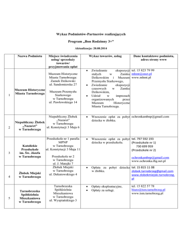 Wykaz Podmiotów-Partnerów realizujących Program „Bon Rodzinny 3+” Aktualizacja: 20.08.2014 Nazwa Podmiotu Miejsce świadczenia usług/ sprzedaży towarów/ przyjmowania opłat Wykaz towarów, usług Muzeum Historyczne Miasta Tarnobrzega: Zamek Dzikowski ul. Sandomierska 27 1 2 3 4 5 Muzeum Historyczne Miasta Tarnobrzega Muzeum Przemysłu Siarkowego w Tarnobrzegu ul. Pawłowskiego 14 Dane kontaktowe podmiotu, adres strony www Zwiedzanie ekspozycji tel. 15 823 79 99 stałych w Zamku [email protected] Dzikowskim i Muzeum www.mhmt.pl Przemysłu Siarkowego, Zwiedzanie ekspozycji czasowych w Zamku Dzikowskim, Udział w imprezach organizowanych przez Muzeum Historyczne Miasta Tarnobrzega. Niepubliczny Żłobek „Nazaret” Niepubliczny Żłobek w Tarnobrzegu „Nazaret” ul. Konstytucji 3 Maja 6 w Tarnobrzegu Wnoszenie opłat za pobyt [email protected] dziecka w żłobku. Przedszkole nr 1 parafia MPNP w Tarnobrzegu ul. Konstytucji 3 Maja 11 Wnoszenie opłat za pobyt tel. 797 592 193 dziecka w przedszkolu. (Przedszkole nr 1) 730 699 959 (Przedszkole nr 2) Katolickie Przedszkole im. Św. Józefa w Tarnobrzegu Żłobek Miejski w Tarnobrzegu Tarnobrzeska Spółdzielnia Mieszkaniowa w Tarnobrzegu Przedszkole nr 2 w Tarnobrzegu ul. J. Matejki 7 Żłobek Miejski w Tarnobrzegu ul. Dekutowskiego 4 Tarnobrzeska Spółdzielnia Mieszkaniowa w Tarnobrzegu ul. Wyspiańskiego 3 [email protected] www.ochronka.tbg.net.pl Opłata za pobyt dziecka tel. 15 815 11 08 w żłobku. [email protected] www.zlobekmiejski.tarnobrzeg. pl Opłaty eksploatacyjne, Opłaty za usługi. tel. 15 822 57 78 [email protected] www.tsm.tarnobrzeg.pl 6 7 8 9 10 11 12 13 Spółdzielnia Mieszkaniowa „SIARKOWIEC” w Tarnobrzegu Spółdzielnia Mieszkaniowa „SIARKOWIEC w Tarnobrzegu ul. Moniuszki 3 Opłaty czynszowe za lokale tel. 15 823 38 88 15 823 38 89 mieszkaniowe. [email protected] miasto Tarnobrzeg Usługi komunikacji tel. 15 814 18 18 [email protected] miejskiej w Tarnobrzegu. Tarnobrzeski Dom Kultury w Tarnobrzegu ul. Słowackiego 2 Opłaty za imprezy oraz tel. 15 822 21 10 zajęcia artystyczne www.tdk.tarnobrzeg.pl organizowane przez TDK. [email protected] Miejski Ośrodek Sportu i Rekreacji w Tarnobrzegu, ul. Al. Niepodległości 2 Opłaty za bilety i karnety tel. 15 822 95 22 wstępu na pływalnię krytą www.mosir.tarnobrzeg.pl [email protected] MOSiR. Gimnazjum Nr 3 w Tarnobrzegu ul. Dekutowskiego 17 Opłaty za obiady szkolne, tel. 15 822 37 36 wycieczki klasowe, bilety [email protected] wstępu, spektakle, konkursy i składki ubezpieczeniowe. Przedszkole Nr 15 w Tarnobrzegu ul. Św. Barbary 20 Opłaty za wyżywienie dzieci uczęszczających do przedszkola oraz opłaty za godziny (ponad 5 godzin podstawy programowej) pobytu dzieci w przedszkolu. Opłaty za zajęcia pływania na obiektach MOSiR oraz za obiady szkolne. tel. 15 823 33 96 Opłaty za przedszkole. tel. 15 822 25 28 [email protected] P.H.U. POLKAR Paulina Szczepanik w Krakowie Tarnobrzeski Dom Kultury w Tarnobrzegu Miejski Ośrodek Sportu i Rekreacji w Tarnobrzegu Gimnazjum Nr 3 w Tarnobrzegu Przedszkole Nr 15 w Tarnobrzegu Szkoła Podstawowa Nr 3 w Tarnobrzegu Szkoła Podstawowa ul. Kochanowskiego 1 Nr 3 w Tarnobrzegu Przedszkole Nr 3 w Tarnobrzegu Przedszkole Nr 3 w Tarnobrzegu ul. Dekutowskiego 2 przedszkole15.tbg.onet.eu przedszkole15.tbg.net.pl tel. 15 823 35 11 [email protected] 14 15 16 Przedszkole Nr 2 w Tarnobrzegu Przedszkole Nr 2 w Tarnobrzegu ul. Kochanowskiego 7 Szkoła Podstawowa Nr 4 w Tarnobrzegu ul. Wyspiańskiego 10 Szkoła Podstawowa Nr 4 w Tarnobrzegu Opłaty za przedszkole. Opłaty za zajęcia pływania tel. 15 822 74 41 [email protected] na obiektach MOSiR, Opłaty za obiady w sp4-tbg.pl stołówce szkolnej, Opłaty za płatne imprezy organizowane w szkole. Przedszkole Nr 1 w Tarnobrzegu ul. Kosmonautów 4 Salon Optyczny w Tarnobrzegu ul. Sikorskiego 2A Salon Optyczny w Tarnobrzegu Zakład Optyczny ul. Pl. B. Głowackiego 19 Grażyna Wojciechowska w Tarnobrzegu 18 19 20 21 Opłaty za pobyt dziecka tel. 15 822 74 10 administracja@przedszkole1. w przedszkolu, tarnobrzeg.pl Opłaty za wyżywienie. Przedszkole Nr 1 w Tarnobrzegu 17 tel. 15 822 37 18 [email protected] www.przedszkole2tbg.pl Przedszkole Nr 4 w Tarnobrzegu Przedszkole Nr 5 w Tarnobrzegu Przedszkole Nr 6 w Tarnobrzegu Tarnobrzeskie Wodociągi Sp. z o.o. w Tarnobrzegu Opłaty za wykonanie okularów korekcyjnych dla dzieci, Opłaty za wykonanie okularów korekcyjnych dla dorosłych, Opłaty za wymianę szkieł w okularach, Opłaty za soczewki kontaktowe i akcesoria, Opłaty za komputerowe badanie wzroku, Dodatkowy rabat 5 % dla rodzin z bonami. Opłaty za pobyt dziecka w przedszkolu. tel. 15 822 20 03 [email protected] www.optyk-tarnobrzeg.pl Przedszkole Nr 4 w Tarnobrzegu ul. Por. Jana Tracza 2 Przedszkole Nr 5 w Tarnobrzegu ul. Dekutowskiego 19 Opłaty za pobyt godzinowy tel. 15 822 40 71 dziecka w przedszkolu [email protected] www.przedszkole5.tarnobrzeg.p (czesne). l Przedszkole Nr 6 w Tarnobrzegu ul. 1-go Maja 14 Opłaty za czesne tel. 15 688 20 67 w przedszkolu, Opłaty za wyżywienie [email protected] dziecka w przedszkolu. Tarnobrzeskie Wodociągi w Tarnobrzegu Biuro Obsługi Klientakasa ul. Wiślna 1 Opłaty przez indywidualnych odbiorców usług, którzy mają podpisane ze Spółką umowy na dostarczenie wody i odbiór ścieków. tel. 15 822 28 36 przedszkole4.niezapominajka@ gmail.com tel. 15 823 22 95 15 823 22 03 [email protected] www.wodociagi.tarnobrzeg.pl 22 23 24 HURTOWNIA „KONTAKT” Krystyna Gburyk w Tarnobrzegu HURTOWNIA „KONTAKT” Krystyna Gburyk w Tarnobrzegu ul. Sandomierska 6 P.P.H.U. „BRAWO”s.c w Tarnobrzegu P.P.H.U. „BRAWO” ul. Dekutowskiego 6 w Tarnobrzegu Firma Handlowa „KWAN” w Tarnobrzegu 25 Księgarnia „BAJKA” s.c. w Tarnobrzegu 26 Przedszkole Integracyjne Nr 9 w Tarnobrzegu 27 MARATON RUN SPORT HURT – SPORT w Tarnobrzegu Opłaty za artykuły szkolne, tel. 15 822 35 50 Opłaty za artykuły biurowe, [email protected] Opłat