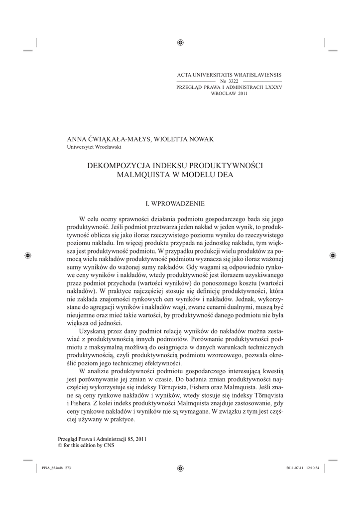 ACTA UNIVERSITATIS WRATISLAVIENSIS ———————— No 3322 ———————— PRZEGLĄD PRAWA I ADMINISTRACJI LXXXV WROCŁAW 2011 ANNA ĆWIĄKAŁA-MAŁYS, WIOLETTA NOWAK Uniwersytet Wrocławski DEKOMPOZYCJA INDEKSU PRODUKTYWNOŚCI MALMQUISTA W MODELU DEA I. WPROWADZENIE W celu oceny sprawności działania podmiotu gospodarczego bada się jego produktywność. Jeśli podmiot przetwarza jeden nakład w jeden wynik, to produktywność oblicza się jako iloraz rzeczywistego poziomu wyniku do rzeczywistego poziomu nakładu. Im więcej produktu przypada na jednostkę nakładu, tym większa jest produktywność podmiotu. W przypadku produkcji wielu produktów za pomocą wielu nakładów produktywność podmiotu wyznacza się jako iloraz ważonej sumy wyników do ważonej sumy nakładów. Gdy wagami są odpowiednio rynkowe ceny wyników i nakładów, wtedy produktywność jest ilorazem uzyskiwanego przez podmiot przychodu (wartości wyników) do ponoszonego kosztu (wartości nakładów). W praktyce najczęściej stosuje się definicję produktywności, która nie zakłada znajomości rynkowych cen wyników i nakładów. Jednak, wykorzystane do agregacji wyników i nakładów wagi, zwane cenami dualnymi, muszą być nieujemne oraz mieć takie wartości, by produktywność danego podmiotu nie była większa od jedności. Uzyskaną przez dany podmiot relację wyników do nakładów można zestawiać z produktywnością innych podmiotów. Porównanie produktywności podmiotu z maksymalną możliwą do osiągnięcia w danych warunkach technicznych produktywnością, czyli produktywnością podmiotu wzorcowego, pozwala określić poziom jego technicznej efektywności. W analizie produktywności podmiotu gospodarczego interesującą kwestią jest porównywanie jej zmian w czasie. Do badania zmian produktywności najczęściej wykorzystuje się indeksy Törnqvista, Fishera oraz Malmquista. Jeśli znane są ceny rynkowe nakładów i wyników, wtedy stosuje się indeksy Törnqvista i Fishera. Z kolei indeks produktywności Malmquista znajduje zastosowanie, gdy ceny rynkowe nakładów i wyników nie są wymagane. W związku z tym jest częściej używany w praktyce. Przegląd Prawa i Administracji 85, 2011 © for this edition by CNS PPiA_85.indb 273 2011-07-11 12:10:34 274 ANNA ĆWIĄKAŁA-MAŁYS, WIOLETTA NOWAK Dla celów analitycznych istotne jest nie tylko porównanie osiąganej przez dany podmiot relacji wyników do nakładów w różnych okresach, ale także analiza czynników, które wywołały zmianę jego produktywności. By ustalić przyczyny zmian produktywności w czasie, stosuje się różne dekompozycje indeksu produktywności Malmquista. Celem niniejszego artykułu jest analiza porównawcza stosowanych w literaturze przedmiotu rozkładów indeksu Malmquista. Dekompozycje indeksu przeprowadza się, wykorzystując metodę granicznej analizy danych. II. GRANICZNA ANALIZA DANYCH Graniczna analiza danych (Data Envelopment Analysis — DEA) jest jedną z najczęściej stosowanych nieparametrycznych metod pomiaru efektywności technicznej. Jej podstawy po raz pierwszy zaprezentowali A. Charnes, W.W. Cooper i E. Rhodes w 1978 roku1. Intensywny rozwój DEA nastąpił w drugiej połowie lat 90. XX wieku. Metoda umożliwia zbadanie efektywności technicznej w grupie podmiotów, które za pomocą wielu nakładów uzyskują wiele wyników. Na podstawie danych empirycznych wyodrębnia się podmioty najbardziej produktywne. Podmioty te wyznaczają krawędź zbioru możliwości produkcyjnych (krzywą efektywności). Jednostki znajdujące się poza tą krzywą są technicznie nieefektywne. W celu wyznaczenia efektywności danego podmiotu rozwiązuje się odpowiednie zadanie programowania liniowego. Na wartość technicznej efektywności ma wpływ rodzaj korzyści skali i orientacji modelu. Ze względu na korzyści skali wyróżnia się modele DEA o stałych i zmiennych korzyściach skali. Kryterium korzyści skali ma wpływ na sposób wyznaczania krzywej efektywności. W modelu DEA o stałych korzyściach skali krzywa efektywności dla podmiotów, które wytwarzają jeden wynik za pomocą jednego nakładu, jest linią prostą o nachyleniu równym produktywności podmiotu wzorcowego. Z kolei w modelu DEA o zmiennych korzyściach skali, krzywa efektywności jest krzywą wypukłą, której wierzchołki tworzą jednostki o najwyższych produktywnościach. Model DEA może być modelem niezorientowanym lub zorientowanym, przy czym kryterium orientacji formułuje się w odniesieniu do nakładów lub wyników. W modelach zorientowanych wartość wyniku efektywności pokazuje zmianę w nakładach lub wynikach, która powoduje, że dany podmiot staje się efektywny. Efektywność techniczna zorientowana na wyniki danego podmiotu jest ilorazem jego produktywności do produktywności podmiotu, który osiąga maksymalny wynik z danego nakładu. Z kolei, efektywność techniczna zorientowana na nakłady 1 A. Charnes, W.W. Cooper, E.L. Rhodes, Measuring the efficiency of decision making units, „European Journal of Operational Research” 1978, nr 2, s. 429–444. Przegląd Prawa i Administracji 85, 2011 © for this edition by CNS PPiA_85.indb 274 2011-07-11 12:10:35 DEKOMPOZYCJA INDEKSU PRODUKTYWNOŚCI MALMQUISTA W MODELU DEA 275 jest ilorazem produktywności danego podmiotu do produktywności podmiotu, który osiąga dany wynik za pomocą minimalnego nakładu2. Miary technicznej efektywności uzyskane w modelach DEA o stałych i zmiennych korzyściach skali wykorzystuje się do wieloczynnikowego rozkładu indeksu produktywności Malmquista. III. SPOSOBY ROZKŁADU INDEKSU PRODUKTYWNOŚCI MALMQUISTA Indeks produktywności Malmquista służy do porównania osiąganej przez dany podmiot relacji wyników do nakładów w dwóch różnych okresach. Jeśli podmiot za pomocą nakładu x otrzymuje wynik y, to indeks ten jest obliczany według wzoru: M= y t+1 /xt+1 , y t /xt (1) gdzie: y t / x t — produktywność p