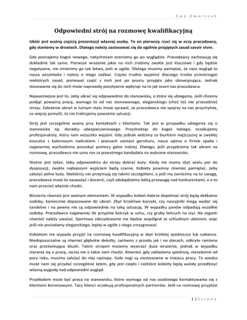 Ewa Dworczak Odpowiedni strój na rozmowę kwalifikacyjną Ubiór jest ważną częścią prezentacji własnej osoby. To on pierwszy rzuci się w oczy pracodawcy, gdy staniemy w drzwiach. Dlatego należy zastosowad się do ogólnie przyjętych zasad savoir vivre. Gdy poznajemy kogoś nowego, natychmiast oceniamy go po wyglądzie. Pracodawcy zachowują się dokładnie tak samo. Pierwsze wrażenie jakie na nich zrobimy zwykle jest kluczowe i gdy będzie negatywne, nie zmienimy go tak łatwo, jeśli w ogóle. Dlatego musimy pamiętad, że nasz wygląd to nasza wizytówka i należy o niego zadbad. Często trudno wyjaśnid dlaczego trzeba przestrzegad niektórych zasad, ponieważ częśd z nich jest po prostu przyjęta jako obowiązująca. Jednak stosowanie się do nich może naprawdę pozytywnie wpłynąd na to jak oceni nas pracodawca. Najważniejsze jest to, żeby ubrad się odpowiednio do stanowiska, o które się ubiegamy. Jeśli chcemy podjąd poważną pracę, wymaga to od nas stonowanego, eleganckiego (chod też nie przesadnie) stroju. Założenie ubrao w luźnym stylu może sprawid, że pracodawca nie spojrzy na nas przychylnie, co więcej pomyśli, że nie traktujemy poważnie sytuacji. Strój jest szczególnie ważny przy kontaktach z klientami. Tak jest w przypadku ubiegania się o stanowisko np. doradcy ubezpieczeniowego. Przychodząc do kogoś takiego, oczekujemy profesjonalisty, który nam wszystko wyjaśni. Gdy jednak widzimy za biurkiem mężczyznę w zwykłej koszulce z kolorowym nadrukiem i jeansach zamiast garnituru, nasza opinia o firmie spada i najpewniej wychodzimy poszukad pomocy gdzie indziej. Dlatego, jeśli przyjdziemy tak ubrani na rozmowę, pracodawca nie uzna nas za poważnego kandydata na wybrane stanowisko. Ważne jest także, żeby odpowiednio do stroju dobrad buty. Kiedy nie mamy zbyt wielu par do dyspozycji, zwykle najlepszym wyjściem będą czarne. Kobiety powinny również pamiętad, żeby założyd pełne buty. Niektórzy nie przejmują się takimi szczegółami, a jeśli my zwrócimy na to uwagę, pracodawca może to zauważyd i docenid, czyli zdobędziemy lekką przewagę nad konkurentami, a o to nam przecież właśnie chodzi. Biżuteria również jest ważnym elementem. W wypadku kobiet dobrze dopełniad strój będą delikatne ozdoby, koniecznie dopasowane do ubrao. Zbyt krzykliwe koczyki, czy naszyjniki mogą wydad się tandetne i na pewno nie są odpowiednie na taką sytuację. W wypadku panów odpadają wszelkie ozdoby. Pracodawca najpewniej źle przyjmie kolczyk w uchu, czy gruby łaocuch na szyi. Na zegarki również należy uważad. Sportowy zdecydowanie nie będzie współgrał ze schludnym ubiorem, więc jeśli nie posiadamy eleganckiego, lepiej w ogóle z niego zrezygnowad. Kobietom nie wypada przyjśd na rozmowę kwalifikacyjną w zbyt krótkiej spódniczce lub sukience. Niedopuszczalne są również głębokie dekolty, zarówno z przodu jak i na plecach, odkryte ramiona oraz prześwitujące bluzki. Takim strojem możemy wywrzed duże wrażenie, jednak w wypadku starania się o pracę, raczej nie o takie nam chodzi. Również, gdy zakładamy spódnicę, niezależnie od pory roku, musimy założyd do niej rajstopy. Gołe nogi są niestosowne w miejscu pracy. Ta wiedza może nam się przydad szczególnie latem, gdy jest ciepło i niektóre kobiety będą wolały przedłożyd własną wygodę nad odpowiedni wygląd. Przykładem może byd praca na stanowisku, które wymaga od nas osobistego kontaktowania się z klientami biznesowymi. Tacy klienci oczekują profesjonalnych partnerów. Jeśli na rozmowę przyjdzie 1|Strona Ewa Dworczak do nich kobieta obwieszona niezliczoną ilością korali, w krótkiej, różowej sukience, pomyślą, że nie są traktowani poważnie i poszukają innego kandydata do współpracy. Firma nie będzie zadowolona, bo na tym straci, dlatego nie zatrudni kogoś takiego na odpowiedzialne stanowisko. Na koniec kilka zasad dotyczących ubioru panów. Po pierwsze do koszuli z krótkim rękawem nie zakłada się ani marynarki ani krawata. O tym trzeba pamiętad szczególnie teraz, kiedy na zewnątrz jest tak gorąco. Gdy niezbędny jest krawat, pilnujemy aby był odpowiedniej długości. Jeśli zakładamy marynarkę, wielkim błędem jest chodzenie w rozpiętej. Rozpinamy ją dopiero przy siadaniu, przy wstawaniu znowu zapinamy. Ten drobny gest może zwrócid uwagę pracodawcy i powiedzied mu, że mamy dobre maniery. Powyższe wskazówki powinny nam nieco przybliżyd jak powinien wyglądad dobrze dobrany strój na rozmowę kwalifikacyjną. Sprawią również, że pracodawca nie skreśli nas jeszcze przed wypowiedzeniem pierwszych słów i spojrzy na nas przychylniej. Ewa Dworczak 2|Strona