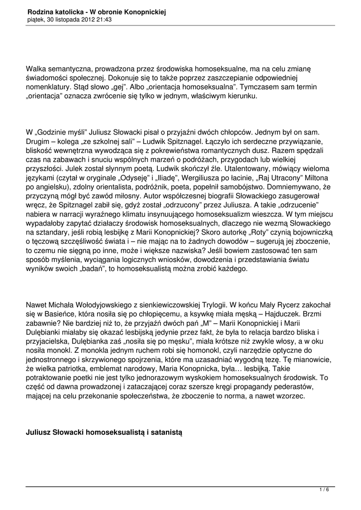 Rodzina katolicka - W obronie Konopnickiej piątek, 30 listopada 2012 21:43 Walka semantyczna, prowadzona przez środowiska homoseksualne, ma na celu zmianę świadomości społecznej. Dokonuje się to także poprzez zaszczepianie odpowiedniej nomenklatury. Stąd słowo „gej”. Albo „orientacja homoseksualna”. Tymczasem sam termin „orientacja” oznacza zwrócenie się tylko w jednym, właściwym kierunku. W „Godzinie myśli” Juliusz Słowacki pisał o przyjaźni dwóch chłopców. Jednym był on sam. Drugim – kolega „ze szkolnej sali” – Ludwik Spitznagel. Łączyło ich serdeczne przywiązanie, bliskość wewnętrzna wywodząca się z pokrewieństwa romantycznych dusz. Razem spędzali czas na zabawach i snuciu wspólnych marzeń o podróżach, przygodach lub wielkiej przyszłości. Julek został słynnym poetą. Ludwik skończył źle. Utalentowany, mówiący wieloma językami (czytał w oryginale „Odyseję” i „Iliadę”, Wergiliusza po łacinie, „Raj Utracony” Miltona po angielsku), zdolny orientalista, podróżnik, poeta, popełnił samobójstwo. Domniemywano, że przyczyną mógł być zawód miłosny. Autor współczesnej biografii Słowackiego zasugerował wręcz, że Spitznagel zabił się, gdyż został „odrzucony” przez Juliusza. A takie „odrzucenie” nabiera w narracji wyraźnego klimatu insynuującego homoseksualizm wieszcza. W tym miejscu wypadałoby zapytać działaczy środowisk homoseksualnych, dlaczego nie wezmą Słowackiego na sztandary, jeśli robią lesbijkę z Marii Konopnickiej? Skoro autorkę „Roty” czynią bojowniczką o tęczową szczęśliwość świata i – nie mając na to żadnych dowodów – sugerują jej zboczenie, to czemu nie sięgną po inne, może i większe nazwiska? Jeśli bowiem zastosować ten sam sposób myślenia, wyciągania logicznych wniosków, dowodzenia i przedstawiania światu wyników swoich „badań”, to homoseksualistą można zrobić każdego. Nawet Michała Wołodyjowskiego z sienkiewiczowskiej Trylogii. W końcu Mały Rycerz zakochał się w Basieńce, która nosiła się po chłopięcemu, a ksywkę miała męską – Hajduczek. Brzmi zabawnie? Nie bardziej niż to, że przyjaźń dwóch pań „M” – Marii Konopnickiej i Marii Dulębianki miałaby się okazać lesbijską jedynie przez fakt, że była to relacja bardzo bliska i przyjacielska, Dulębianka zaś „nosiła się po męsku”, miała krótsze niż zwykle włosy, a w oku nosiła monokl. Z monokla jednym ruchem robi się homonokl, czyli narzędzie optyczne do jednostronnego i skrzywionego spojrzenia, które ma uzasadniać wygodną tezę. Tę mianowicie, że wielka patriotka, emblemat narodowy, Maria Konopnicka, była… lesbijką. Takie potraktowanie poetki nie jest tylko jednorazowym wyskokiem homoseksualnych środowisk. To część od dawna prowadzonej i zataczającej coraz szersze kręgi propagandy pederastów, mającej na celu przekonanie społeczeństwa, że zboczenie to norma, a nawet wzorzec. Juliusz Słowacki homoseksualistą i satanistą 1/6 Rodzina katolicka - W obronie Konopnickiej piątek, 30 listopada 2012 21:43 Taką tezę postawił w biografii, zatytułowanej „Szatanioł”, Jan Zieliński. Według niego, Słowacki już jako młody, „skrajnie ambitny” chłopak marzył o sławie. Poszedł do wileńskiego kościoła (to jakoś biografa nie dziwi, ale cóż, widać pakty z diabłem najlepiej udają się w kościele) i tam miał zawrzeć przymierze z księciem ciemności, sprzedając duszę za chwałę po śmierci, niczym Faust. „O Boże! Daj mi sławę po śmierci, a za to niech będę najnieszczęśliwszym, pogardzonym i nie poznanym w moim życiu”. Zieliński nie zwraca uwagi na fakt, że modlitwa jest skierowana do Boga. Nie myśli o tym, że Słowacki był zakochany w „Naśladowaniu Chrystusa” Tomasza à Kempis, u którego – we wskazówkach do duchowego życia – co rusz znajdują się wskazania, by nie cieszyć się ziemską sławą, lecz myśleć o nagrodzie w niebie. Autor „Szatanioła” wyciąga wniosek następujący: „Modlił się do Boga i aniołów, ale kto inny wysłuchał tej żarliwej prośby. Nie był to pakt z Panem Zastępów czy aniołami, tylko z aniołem upadłym, z Szatanem”. Jeśli ktoś sądzi, że w tej jawnej manipulacji nie da się pójść jeszcze dalej, to się myli. Można. I w zupełnie swobodny sposób dodać Juliuszowi Słowackiemu homoseksualizm jako nutę, która biografię artysty nie tylko wzbogaci, ale wręcz ją uniesie do jakiejś wyższej, uskrzydlonej sodomiczną skazą rangi. Pojawiają się więc w tej biografii nie tylko sugestie dotyczące „dziwnej” przyjaźni ze Spitznaglem, ale wręcz bezpośrednie wskazania, jakoby Słowacki miał doświadczenia homoseksualne. Sposób zaś wyciągania wniosków i prezentowania ich jest identyczny jak w przypadku przypisywanego poecie satanizmu. Niech wystarczy choćby opis znajomości z malarzem o nazwisku Charles Guigon, z którym podobno Słowacki wyprawił się w Alpy. Guigon poszukiwał bratniej duszy i tę właśnie miał znaleźć w osobie naszego wieszcza. Zieliński konkluduje: „Teza moja brzmi tak: S. [Słowacki – przyp. TŁ] zrealizował swój plan i pojechał do Veytaux z Guigonem. Jeśli przemilczał obecność malarza w (skąpej w tym okresie) korespondencji z matką, to może dlatego, że jego przyjaźń z Charles’em Guigonem zbytnio się zacieśniła i nie chciał pani Salomei niepokoić wynaturzeniami natury skrycie lub jawnie homoseksualnej. Może właśnie dlatego podkreślał kilka razy swoją samotność…”. Proszę zwrócić uwagę, co się dzieje. Autor biografii wieszcza narodowego, przygotowanej przez renomowane wydawnictwo WAB, zarzuca jawnie Juliuszowi Słowackiemu, że był homoseksualistą. A dowodem na to ma być fakt, że… nie wspomniał o tym ani słowem matce! Gdy zaś Słowacki pisze do rodzicielki o pewnej młodej Angielce, która „tu mieszkała, przez drzwi t