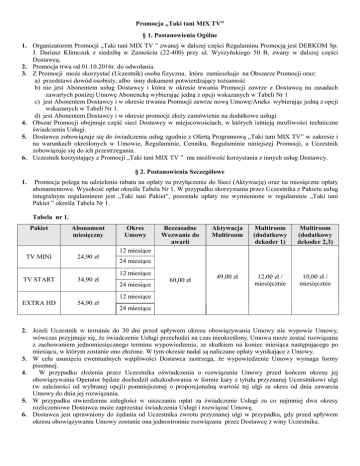 Promocja „Taki tani MIX TV” § 1. Postanowienia Ogólne 1. Organizatorem Promocji „Taki tani MIX TV ” zwanej w dalszej części Regulaminu Promocją jest DERKOM Sp. J. Dariusz Klimczuk z siedzibą w Zamościu (22-400) przy ul. Wyszyńskiego 50 B, zwany w dalszej części Dostawcą. 2. Promocja trwa od 01.10.2016r. do odwołania. 3. Z Promocji może skorzystać (Uczestnik) osoba fizyczna, która zamieszkuje na Obszarze Promocji oraz: a) przedstawi dowód osobisty, albo inny dokument potwierdzający tożsamość b) nie jest Abonentem usług Dostawcy i która w okresie trwania Promocji zawrze z Dostawcą na zasadach zawartych poniżej Umowę Abonencką wybierając jedną z opcji wskazanych w Tabeli Nr 1 c) jest Abonentem Dostawcy i w okresie trwania Promocji zawrze nową Umowę/Aneks wybierając jedną z opcji wskazanych w Tabeli Nr 1. d) jest Abonentem Dostawcy i w okresie promocji złoży zamówienie na dodatkowe usługi 4. Obszar Promocji obejmuje część sieci Dostawcy w miejscowościach, w których istnieją możliwości techniczne świadczenia Usługi. 5. Dostawca zobowiązuje się do świadczenia usług zgodnie z Ofertą Programową „Taki tani MIX TV” w zakresie i na warunkach określonych w Umowie, Regulaminie, Cenniku, Regulaminie niniejszej Promocji, a Uczestnik zobowiązuje się do ich przestrzegania. 6. Uczestnik korzystający z Promocji „Taki tani MIX TV ” ma możliwość korzystania z innych usług Dostawcy. § 2. Postanowienia Szczegółowe 1. Promocja polega na udzieleniu rabatu na opłaty za przyłączenie do Sieci (Aktywację) oraz na miesięczne opłaty abonamentowe. Wysokość opłat określa Tabela Nr 1. W przypadku skorzystania przez Uczestnika z Pakietu usług integralnym regulaminem jest „Taki tani Pakiet”, pozostałe opłaty nie wymienione w regulaminie „Taki tani Pakiet ” określa Tabela Nr 1. Tabela nr 1. Pakiet Abonament miesięczny TV MINI 24,90 zł TV START 34,90 zł EXTRA HD 54,90 zł Okres Umowy Bezzasadne Wezwanie do awarii Aktywacja Multiroom Multiroom (dodatkowy dekoder 1) Multiroom (dodatkowy dekoder 2,3) 49,00 zł 12,00 zł / miesięcznie 10,00 zł / miesięcznie 12 miesiące 24 miesiące 12 miesiące 24 miesiące 60,00 zł 12 miesiące 24 miesiące 2. Jeżeli Uczestnik w terminie do 30 dni przed upływem okresu obowiązywania Umowy nie wypowie Umowy, wówczas przyjmuje się, że świadczenie Usługi przechodzi na czas nieokreślony. Umowa może zostać rozwiązana z zachowaniem jednomiesięcznego terminu wypowiedzenia, ze skutkiem na koniec miesiąca następującego po miesiącu, w którym zostanie ono złożone. W tym okresie nadal są naliczane opłaty wynikające z Umowy. 3. W celu usunięcia ewentualnych wątpliwości Dostawca zastrzega, że wypowiedzenie Umowy wymaga formy pisemnej. 4. W przypadku złożenia przez Uczestnika oświadczenia o rozwiązaniu Umowy przed końcem okresu jej obowiązywania Operator będzie dochodził odszkodowania w formie kary z tytułu przyznanej Uczestnikowi ulgi (w zależności od wybranej opcji) pomniejszonej o proporcjonalną wartość tej ulgi za okres od dnia zawarcia Umowy do dnia jej rozwiązania. 5. W przypadku stwierdzenia zaległości w uiszczaniu opłat za świadczenie Usługi za co najmniej dwa okresy rozliczeniowe Dostawca może zaprzestać świadczenia Usługi i rozwiązać Umowę. 6. Dostawca jest uprawniony do żądania od Uczestnika zwrotu przyznanej ulgi w przypadku, gdy przed upływem okresu obowiązywania Umowy zostanie ona jednostronnie rozwiązana przez Dostawcę z winy Uczestnika. 7. W dniu rozwiązania Umowy Uczestnik jest zobowiązany do bezzwłocznego zwrotu wszystkich urządzeń związanych z Umową, a otrzymanych od Dostawcy na podstawie „Oświadczenia ” lub Protokołu zdawczoodbiorczego stanowiącego integralny załącznik do Umowy. 8. W przypadku gdy zwrot nie jest możliwy lub urządzenia są niekompletne, uszkodzone albo zniszczone, zobowiązany jest do bezzwłocznego uiszczenia opłaty przypisanej takiemu zdarzeniu w wysokości zgodnej z Cennikiem, w terminie nie przekraczającym 30 dni od dnia następującego po dniu rozwiązania umowy. 9. Do świadczenia Usługi w ramach Promocji, zastosowanie mają postanowienia Umowy, Cennika oraz Regulaminu świadczenia usługi dostępu do sieci Internet. § 3. Postanowienia Końcowe 1. Zawierając Umowę Uczestnik oświadcza, że zapoznał się z treścią niniejszego Regulaminu Promocji, akceptuje jego postanowienia i potwierdza odbiór jednego egzemplarza. 2. Regulamin Promocji oraz Oferta Programowa są dostępne w siedzibie oraz w Biurze Obsługi Klienta i stanowią integralną część Umowy Abonenckiej.
