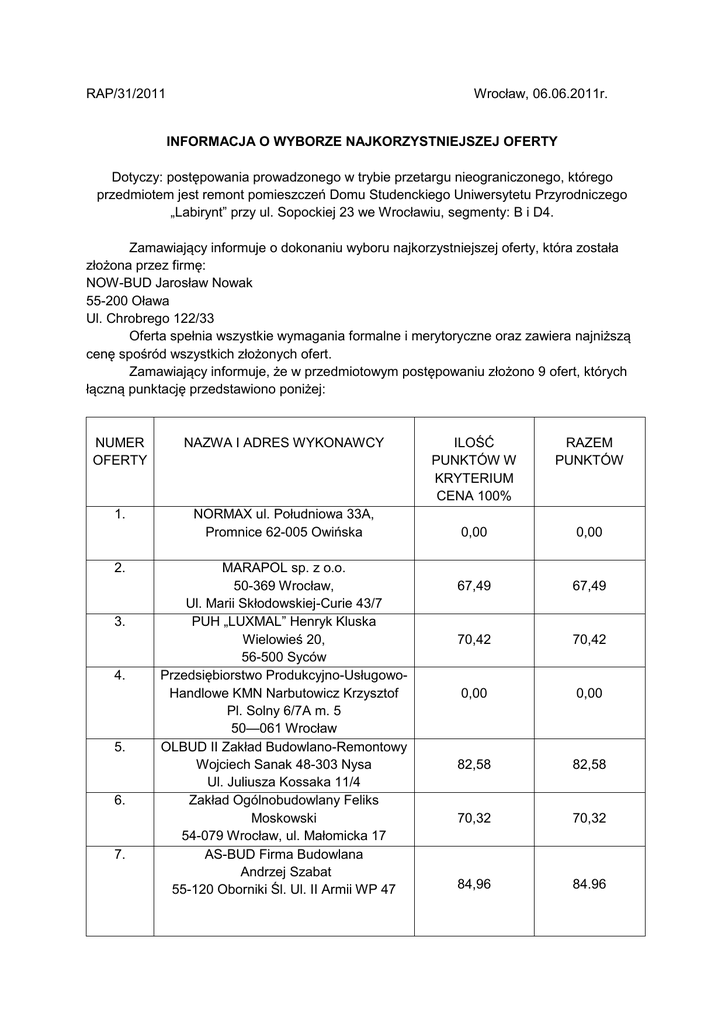Wrocław, 06.06.2011r. RAP/31/2011 INFORMACJA O WYBORZE NAJKORZYSTNIEJSZEJ OFERTY Dotyczy: postępowania prowadzonego w trybie przetargu nieograniczonego, którego przedmiotem jest remont pomieszczeń Domu Studenckiego Uniwersytetu Przyrodniczego „Labirynt” przy ul. Sopockiej 23 we Wrocławiu, segmenty: B i D4. Zamawiający informuje o dokonaniu wyboru najkorzystniejszej oferty, która została złożona przez firmę: NOW-BUD Jarosław Nowak 55-200 Oława Ul. Chrobrego 122/33 Oferta spełnia wszystkie wymagania formalne i merytoryczne oraz zawiera najniższą cenę spośród wszystkich złożonych ofert. Zamawiający informuje, że w przedmiotowym postępowaniu złożono 9 ofert, których łączną punktację przedstawiono poniżej: NUMER OFERTY NAZWA I ADRES WYKONAWCY 1. NORMAX ul. Południowa 33A, Promnice 62-005 Owińska 2. 3. 4. 5. 6. 7. MARAPOL sp. z o.o. 50-369 Wrocław, Ul. Marii Skłodowskiej-Curie 43/7 PUH „LUXMAL” Henryk Kluska Wielowieś 20, 56-500 Syców Przedsiębiorstwo Produkcyjno-UsługowoHandlowe KMN Narbutowicz Krzysztof Pl. Solny 6/7A m. 5 50—061 Wrocław OLBUD II Zakład Budowlano-Remontowy Wojciech Sanak 48-303 Nysa Ul. Juliusza Kossaka 11/4 Zakład Ogólnobudowlany Feliks Moskowski 54-079 Wrocław, ul. Małomicka 17 AS-BUD Firma Budowlana Andrzej Szabat 55-120 Oborniki Śl. Ul. II Armii WP 47 ILOŚĆ PUNKTÓW W KRYTERIUM CENA 100% RAZEM PUNKTÓW 0,00 0,00 67,49 67,49 70,42 70,42 0,00 0,00 82,58 82,58 70,32 70,32 84,96 84.96 8. 9. INWESTREM Biuro Inżynierskie Tadeusz Włostowski, 51-608 Wrocław, Ul. Różyckiego 1c NOW-BUD Jarosław Nowak 55-200 Oława, ul. Chrobrego 122/33 0,00 0,00 100,00 100,00 Z-CA KANCLERZA MGR INŻ. KRZYSZTOF GREMBOWSKI