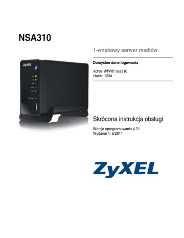 NSA310 1-wnękowy serwer mediów Domyślne dane logowania Adres WWW: nsa310 Hasło: 1234 Skrócona instrukcja obsługi Wersja oprogramowania 4.21 Wydanie 1, 6/2011 Zawartość Panele urządzenia ....................................................................................................................... 1 Wprowadzenie ............................................................................................................................. 2 Zanim zaczniesz .......................................................................................................................... 3 Instalowanie dysku twardego .................................................................................................... 3 Podłączanie urządzenia NSA ..................................................................................................... 6 Uzyskiwanie dostępu do urządzenia NSA310 .......................................................................... 7 Inicjalizacja urządzenia NSA310 ................................................................................................ 8 Logowanie się w urządzeniu NSA ........................................................................................... 11 Gdzie znaleźć certyfikaty zgodności: 1. 2. 3. Wejdź na stronę http://www.zyxel.com/. Na głównej stronie wybierz poszukiwane urządzenie z listy Wybierz rządany certyfikat. NSA310: Skrócona instrukcja obsługi Panele urządzenia 1 NSA310: Skrócona instrukcja obsługi Wprowadzenie Urządzenie NSA310 służy do udostępniania plików oraz tworzenia zapasowych kopii danych w sieci domowej. Możesz również odtwarzać wideo, muzykę oraz zdjęcia przechowywane w urządzeniu NSA310 za pomocą komputera albo multimedialnego urządzenia klienckiego, takiego jak DMA2501. Jak to działa? Powyżej przedstawiono urządzenie NSA w sieci domowej. Użytkownicy udostępniają dane i tworzą kopie zapasowe w urządzeniu NSA310. DMA2501 odtwarza multimedialne pliki z urządzenia NSA310 na telewizorze. Dysk twardy USB zapewnia dodatkowe miejsce na dane, a pliki są kopiowane bezpośrednio z klucza pamięci USB do urządzenia NSA310 za pomocą przycisku COPY/SYNC. Urządzenie NSA należy umieścić za zaporą sieciową albo urządzeniem IDP (Intrusion Detection and Prevention — wykrywanie i zapobieganie włamaniom), aby ochronić je przed atakami z internetu. Szczegółowe informacje o konfigurowaniu wszystkich funkcji urządzenia NSA znajdziesz w instrukcji użytkownika na dołączonej płycie CD. 2 NSA310: Skrócona instrukcja obsługi W tej skróconej instrukcji obsługi wyjaśniono następujące zagadnienia: • instalowanie dysku twardego, • podłączanie urządzenia NSA, • uzyskiwanie dostępu do urządzenia NSA310, • logowanie się w urządzeniu NSA310, • rozwiązywanie problemów. Zanim zaczniesz Potrzebne będą następujące elementy: • urządzenie NSA, • dołączona płyta CD z narzędziem NAS Starter Utility i instrukcją użytkownika, • zasilacz, • dołączony kabel ethernetowy, • jeden dysk twardy zgodny ze standardem SATA II lub SATA III, • dysk twardy i kabel eSATA (opcjonalny), • kabel USB (opcjonalny, potrzebny tylko wtedy, gdy chcesz zwiększyć pojemność przez podłączenie dysków USB); zaleca się, aby zewnętrzne urządzenie USB używało własnego zasilacza, jeśli go ma, • komputer z portem Ethernet, • urządzenie sieciowe takie jak przełącznik, router albo koncentrator (opcjonalnie). Instalowanie dysku twardego Kiedy zainstalujesz dysk twardy w urządzeniu NSA310 i utworzysz wolumin, wszystkie dane znajdujące się na dysku zostaną usunięte. Przed instalacją dysku musisz wyłączyć urządzenie NSA310. 3 NSA310: Skrócona instrukcja obsługi Tworzenie woluminu powoduje sformatowanie dysku twardego. Wszystkie dane zostaną utracone. Zanim zainstalujesz dysk w urządzeniu NSA310, skopiuj wszystkie przechowywane na nim pliki w inne miejsce. 1 Upewnij się, że kabel zasilający i ethernetowy są odłączone od urządzenia NSA. 2 Umieść urządzenie NSA na płaskiej powierzchni spodem do góry. Na panelu dolnym zajmuje się śruba. Poluzuj ją za pomocą śrubokręta z łbem płaskim albo monety. 3 Ustaw urządzenie NSA pionowo i zdejmij przednią pokrywę, aby odsłonić wnękę na dysk, jak na poniższym rysunku. 4 NSA310: Skrócona instrukcja obsługi 4 Wsuń dysk do wnęki, aż poczujesz, że jest dobrze zamocowany wewnątrz urządzenia NSA. 5 Załóż panel przedni, aby zasłonić wnękę na dysk. Umieść urządzenie NSA na płaskiej powierzchni spodem do góry i dokręć śrubę. Jeśli chcesz używać dwóch dysków twardych i skonfigurować je jako wolumin RAID, powinieneś mieć: 1) dysk twardy SATA zainstalowany wewnątrz urządzenia NSA oraz 2) zewnętrzny dysk twardy eSATA wraz z kablem. Aby uzyskać najlepszą wydajność, należy użyć tych samych modeli dysków o jednakowej pojemności. Tworzenie woluminów w urządzeniu NSA opisano w instrukcji użytkownika. Ogólnie rzecz biorąc, w tej konfiguracji jest zalecany jest zakup dwudyskowego modelu NSA. 5 NSA310: Skrócona instrukcja obsługi Podłączanie urządzenia NSA 1 Za pomocą dołączonego kabla ethernetowego podłącz port LAN znajdujący się z tyłu urządzenia NSA do komputera, przełącznika lub routera. 2 Podłącz jeden koniec kabla zasilającego do gniazda POWER znajdującego się z tyłu urządzenia NSA, a drugi do zasilacza. Podłącz zasilacz do gniazdka elektrycznego. Używaj WYŁĄCZNIE zasilacza dostarczonego wraz z urządzeniem! 3 Naciśnij przycisk zasilania umieszczony z przodu urządzenia NSA, aby je włączyć. Przyjrzyj się wskaźnikom na panelu przednim. Jeśli nie zapali się żaden wskaźnik, sprawdź, czy kabel zasilający jest dobrze osadzony w gnieździe i czy źródło prądu jest włączone. • Przycisk zasilania świeci ciągłym, zielonym światłem • Wskaźnik SYS zapala się na zielono po prawidłowym rozruchu u