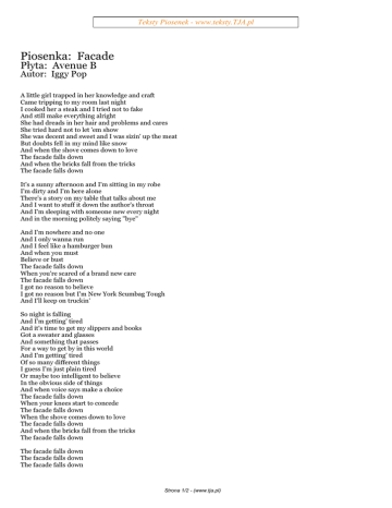 Teksty Piosenek - www.teksty.TJA.pl Piosenka: Facade Płyta: Avenue B Autor: Iggy Pop A little girl trapped in her knowledge and craft Came tripping to my room last night I cooked her a steak and I tried not to fake And still make everything alright She had dreads in her hair and problems and cares She tried hard not to let 'em show She was decent and sweet and I was sizin' up the meat But doubts fell in my mind like snow And when the shove comes down to love The facade falls down And when the bricks fall from the tricks The facade falls down It's a sunny afternoon and I'm sitting in my robe I'm dirty and I'm here alone There's a story on my table that talks about me And I want to stuff it down the author's throat And I'm sleeping with someone new every night And in the morning politely saying "bye" And I'm nowhere and no one And I only wanna run And I feel like a hamburger bun And when you must Believe or bust The facade falls down When you're scared of a brand new care The facade falls down I got no reason to believe I got no reason but I'm New York Scumbag Tough And I'll keep on truckin' So night is falling And I'm getting' tired And it's time to get my slippers and books Got a sweater and glasses And something that passes For a way to get by in this world And I'm getting' tired Of so many different things I guess I'm just plain tired Or maybe too intelligent to believe In the obvious side of things And when voice says make a choice The facade falls down When your knees start to concede The facade falls down When the shove comes down to love The facade falls down And when the bricks fall from the tricks The facade falls down The facade falls down The facade falls down The facade falls down Strona 1/2 - (www.tja.pl) Teksty Piosenek - www.teksty.TJA.pl The facade falls down The facade falls dow ***************************************** Polecamy Strony: www.opisy.tja.pl - Codzienie nowe opisy na GG www.rozmowki.tja.pl - Śmieszne Rozmówki www.tapeciarnia.pl - Mnustwo fajnych tapet na pulpit www.teledyski.tja.pl - Zawsze najnowsze teledyski www.lol2.pl - Śmieszne Filmiki, Kabarety www.wkinach.pl - Co jest grane w kinach ? Strona 2/2 - (www.tja.pl)