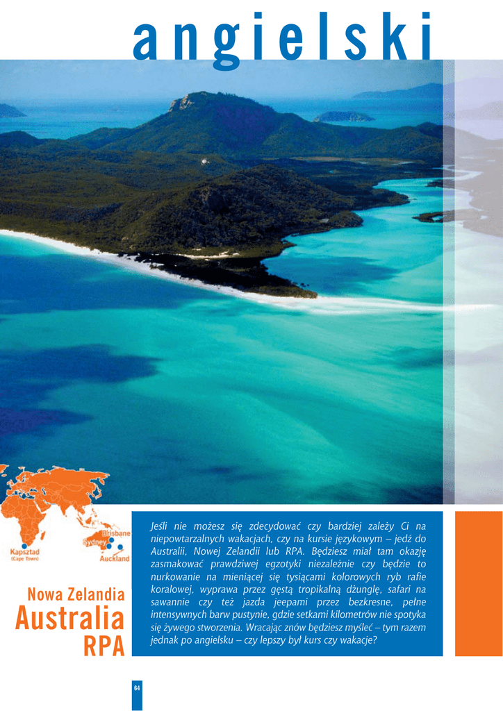 angielski Jeśli nie możesz się zdecydować czy bardziej zależy Ci na niepowtarzalnych wakacjach, czy na kursie językowym – jedź do Australii, Nowej Zelandii lub RPA. Będziesz miał tam okazję zasmakować prawdziwej egzotyki niezależnie czy będzie to nurkowanie na mieniącej się tysiącami kolorowych ryb rafie koralowej, wyprawa przez gęstą tropikalną dżunglę, safari na sawannie czy też jazda jeepami przez bezkresne, pełne intensywnych barw pustynie, gdzie setkami kilometrów nie spotyka się żywego stworzenia. Wracając znów będziesz myśleć – tym razem jednak po angielsku – czy lepszy był kurs czy wakacje? Nowa Zelandia Australia RPA 64 P 012 429 40 51 [email protected] Nowoczesna stolica stanu Queensland – Brisbane pełna jest galerii, kin, muzeów i subtropikalnych ogrodów, a bogate kalendarium wydarzeń kulturalnych sprawia, że nie sposób się tu nudzić. Wzdłuż nadrzecznych bulwarów ciągną się eleganckie sklepy, restauracje, puby i kawiarnie, gdzie spędzają wieczory mieszkańcy miasta, których gościnność i przyjazne nastawienie do obcokrajowców są sławne w całej Australii. Kosmopolityczną i pełną życia atmosferę zawdzięcza Brisbane także znacznej liczbie studentów uczących się na jednym z tutejszych uniwersytetów. Ich obecność sprawia, że miasto tętni życiem przez całą dobę. Kolejnym atutem Brisbane jest jego położenie. Okoliczne plaże należą do najlepszych w Australii i przyciągają amatorów sportów wodnych, w szczególności surfingu, nurkowania, pływania i żeglarstwa. Nie mniejsze atrakcje czekają w głębi lądu, gdzie zbocza górskie porastają wilgotne lasy deszczowe. BRISBANE Sydney uchodzi za jedno z najbardziej spektakularnie położonych miast na świecie. Jego nowoczesna zabudowa otacza błękitne wody zatoki, pośrodku której wyrasta sławny budynek Opera House – symbol i duma miasta. Wokół szklanych wieżowców dominujących w panoramie rozciągają się pełne zieleni niskie domki, których część pochodzi jeszcze z dziewiętnastego wieku. Do dłuższego pobytu zachęca panujący tu przez cały rok łagodny klimat, ciekawa okolica i bogate życie kulturalne. Niezależnie od gustów, każdy może znaleźć coś dla siebie – dla jednych będą to najwyższych lotów spektakle operowe, a dla innych bogate życie nocne dzielnicy Kings Cross. Miłośnicy aktywnego wypoczynku, a w szczególności surfingu i sportów wodnych, mają do dyspozycji świetne australijskie plaże. Miasto cieszy się reputacją jednego z najbezpieczniejszych na świecie, oferuje wysoki standard życia, czyste powietrze i ponad trzysta słonecznych dni w roku. SYDNEY Auckland szczyci się wyjątkowym położeniem - z jednej strony otoczone przez ciepły ocean, a z drugiej przez góry porośnięte subtropikalną roślinnością. W ciągu pół godziny można wydostać się z miasta na jedną z pobliskich plaż, szlak górski czy też którąś z kilkunastu uroczych wysepek. Słoneczny klimat i ciekawa okolica sprawiają, że mieszkańcy Auckland bardzo cenią sobie aktywny wypoczynek. W samym mieście znajduje się kilka bardzo dobrych teatrów i galerii. Bogactwo restauracji serwujących wyśmienitą kuchnię odzwierciedla umiłowanie mieszkańców Auckland do dobrego jedzenia i doskonałych win nowozelandzkich. Wieczorami zapełniają się też liczne tutejsze puby i kluby, gdzie można bawić się do rana przy rytmach polinezyjskiej muzyki. AUCKLAND Jest tylko jedno miejsce na świecie, które może poszczycić się tak dużą liczbą słonecznych dni w roku, mianem najpiękniej położonego miasta świata, wspaniałym morzem oraz wyjątkowo przyjaznymi ludźmi, mówiącymi po angielsku z wyraźnym, łatwym do zrozumienia akcentem. To Kapsztadt, znany także pod angielską nazwą Cape Town. Przyjeżdżając tutaj w środku europejskiej zimy można rozkoszować się pełnią lata, zapachami kwiatów i ciepłym morzem, zaś okoliczne parki narodowe pozwalają zakosztować prawdziwie afrykańskiej przygody. KAPSZTAD 65 sprawdź ceny na www.glossa.pl Australia angielski Brisbane LIR zajęciami oraz popołudniami kursanci chętnie spotykają się w salonie studenckim. Lektorzy LSI Brisbane to posiadający profesjonalne przygotowanie do nauczania native speakerzy. Ich doświadczenie, entuzjazm oraz znajomość różnorodnych metod i technik dydaktycznych gwarantuje skuteczną naukę w przyjaznej atmosferze. Wszyscy nauczyciele systematycznie uczestniczą w szkoleniach i seminariach, gdzie doskonalą swój warsztat oraz zapoznają się z najnowszymi trendami metodycznymi i materiałami dydaktycznymi. Zajęcia prowadzone są w międzynarodowych grupach, dzięki czemu studenci są zmuszeni do używania na co dzień Oddział LSI Brisbane położony jest w samym centrum miasta, blisko modnych sklepów i restauracji. Szkoła zajmuje pierwsze i drugie piętro zabytkowego budynku, który zachowując swój urok, został gruntownie zmodernizowany i dostosowany do potrzeb centrum językowego. Sale lekcyjne są przestronne i dobrze wyposażone w pomoce naukowe (magnetofony, rzutniki pisma, sprzęt wideo). Wszystkie klasy posiadają klimatyzację. Dodatkowo do dyspozycji studentów jest bogata biblioteka oraz multimedialne laboratorium językowe z dostępem do Internetu. W przerwach między akredytacje: NEAS, English Australia .................................................................. zakwaterowanie: rodzina, akademik .................................................................. liczba studentów z Polski: 1% .................................................................. WiFi LSI Brisbane długość godziny lekcyjnej: 50 minut $ OFERTA SPECJALNA wyłącznie języka angielskiego. Bezpośrednio przed rozpoczęciem kursu każdy student musi napisać test wstępny i odbyć rozmowę z lektorem w celu określenia poziomu językowego. Szkoła dba, aby słuchacze możliwie mocno integrowali się ze sobą oraz całym ang