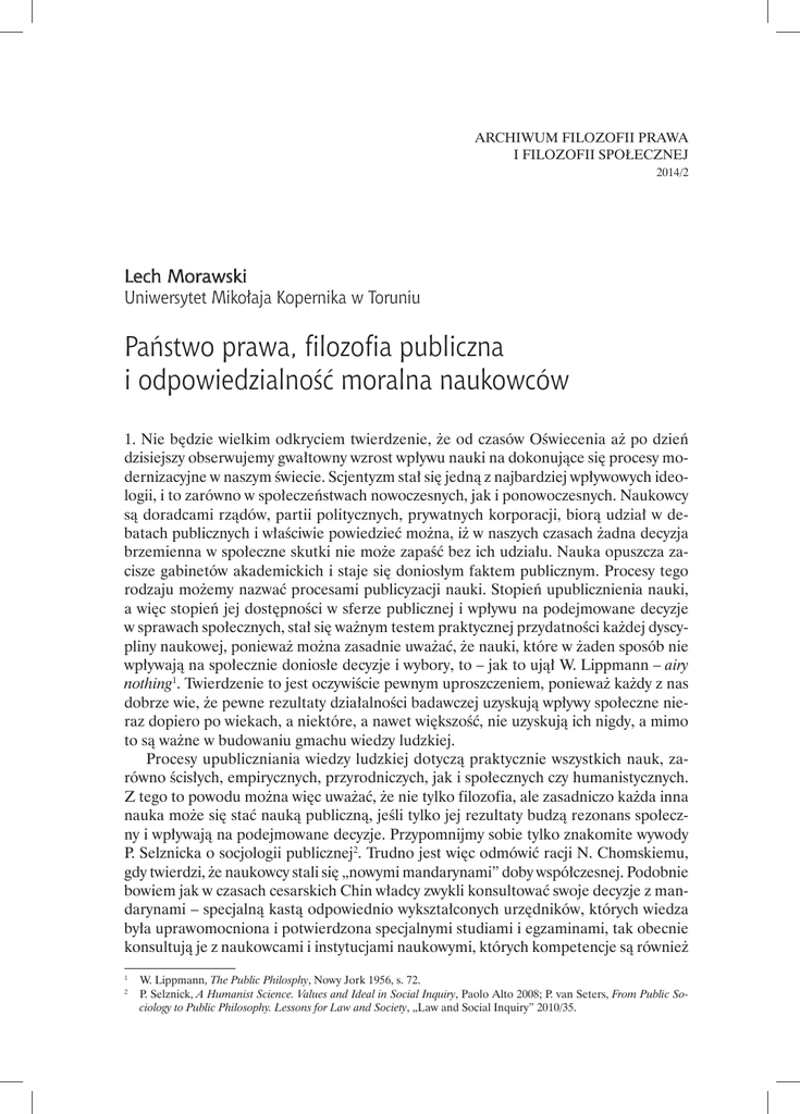 Państwo prawa, filozofia publiczna i odpowiedzialność moralna naukowców 85 ARCHIWUM FILOZOFII PRAWA I FILOZOFII SPOŁECZNEJ 2014/2 Lech Morawski Uniwersytet Mikołaja Kopernika w Toruniu Państwo prawa, filozofia publiczna i odpowiedzialność moralna naukowców 1. Nie będzie wielkim odkryciem twierdzenie, że od czasów Oświecenia aż po dzień dzisiejszy obserwujemy gwałtowny wzrost wpływu nauki na dokonujące się procesy modernizacyjne w naszym świecie. Scjentyzm stał się jedną z najbardziej wpływowych ideologii, i to zarówno w społeczeństwach nowoczesnych, jak i ponowoczesnych. Naukowcy są doradcami rządów, partii politycznych, prywatnych korporacji, biorą udział w debatach publicznych i właściwie powiedzieć można, iż w naszych czasach żadna decyzja brzemienna w społeczne skutki nie może zapaść bez ich udziału. Nauka opuszcza zacisze gabinetów akademickich i staje się doniosłym faktem publicznym. Procesy tego rodzaju możemy nazwać procesami publicyzacji nauki. Stopień upublicznienia nauki, a więc stopień jej dostępności w sferze publicznej i wpływu na podejmowane decyzje w sprawach społecznych, stał się ważnym testem praktycznej przydatności każdej dyscypliny naukowej, ponieważ można zasadnie uważać, że nauki, które w żaden sposób nie wpływają na społecznie doniosłe decyzje i wybory, to – jak to ujął W. Lippmann – airy nothing1. Twierdzenie to jest oczywiście pewnym uproszczeniem, ponieważ każdy z nas dobrze wie, że pewne rezultaty działalności badawczej uzyskują wpływy społeczne nieraz dopiero po wiekach, a niektóre, a nawet większość, nie uzyskują ich nigdy, a mimo to są ważne w budowaniu gmachu wiedzy ludzkiej. Procesy upubliczniania wiedzy ludzkiej dotyczą praktycznie wszystkich nauk, zarówno ścisłych, empirycznych, przyrodniczych, jak i społecznych czy humanistycznych. Z tego to powodu można więc uważać, że nie tylko filozofia, ale zasadniczo każda inna nauka może się stać nauką publiczną, jeśli tylko jej rezultaty budzą rezonans społeczny i wpływają na podejmowane decyzje. Przypomnijmy sobie tylko znakomite wywody P. Selznicka o socjologii publicznej2. Trudno jest więc odmówić racji N. Chomskiemu, gdy twierdzi, że naukowcy stali się „nowymi mandarynami” doby współczesnej. Podobnie bowiem jak w czasach cesarskich Chin władcy zwykli konsultować swoje decyzje z mandarynami – specjalną kastą odpowiednio wykształconych urzędników, których wiedza była uprawomocniona i potwierdzona specjalnymi studiami i egzaminami, tak obecnie konsultują je z naukowcami i instytucjami naukowymi, których kompetencje są również 1 2 W. Lippmann, The Public Philosphy, Nowy Jork 1956, s. 72. P. Selznick, A Humanist Science. Values and Ideal in Social Inquiry, Paolo Alto 2008; P. van Seters, From Public Sociology to Public Philosophy. Lessons for Law and Society, „Law and Social Inquiry” 2010/35. 86 Lech Morawski administracyjnie potwierdzone3. Trudno byłoby dzisiaj wskazać istotne w sprawach społecznych decyzje, które zapadłyby bez jakiegokolwiek udziału naukowców. Drugim ważnym powodem wzrostu znaczenia nauki i naukowców w życiu publicznym stała się rewolucja informacyjna i komunikacyjna, która przynajmniej w społeczeństwach rozwiniętych stwarza niezmiernie szerokie możliwości dostępu do informacji nieomal wszystkim obywatelom i instytucjom. O ile dawna agora dawała tylko ograniczone możliwości udziału obywateli w życiu publicznym, w istocie rzeczy ograniczone do małych społeczności lokalnych, o tyle współczesne media, telewizja, radio, prasa, a w szczególności internet, dają wręcz nieograniczone możliwości komunikowania się wszystkich ze wszystkimi i wyrażania swoich opinii w ważnych sprawach społecznych. Wraz ze wzrostem wykształcenia w krajach zachodnich obywatele coraz częściej korzystają z tej możliwości. Trzecim powodem, który stymuluje wzrost udziału nauki i naukowców w procesach podejmowania społecznie doniosłych decyzji, jest dokonująca się na naszych oczach przemiana charakteru demokracji w państwach zachodnich. Procesy te zwykło się nazywać ewolucją współczesnych systemów konstytucyjnych od systemów opartych na demokracji reprezentatywnej, w której akt uczestnictwa zwykłych obywateli w życiu publicznym ogranicza się do periodycznie powtarzających się aktów głosowania, do różnorakich form demokracji deliberatywnej i partycypacyjnej, w której obywatele biorą bezpośredni udział w procesach wymiany argumentów i podejmowania decyzji w sprawach publicznych4. Jak sądzę, to właśnie w kontekście tych trzech faktów, a mianowicie rosnącej scjentyzacji społeczeństw nowoczesnych i ponowoczesnych, rewolucji informatycznej i komunikacyjnej oraz rozwoju różnych instrumentów demokracji deliberatywnej i partycypującej, należy rozpatrywać zjawisko renesansu filozofii publicznej w naszych czasach. Mówimy o renesansie, a nie powstaniu filozofii publicznej, ponieważ komentowanie ważnych wydarzeń publicznych przez filozofów i innych naukowców towarzyszy myśli ludzkiej już od czasów starożytnych, a takie zjawiska jak scjentyzm czy rewolucja komunikacyjna nadały temu zjawisku tylko szczególnego impetu. Nieprzypadkowo mówi się o tradycji sokratejskiej w filozofii Zachodu, ponieważ Sokrates jest powszechnie uważany za jednego z pierwszych filozofów, który uczynił ze swojej filozofii sprawę publiczną. Właściwie w każdej epoce istnieli filozofowie, którzy byli głęboko zainteresowani sprawami publicznymi i dawali temu wyraz w wystąpieniach publicznych. Do wielkich przedstawicieli filozofii publicznej zalicza się tej miary filozofów i myślicieli co Sokrates, Platon, Rousseau, Wolter, K. Marks, J.S. Mill czy M. Weber. W czasach nam najbliższych najwybitniejsi przedstawiciele tego sposobu filozofowania to H. Arendt, J. Dewey, J. Habermas, M. Sandel i M. Rorty5. W większo