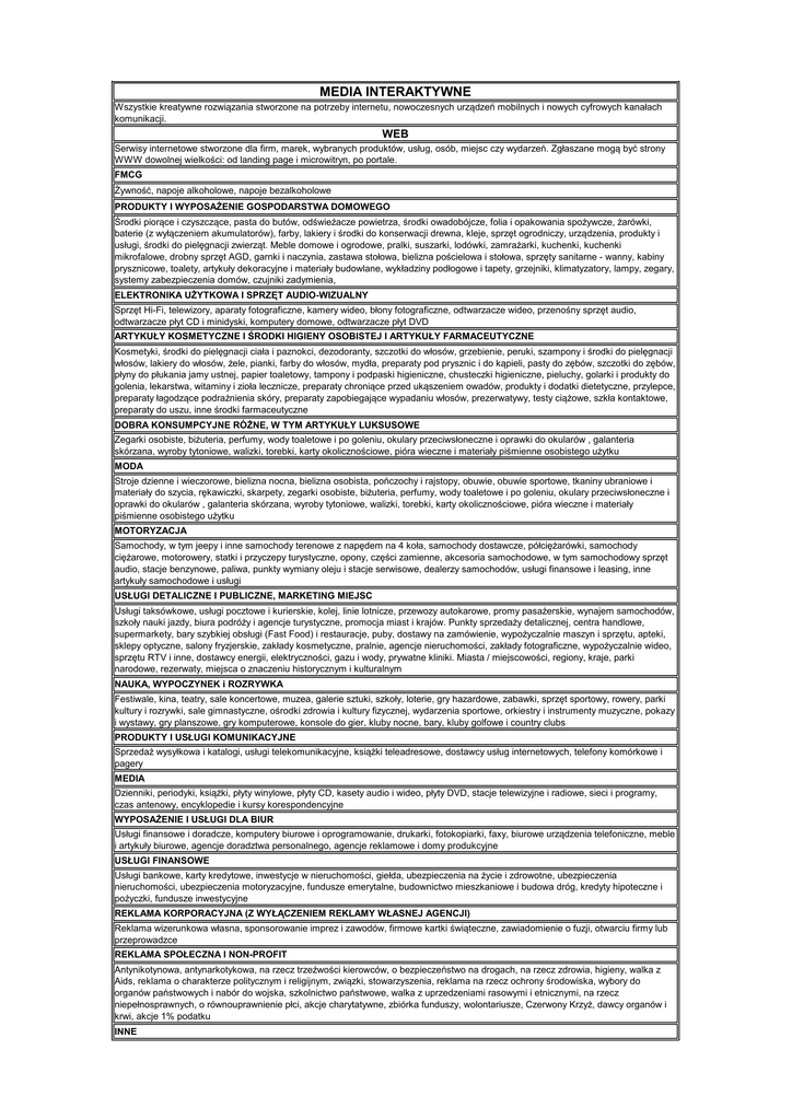 MEDIA INTERAKTYWNE Wszystkie kreatywne rozwiązania stworzone na potrzeby internetu, nowoczesnych urządzeń mobilnych i nowych cyfrowych kanałach komunikacji. WEB Serwisy internetowe stworzone dla firm, marek, wybranych produktów, usług, osób, miejsc czy wydarzeń. Zgłaszane mogą być strony WWW dowolnej wielkości: od landing page i microwitryn, po portale. FMCG Żywność, napoje alkoholowe, napoje bezalkoholowe PRODUKTY I WYPOSAŻENIE GOSPODARSTWA DOMOWEGO Środki piorące i czyszczące, pasta do butów, odświeżacze powietrza, środki owadobójcze, folia i opakowania spożywcze, żarówki, baterie (z wyłączeniem akumulatorów), farby, lakiery i środki do konserwacji drewna, kleje, sprzęt ogrodniczy, urządzenia, produkty i usługi, środki do pielęgnacji zwierząt. Meble domowe i ogrodowe, pralki, suszarki, lodówki, zamrażarki, kuchenki, kuchenki mikrofalowe, drobny sprzęt AGD, garnki i naczynia, zastawa stołowa, bielizna pościelowa i stołowa, sprzęty sanitarne - wanny, kabiny prysznicowe, toalety, artykuły dekoracyjne i materiały budowlane, wykładziny podłogowe i tapety, grzejniki, klimatyzatory, lampy, zegary, systemy zabezpieczenia domów, czujniki zadymienia, ELEKTRONIKA UŻYTKOWA I SPRZĘT AUDIO-WIZUALNY Sprzęt Hi-Fi, telewizory, aparaty fotograficzne, kamery wideo, błony fotograficzne, odtwarzacze wideo, przenośny sprzęt audio, odtwarzacze płyt CD i minidyski, komputery domowe, odtwarzacze płyt DVD ARTYKUŁY KOSMETYCZNE I ŚRODKI HIGIENY OSOBISTEJ I ARTYKUŁY FARMACEUTYCZNE Kosmetyki, środki do pielęgnacji ciała i paznokci, dezodoranty, szczotki do włosów, grzebienie, peruki, szampony i środki do pielęgnacji włosów, lakiery do włosów, żele, pianki, farby do włosów, mydła, preparaty pod prysznic i do kąpieli, pasty do zębów, szczotki do zębów, płyny do płukania jamy ustnej, papier toaletowy, tampony i podpaski higieniczne, chusteczki higieniczne, pieluchy, golarki i produkty do golenia, lekarstwa, witaminy i zioła lecznicze, preparaty chroniące przed ukąszeniem owadów, produkty i dodatki dietetyczne, przylepce, preparaty łagodzące podrażnienia skóry, preparaty zapobiegające wypadaniu włosów, prezerwatywy, testy ciążowe, szkła kontaktowe, preparaty do uszu, inne środki farmaceutyczne DOBRA KONSUMPCYJNE RÓŻNE, W TYM ARTYKUŁY LUKSUSOWE Zegarki osobiste, biżuteria, perfumy, wody toaletowe i po goleniu, okulary przeciwsłoneczne i oprawki do okularów , galanteria skórzana, wyroby tytoniowe, walizki, torebki, karty okolicznościowe, pióra wieczne i materiały piśmienne osobistego użytku MODA Stroje dzienne i wieczorowe, bielizna nocna, bielizna osobista, pończochy i rajstopy, obuwie, obuwie sportowe, tkaniny ubraniowe i materiały do szycia, rękawiczki, skarpety, zegarki osobiste, biżuteria, perfumy, wody toaletowe i po goleniu, okulary przeciwsłoneczne i oprawki do okularów , galanteria skórzana, wyroby tytoniowe, walizki, torebki, karty okolicznościowe, pióra wieczne i materiały piśmienne osobistego użytku MOTORYZACJA Samochody, w tym jeepy i inne samochody terenowe z napędem na 4 koła, samochody dostawcze, półciężarówki, samochody ciężarowe, motorowery, statki i przyczepy turystyczne, opony, części zamienne, akcesoria samochodowe, w tym samochodowy sprzęt audio, stacje benzynowe, paliwa, punkty wymiany oleju i stacje serwisowe, dealerzy samochodów, usługi finansowe i leasing, inne artykuły samochodowe i usługi USŁUGI DETALICZNE I PUBLICZNE, MARKETING MIEJSC Usługi taksówkowe, usługi pocztowe i kurierskie, kolej, linie lotnicze, przewozy autokarowe, promy pasażerskie, wynajem samochodów, szkoły nauki jazdy, biura podróży i agencje turystyczne, promocja miast i krajów. Punkty sprzedaży detalicznej, centra handlowe, supermarkety, bary szybkiej obsługi (Fast Food) i restauracje, puby, dostawy na zamówienie, wypożyczalnie maszyn i sprzętu, apteki, sklepy optyczne, salony fryzjerskie, zakłady kosmetyczne, pralnie, agencje nieruchomości, zakłady fotograficzne, wypożyczalnie wideo, sprzętu RTV i inne, dostawcy energii, elektryczności, gazu i wody, prywatne kliniki. Miasta / miejscowości, regiony, kraje, parki narodowe, rezerwaty, miejsca o znaczeniu historycznym i kulturalnym NAUKA, WYPOCZYNEK i ROZRYWKA Festiwale, kina, teatry, sale koncertowe, muzea, galerie sztuki, szkoły, loterie, gry hazardowe, zabawki, sprzęt sportowy, rowery, parki kultury i rozrywki, sale gimnastyczne, ośrodki zdrowia i kultury fizycznej, wydarzenia sportowe, orkiestry i instrumenty muzyczne, pokazy i wystawy, gry planszowe, gry komputerowe, konsole do gier, kluby nocne, bary, kluby golfowe i country clubs PRODUKTY I USŁUGI KOMUNIKACYJNE Sprzedaż wysyłkowa i katalogi, usługi telekomunikacyjne, książki teleadresowe, dostawcy usług internetowych, telefony komórkowe i pagery MEDIA Dzienniki, periodyki, książki, płyty winylowe, płyty CD, kasety audio i wideo, płyty DVD, stacje telewizyjne i radiowe, sieci i programy, czas antenowy, encyklopedie i kursy korespondencyjne WYPOSAŻENIE I USŁUGI DLA BIUR Usługi finansowe i doradcze, komputery biurowe i oprogramowanie, drukarki, fotokopiarki, faxy, biurowe urządzenia telefoniczne, meble i artykuły biurowe, agencje doradztwa personalnego, agencje reklamowe i domy produkcyjne USŁUGI FINANSOWE Usługi bankowe, karty kredytowe, inwestycje w nieruchomości, giełda, ubezpieczenia na życie i zdrowotne, ubezpieczenia nieruchomości, ubezpieczenia motoryzacyjne, fundusze emerytalne, budownictwo mieszkaniowe i budowa dróg, kredyty hipoteczne i pożyczki, fundusze inwestycyjne REKLAMA KORPORACYJNA (Z WYŁĄCZENIEM REKLAMY WŁASNEJ AGENCJI) Reklama wizerunkowa własna, sponsorowanie imprez i zawodów, firmowe kartki świąteczne, zawiadomienie o fuzji, otwarciu firmy lub przeprowadzce REKLAMA SPOŁECZNA I NON-PROFIT Antynikotynowa, antynarkotykowa, na rzecz trzeźwości kierowców, o bezpieczeństwo na drogach, na rzecz zdrowia, higieny, wa