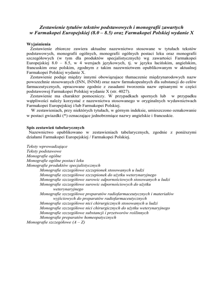 Zestawienie tytułów tekstów podstawowych i monografii zawartych w Farmakopei Europejskiej (8.0 – 8.5) oraz Farmakopei Polskiej wydanie X Wyjaśnienia Zestawienie zbiorcze zawiera aktualne nazewnictwo stosowane w tytułach tekstów podstawowych, monografii ogólnych, monografii ogólnych postaci leku oraz monografii szczegółowych (w tym dla produktów specjalistycznych) wg zawartości Farmakopei Europejskiej 8.0 – 8.5, w 4 wersjach językowych, tj. w języku łacińskim, angielskim, francuskim oraz polskim, zgodnym z takim nazewnictwem opublikowanym w aktualnej Farmakopei Polskiej wydanie X. Zestawienie podaje między innymi obowiązujace tłumaczenie międzynarodowych nazw powszechnie stosowanych (INN, INNM) oraz nazw farmakopealnych dla substancji do celów farmaceutycznych, opracowane zgodnie z zasadami tworzenia nazw opisanymi w części podstawowej Farmakopei Polskiej wydanie X (str. 4027). Zestawienie ma charakter pomocniczy. W przypadkach spornych lub w przypadku wątpliwości należy korzystać z nazewnictwa stosowanego w oryginalnych wydawnictwach Farmakopei Europejskiej i/lub Farmakopei Polskiej. W zestawieniach, przy niektórych tytułach, w górnym indeksie, umieszczono oznakowanie w postaci gwiazdki (*) oznaczające jednobrzmiące nazwy angielskie i francuskie. Spis zestawień tabelarycznych Nazewnictwo opublikowano w zestawieniach tabelarycznych, zgodnie z poniższymi działami Farmakopei Europejskiej / Farmakopei Polskiej. Teksty wprowadzające Teksty podstawowe Monografie ogólne Monografie ogólne postaci leku Monografie produktów specjalistycznych Monografie szczegółowe szczepionek stosowanych u ludzi Monografie szczegółowe szczepionek do użytku weterynaryjnego Monografie szczegółowe surowic odpornościowych stosowanych u ludzi Monografie szczegółowe surowic odpornościowych do użytku weterynaryjnego Monografie szczegółowe preparatów radiofarmaceutycznych i materiałów wyjściowych do preparatów radiofarmaceutycznych Monografie szczegółowe nici chirurgicznych stosowanych u ludzi Monografie szczegółowe nici chirurgicznych do użytku weterynaryjnego Monografie szczegółowe substancji i przetworów roślinnych Monografie preparatów homeopatycznych Monografie szczegółowe (A – Z)