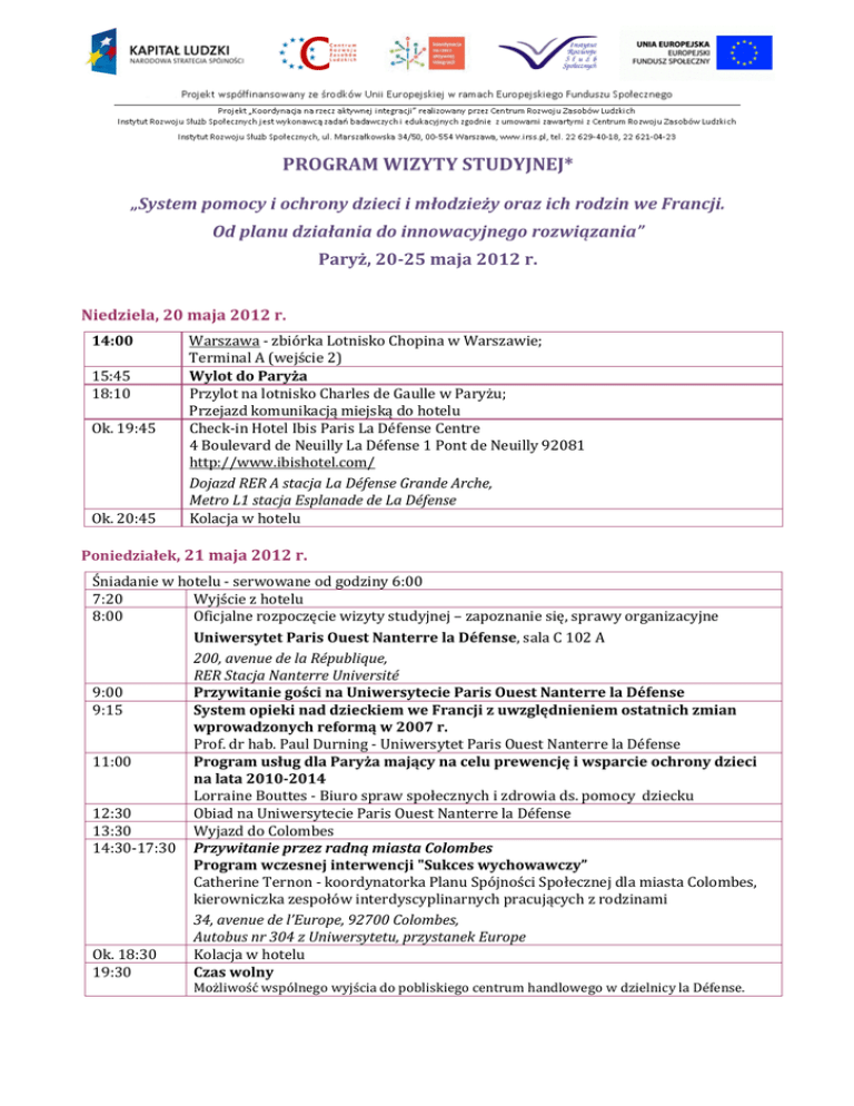 PROGRAM WIZYTY STUDYJNEJ* „System pomocy i ochrony dzieci i młodzieży oraz ich rodzin we Francji. Od planu działania do innowacyjnego rozwiązania” Paryż, 20-25 maja 2012 r. Niedziela, 20 maja 2012 r. 14:00 15:45 18:10 Ok. 19:45 Ok. 20:45 Warszawa - zbiórka Lotnisko Chopina w Warszawie; Terminal A (wejście 2) Wylot do Paryża Przylot na lotnisko Charles de Gaulle w Paryżu; Przejazd komunikacją miejską do hotelu Check-in Hotel Ibis Paris La Défense Centre 4 Boulevard de Neuilly La Défense 1 Pont de Neuilly 92081 http://www.ibishotel.com/ Dojazd RER A stacja La Défense Grande Arche, Metro L1 stacja Esplanade de La Défense Kolacja w hotelu Poniedziałek, 21 maja 2012 r. Śniadanie w hotelu - serwowane od godziny 6:00 7:20 Wyjście z hotelu 8:00 Oficjalne rozpoczęcie wizyty studyjnej – zapoznanie się, sprawy organizacyjne Uniwersytet Paris Ouest Nanterre la Défense, sala C 102 A 200, avenue de la République, RER Stacja Nanterre Université 9:00 Przywitanie gości na Uniwersytecie Paris Ouest Nanterre la Défense 9:15 System opieki nad dzieckiem we Francji z uwzględnieniem ostatnich zmian wprowadzonych reformą w 2007 r. Prof. dr hab. Paul Durning - Uniwersytet Paris Ouest Nanterre la Défense 11:00 Program usług dla Paryża mający na celu prewencję i wsparcie ochrony dzieci na lata 2010-2014 Lorraine Bouttes - Biuro spraw społecznych i zdrowia ds. pomocy dziecku 12:30 Obiad na Uniwersytecie Paris Ouest Nanterre la Défense 13:30 Wyjazd do Colombes 14:30-17:30 Przywitanie przez radną miasta Colombes Program wczesnej interwencji "Sukces wychowawczy” Catherine Ternon - koordynatorka Planu Spójności Społecznej dla miasta Colombes, kierowniczka zespołów interdyscyplinarnych pracujących z rodzinami 34, avenue de l’Europe, 92700 Colombes, Autobus nr 304 z Uniwersytetu, przystanek Europe Ok. 18:30 Kolacja w hotelu 19:30 Czas wolny Możliwość wspólnego wyjścia do pobliskiego centrum handlowego w dzielnicy la Défense. Wtorek, 22 maja 2012 r. Śniadanie w hotelu - serwowane od godziny 6:00 8:00 Wyjście z hotelu 9:00 Wizyta w wielofunkcyjnym ośrodku Jenner - Stowarzyszenie Jean Coxtet Historia, zadania, struktura wewnętrzna Stowarzyszenia Jean Coxtet Jean Pineau - Dyrektor Generalny, Alain Griffond - Zastępca Dyrektora Generalnego 37, rue Jenner, 75013 Paris, Metro L5 stacja Campo-Formio 10:30 Działania pomocowe ośrodek Jenner (dom dziecka, wychowawczy ośrodek pobytu dziennego SAJE, ośrodek pobytu częściowego PHARE) 12:30 Obiad Ok. 13:30 Wyjazd z ośrodka 15:00 Grupa 1. 15:00 Grupa 2. Wizyta w Ośrodku wychowawczym Villa Wizyta w Ośrodku pomocy środowiskowej dla Preaut Stowarzyszenia Jean Cotxet pełnoletnich wychowanków ośrodków wychowawczych 2, ter rue de Coeuilly, Villiers sur Marne, RER E stacja Villiers-sur-Marne Plessis-Trevise 38 Rue des Amandier,s 75020 Paris, Metro L2 lub L3 stacja metra Père Lachaise 18:00 Kolacja przygotowana przez młodzież ze stowarzyszenia AJAM (Association des jeunes amis du Marais), spotkanie i dyskusja z grupą i pracownikami. 62, bd Magenta 75010 Paris Metro L5 stacja Jacques Bonsergent Środa, 23 maja 2012 r. Śniadanie w hotelu - serwowane od godziny 6:00 7:45 Wyjście z hotelu 9:15-12:30 Wizyta w siedzibie Rady Departamentu Val d'Oise Przedstawienie planu usług w obszarze prewencji zagrożeń dziecka i rodziny Stéphanie Defeux - koordynatorka Planu działań Spotkanie z radnymi departamentu 13:00-14:00 15:00-17:00 18:00-19:45 20:00 Spotkanie z pracownikami stowarzyszenia "Od strony kobiet" przeciwdziałającemu przemocy w rodzinie RER A stacja Cergy Prefecture Obiad w restauracji "Restaurant administratif du Parc" 2, avenue du Parc, 95032 Cergy RER A stacja Cergy Prefecture Grupa 2. Grupa 1. Wizyta w Schronisku dla samotnych Wizyta w Służbach społecznych na rzecz matek imienia Marie Bequet de Vienne dzieci Stowarzyszenia Olgi Spitzer 9 bis, rue Jean- Baptiste Dumas 75017 28 rue Salvador Allende 92000 Nanterre, Paris, RER A stacja Nanterre Prefecture Metro L3 stacja Porte de Champerret Czas wolny-okolice dzielnicy Montmartre. Możliwość kupna pamiątek. Uroczysta kolacja przygotowana przez Délices de la Villa - młodzież i profesjonalistów z ośrodka Villa Préaut. Ośrodek wychowawczy Sacré Coeur Stowarzyszenia Jean Cotxet Maison du Sacré-Cœur, 12 rue Saint Rustique à Paris, Metro L12 stacja Lamarck - Caulaincourt Czwartek, 24 maja 2012 r. Śniadanie w hotelu - serwowane od godziny 6:00 8:30 Wyjazd z hotelu 09:30-12:00 Grupa 1. Wizyta w Ośrodku pieczy zastępczej (rodziny zastępcze) Stowarzyszenia Jean Coxtet 34 Rue Paradis, 75010 Paris, Metro L7 stacja Poissonnière 13:00-14:00 14:00-16:00 Ok. 16:15 Grupa 2. Wizyta w Służbach pomocy środowiskowej (z ramienia służb społecznych i z ramienia sądu) Stowarzyszenia Jean Coxtet 49/49 bis, rue de Lancry, 75010 Paris, Metro L5 stacja Jacques Bonsergent Obiad na Uniwersytecie Paris Ouest Nanterre la Défense Podsumowanie wizyty studyjnej – wymiana doświadczeń i spostrzeżeń nt. wizytowanych miejsc Uniwersytet Paris Ouest Nanterre la Défense 200, avenue de la République, RER A stacja Nanterre Université Czas wolny Piątek, 25 maja 2012 r. Śniadanie w hotelu - serwowane od godziny 6:00 Ok. 9:20 Wymeldowanie z hotelu Ok. 10:40 Przyjazd na lotnisko Charles de Gaulle 12:40 Wylot do Warszawy 14:55 Przylot na lotnisko Chopina w Warszawie * Organizator zastrzega sobie możliwość zmiany programu wizyty Magdalena Borowska 888-718-786 Marta Sokołowska 698-162-425