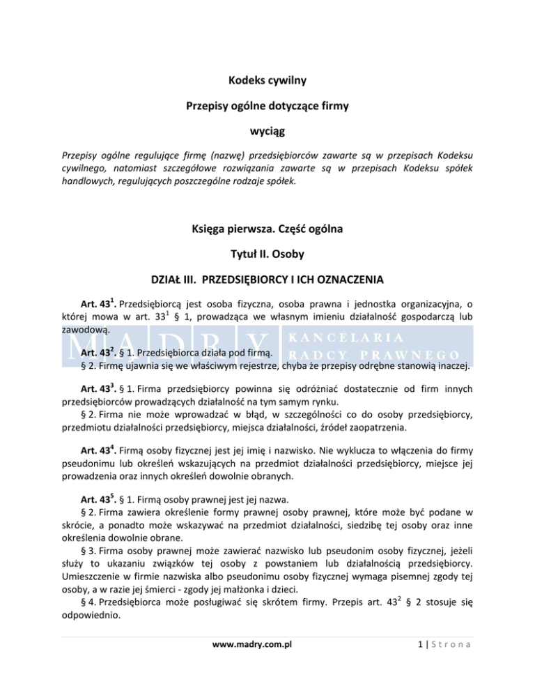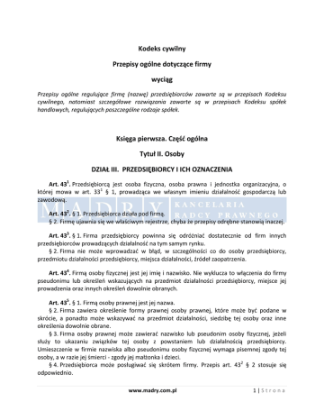 Kodeks cywilny Przepisy ogólne dotyczące firmy wyciąg Przepisy ogólne regulujące firmę (nazwę) przedsiębiorców zawarte są w przepisach Kodeksu cywilnego, natomiast szczegółowe rozwiązania zawarte są w przepisach Kodeksu spółek handlowych, regulujących poszczególne rodzaje spółek. Księga pierwsza. Częśd ogólna Tytuł II. Osoby DZIAŁ III. PRZEDSIĘBIORCY I ICH OZNACZENIA Art. 431. Przedsiębiorcą jest osoba fizyczna, osoba prawna i jednostka organizacyjna, o której mowa w art. 331 § 1, prowadząca we własnym imieniu działalnośd gospodarczą lub zawodową. Art. 432. § 1. Przedsiębiorca działa pod firmą. § 2. Firmę ujawnia się we właściwym rejestrze, chyba że przepisy odrębne stanowią inaczej. Art. 433. § 1. Firma przedsiębiorcy powinna się odróżniad dostatecznie od firm innych przedsiębiorców prowadzących działalnośd na tym samym rynku. § 2. Firma nie może wprowadzad w błąd, w szczególności co do osoby przedsiębiorcy, przedmiotu działalności przedsiębiorcy, miejsca działalności, źródeł zaopatrzenia. Art. 434. Firmą osoby fizycznej jest jej imię i nazwisko. Nie wyklucza to włączenia do firmy pseudonimu lub określeo wskazujących na przedmiot działalności przedsiębiorcy, miejsce jej prowadzenia oraz innych określeo dowolnie obranych. Art. 435. § 1. Firmą osoby prawnej jest jej nazwa. § 2. Firma zawiera określenie formy prawnej osoby prawnej, które może byd podane w skrócie, a ponadto może wskazywad na przedmiot działalności, siedzibę tej osoby oraz inne określenia dowolnie obrane. § 3. Firma osoby prawnej może zawierad nazwisko lub pseudonim osoby fizycznej, jeżeli służy to ukazaniu związków tej osoby z powstaniem lub działalnością przedsiębiorcy. Umieszczenie w firmie nazwiska albo pseudonimu osoby fizycznej wymaga pisemnej zgody tej osoby, a w razie jej śmierci - zgody jej małżonka i dzieci. § 4. Przedsiębiorca może posługiwad się skrótem firmy. Przepis art. 432 § 2 stosuje się odpowiednio. www.madry.com.pl 1|Strona Art. 436. Firma oddziału osoby prawnej zawiera pełną nazwę tej osoby oraz określenie "oddział" ze wskazaniem miejscowości, w której oddział ma siedzibę. Art. 437. Zmiana firmy wymaga ujawnienia w rejestrze. W razie przekształcenia osoby prawnej można zachowad jej dotychczasową firmę z wyjątkiem określenia wskazującego formę prawną osoby prawnej, jeżeli uległa ona zmianie. To samo dotyczy przekształcenia spółki osobowej. Art. 438. § 1. W przypadku utraty członkostwa przez wspólnika, którego nazwisko było umieszczone w firmie, spółka może zachowad w swej firmie nazwisko byłego wspólnika tylko za wyrażoną na piśmie jego zgodą, a w razie jego śmierci - za zgodą jego małżonka i dzieci. § 2. Przepis § 1 stosuje się odpowiednio w wypadku kontynuowania działalności gospodarczej osoby fizycznej przez inną osobę fizyczną będącą jej następcą prawnym. § 3. Kto nabywa przedsiębiorstwo, może je nadal prowadzid pod dotychczasową nazwą. Powinien jednak umieścid dodatek wskazujący firmę lub nazwisko nabywcy, chyba że strony postanowiły inaczej. Art. 439. § 1. Firma nie może byd zbyta. § 2. Przedsiębiorca może upoważnid innego przedsiębiorcę do korzystania ze swej firmy, jeżeli nie wprowadza to w błąd. Art. 4310. Przedsiębiorca, którego prawo do firmy zostało zagrożone cudzym działaniem, może żądad zaniechania tego działania, chyba że nie jest ono bezprawne. W razie dokonanego naruszenia może on także żądad usunięcia jego skutków, złożenia oświadczenia lub oświadczeo w odpowiedniej treści i formie, naprawienia na zasadach ogólnych szkody majątkowej lub wydania korzyści uzyskanej przez osobę, która dopuściła się naruszenia. www.madry.com.pl 2|Strona