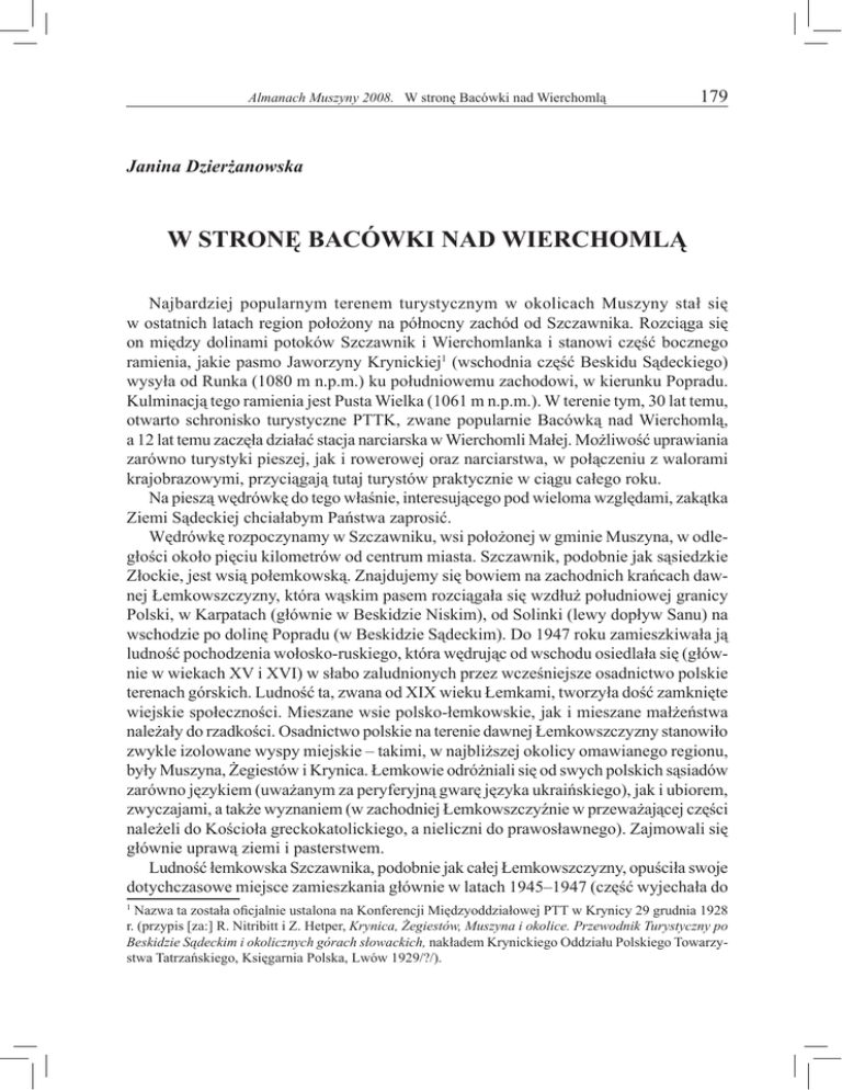 Almanach Muszyny 2008. W stronę Bacówki nad Wierchomlą 179 Janina Dzierżanowska W STRONĘ BACÓWKI NAD WIERCHOMLĄ Najbardziej popularnym terenem turystycznym w okolicach Muszyny stał się w ostatnich latach region położony na północny zachód od Szczawnika. Rozciąga się on między dolinami potoków Szczawnik i Wierchomlanka i stanowi część bocznego ramienia, jakie pasmo Jaworzyny Krynickiej (wschodnia część Beskidu Sądeckiego) wysyła od Runka (1080 m n.p.m.) ku południowemu zachodowi, w kierunku Popradu. Kulminacją tego ramienia jest Pusta Wielka (1061 m n.p.m.). W terenie tym, 30 lat temu, otwarto schronisko turystyczne PTTK, zwane popularnie Bacówką nad Wierchomlą, a 12 lat temu zaczęła działać stacja narciarska w Wierchomli Małej. Możliwość uprawiania zarówno turystyki pieszej, jak i rowerowej oraz narciarstwa, w połączeniu z walorami krajobrazowymi, przyciągają tutaj turystów praktycznie w ciągu całego roku. Na pieszą wędrówkę do tego właśnie, interesującego pod wieloma względami, zakątka Ziemi Sądeckiej chciałabym Państwa zaprosić. Wędrówkę rozpoczynamy w Szczawniku, wsi położonej w gminie Muszyna, w odległości około pięciu kilometrów od centrum miasta. Szczawnik, podobnie jak sąsiedzkie Złockie, jest wsią połemkowską. Znajdujemy się bowiem na zachodnich krańcach dawnej Łemkowszczyzny, która wąskim pasem rozciągała się wzdłuż południowej granicy Polski, w Karpatach (głównie w Beskidzie Niskim), od Solinki (lewy dopływ Sanu) na wschodzie po dolinę Popradu (w Beskidzie Sądeckim). Do 1947 roku zamieszkiwała ją ludność pochodzenia wołosko-ruskiego, która wędrując od wschodu osiedlała się (głównie w wiekach XV i XVI) w słabo zaludnionych przez wcześniejsze osadnictwo polskie terenach górskich. Ludność ta, zwana od XIX wieku Łemkami, tworzyła dość zamknięte wiejskie społeczności. Mieszane wsie polsko-łemkowskie, jak i mieszane małżeństwa należały do rzadkości. Osadnictwo polskie na terenie dawnej Łemkowszczyzny stanowiło zwykle izolowane wyspy miejskie – takimi, w najbliższej okolicy omawianego regionu, były Muszyna, Żegiestów i Krynica. Łemkowie odróżniali się od swych polskich sąsiadów zarówno językiem (uważanym za peryferyjną gwarę języka ukraińskiego), jak i ubiorem, zwyczajami, a także wyznaniem (w zachodniej Łemkowszczyźnie w przeważającej części należeli do Kościoła greckokatolickiego, a nieliczni do prawosławnego). Zajmowali się głównie uprawą ziemi i pasterstwem. Ludność łemkowska Szczawnika, podobnie jak całej Łemkowszczyzny, opuściła swoje dotychczasowe miejsce zamieszkania głównie w latach 1945–1947 (część wyjechała do Nazwa ta została oficjalnie ustalona na Konferencji Międzyoddziałowej PTT w Krynicy 29 grudnia 1928 r. (przypis [za:] R. Nitribitt i Z. Hetper, Krynica, Żegiestów, Muszyna i okolice. Przewodnik Turystyczny po Beskidzie Sądeckim i okolicznych górach słowackich, nakładem Krynickiego Oddziału Polskiego Towarzystwa Tatrzańskiego, Księgarnia Polska, Lwów 1929/?/). 180 Janina Dzierżanowska Ukraińskiej SRR, reszta została wysiedlona w ramach akcji „Wisła” na ziemie zachodnie). Mimo że od tego czasu minęło ponad 60 lat, ślady pobytu dawnych mieszkańców spotykamy na każdym kroku. Przypominają nam o nich istniejące prawie w każdej połemkowskiej wsi piękne, przeważnie drewniane cerkwie (obecnie zamienione na kościoły rzymskokatolickie), stare, przydrożne kapliczki i krzyże oraz cmentarze. Obecny Szczawnik w niczym nie przypomina dawnej ubogiej wsi łemkowskiej. Ze starej drewnianej zabudowy zachowały się nieliczne chaty i zabudowania gospodarcze, przeważają natomiast (zwłaszcza w górnej części wsi) nowe budynki, najczęściej murowane i okazałe, budowane z myślą o letnikach i turystach. Charakterystyczna jest wzrastająca liczba gospodarstw agroturystycznych. W górnej części wsi trwa budowa zaplecza usługowego nowej, ukończonej w 2008 roku, nartostrady Jaworzynka – Szczawnik, stanowiącej część stacji narciarskiej Wierchomla. Po minięciu ostatnich zabudowań wsi stajemy u wejścia do przełomowego, górnego odcinka potoku Szczawnik. Od tego miejsca obowiązuje zakaz ruchu samochodowego. Przy okazji należy podkreślić, że zakaz wjazdu dotyczy wszystkich dolin prowadzących w góry. Tymczasem – nawet w grzbietowych partiach gór – spotkanie samochodu czy motocykla nie należy do rzadkości. Czy odpowiednie służby nie powinny zadbać, by podobne incydenty nie miały miejsca? Dolina wcina się tutaj między stoki Kotylniczego Wierchu (1032 m n.p.m.) od wschodu, a stoki Szczobów (838 m n.p.m.) i Liskowej (959 m n.p.m.) od zachodu. Stoki po obu stronach doliny porośnięte są gęstym lasem. Ponieważ nasza wędrówka odbywa się cały czas w strefie regla dolnego, należałoby oczekiwać, że otaczać nas będzie las bukowo-jodłowy, czyli tzw. buczyna karpacka. Widoczna jednak duża domieszka świerka (drzewa typowego dla regla górnego) wskazuje, że naturalny dla tego obszaru skład drzewostanu uległ zmianie w wyniku działalności człowieka. Naturalne zespoły leśne zachowały się jedynie w trudno dostępnych miejscach i dla ich ochrony Potok Szczawnik (fot. J. Dzierżanowska) tworzone są rezerwaty. Jednym z takich Często potocznie używana jest także nazwa: Szczołby. Almanach Muszyny 2008. W stronę Bacówki nad Wierchomlą 181 rezerwatów jest utworzony w 1996 roku, na zachodnich stokach Kotylniczego Wierchu, rezerwat Żebracze, chroniący naturalne zespoły buczyny karpackiej, o czym informują mijane przy drodze tablice. Droga wzdłuż potoku (poszerzona i utwardzona w latach sześćdziesiątych) łagodnymi zakolami wznosi się prawie niezauważalnie, tak że różnicę wysokości około trzystu metrów, między Szczawnikiem a schroniskiem, pokonujemy bez większego wysiłku. Do czasu budowy schroniska droga ta służyła główn