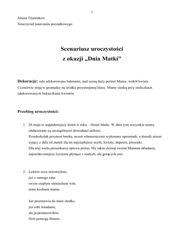 1 Janina Titarenkow Nauczyciel nauczania początkowego Scenariusz uroczystości z okazji „Dnia Matki” Dekoracje: sala udekorowana balonami, nad sceną duŜy portret Mamy, wokół kwiaty. Uczniowie stoją w gromadce na środku przystrojonej klasy. Mamy siedzą przy stoliczkach udekorowanych bukiecikami kwiatów. Przebieg uroczystości: 1. 26 maja to najpiękniejszy dzień w roku – Dzień Matki. W dniu tym wszystkie mamy obdarowane są szczególnymi dowodami miłości. Przedszkolak przynosi laurkę, uczeń własnoręcznie wykonany upominek, a dorośli nieraz Ŝyjący z dala od matek ślą im najcieplejsze myśli, kwiaty, depesze, piosenki. Dla niej wielu piosenkarzy śpiewa pieśni. My takŜe dzisiaj swoim Mamom składamy najserdeczniejsze Ŝyczenia płynące z małych, ale gorących serc. 2. Ledwie oczy otworzyłem, juŜ z samego rana swym ciepłym uśmiechem wita mnie kochana mama. JuŜ przemawia do mnie słodko, juŜ robi śniadanie, ale ja postanowiłem: Dziś pomogę Mamie. 2 Wyskoczyłem więc z łóŜeczka, juŜ jestem umyty. Co się stało mój syneczku? - moja Mama pyta. Chcę Ci dzisiaj, jutro, zawsze pomagać, jak umiem, ile trudu masz i pracy, ja juŜ to rozumiem. 3. Dzieci wspólnie śpiewają piosenkę „Pomogę Mamie” I. Choć mam rączki małe i niewiele zrobię, pomogę mamusi, niech odpocznie sobie. (bis) II. Zamiotę izdebkę, umyję garnuszki, niech się tu nie schodzą łakomczuszki muszki. (bis) III. Utulę braciszka w małej kolebusi, chociaŜ w tym pomogę kochanej mamusi. (bis) 4. Wiesz co robi Twoja mama, gdzie pracuje, jaki zawód wykonuje? 3 5. Moja mama mierzy, kroi, kręci przy tym głową. Wyczaruje suknię piękną, jest przecieŜ krawcową. 6. Moja leczy chore dzieci, słucha, opukuje. Ma dyŜury w dzień i w nocy, w szpitalu pracuje. 7. Moja mama sprząta, pierze, obiady gotuje. No i małych swych urwisów dzielnie wychowuje. 8. Wie, jak ciasto pyszne zrobić, jak załatać dziurę, Ŝeby deszcz nas nie przemoczył, odpędzi złą chmurę. 9. A wieczorem, po dniu całym, gdy juŜ buzia ziewa, siada cicho przy mym łóŜku, kołysankę śpiewa. 10. Piosenka śpiewana przez wszystkich uczniów pt. „Moja Mama” 11. Scenka pt. „Rozmowa z mamą”. (Mama siedzi na krześle, a obok niej stoi córeczka ) C-Moja droga mamo, pytań mam bez liku , chyba ich nie zmieszczę w swoim notatniku! Kiedy byłaś mała, co robiłaś? M- Grałam i śpiewałam, grałam na grzebieniu, śpiewałam piosenki, rytm wystukiwałam na 4 małym bębenku... C- A co śpiewałaś? M- Biedroneczki są w kropeczki. A ty masz za krótkie nóŜki jak zwykle u kaczuszki. Karuzela, karuzela na Bielanach co niedziela... C- A byłaś czasem wesoła? M-O tak! Najbardziej, gdy kończyła się szkoła! C-A, gdy byłaś chora? M-Chodziłam do doktora, pan doktor był bardzo stary i nosił okulary, a kiedy mnie badał , tak powiadał: „Źle bardzo koteczku, oj długo, ty długo poleŜysz w łóŜeczku! C- A do szkoły chodziłaś? M- Chodziłam! C- A dobrą uczennicą byłaś? M- Byłam! Kiedy pisałam kleksy stawiałam i litery połykałam, pisałam wielkimi wołami i drobnym maczkiem, oddzielałam lekcje kolorowym szlaczkiem. Będę ci w nauce pomagała, zgoda? C- Zgoda! Tylko szkoda, Ŝe nigdy nie będziemy chodzić do tej samej klasy... Byłabyś moją najlepszą koleŜanką... I Rano wstaje moja mama Jeszcze drzemie słońce, A mnie budzą dwa słoneczka Wesołe, gorące. II. W oczach mamy te słoneczka śarzą się od rana, Przez dzień cały bez ustanku Spoglądają na nas. III .Gdy wieczorem słońce zajdzie, Uśnie las i rzeczka, Jeszcze nad mą śpiącą głową Lśnią te dwa słoneczka. 5 11. Gdybym mógł mamo, to bym pamiętał, Ŝeby Ci przynieść w dniu Twego Święta kawałek łąki pachnącej majem, z piosnką skowronka i z krzykiem czajek, tęczę wiosenną po pierwszej burzy, kukułkę, która pomyślność wróŜy, wiatru Ŝywiczne szmery lesiste i lustro wody drŜące i czyste. 12. W małym bukiecie majowe kwiatki zakwitły wczoraj na święto Matki. 13. Uczniowie wspólnie śpiewają piosenkę pt. „Ogródeczek”. I. W moim małym ogródeczku, zasadzę kwiat róŜy, aby zawsze pięknie pachniał jak Twoje perfumy. Ref. Mamo moja, Mamo moja, Mamo ukochana, Chcę być Twoim małym księciem od samego rana. (bis) 6 II. O poranku i o zmierzchu, Chcę go pielęgnować, by czerwienią swoich płatków, wszystkich mógł czarować. Ref. Mamo moja, Mamo moja... 14. Nie napisano, nie wyśpiewano i nie wyszeptano wszystkiego co z jednym imieniem Matki się wiąŜe – ile ludzkich bólów, słabości i rozpaczy. Ile razy człowiek ugina się pod cięŜarem beznadziei, tyle razy wraca na jego wargi to najbardziej ludzkie wołanie: Matko! 15. Uczniowie wspólnie śpiewają piosenkę pt. „Najmilsza na świecie jest mi mama”. I. Najmilsza na świecie jest mi mama, ta ukochana, ta droga mama. Tyle co się dla mnie poświęciła i wychowała mnie, więc kocham ją. II. Nikt mi w Ŝyciu, droga mamo, nie zastąpi Cię. KaŜda matka dla swych dzieci jak najlepiej chce. III. Dziękuję Ci mamo więc za wszystko, za Twe staranie, za Twoje łzy. śeś klęczała nad moją kołyską i wychowała mnie, więc kocham Cię. Dzieci podchodzą do swych mam i wręczają im własnoręcznie wykonane laurki oraz kwiaty. 7 Po wręczeniu, jedno dziecko zaprasza Mamy na poczęstunek. (Sponsorami poczęstunku są rodzice dzieci). Bibliografia: Elwira Drzał, Iwonna Skibińska-Czechowicz „ Inscenizacje w nauczaniu zintegrowanym” Wydawnictwo Harmonia, Gdańsk 2003r. Krystyna BoŜek- Gowik „Śpiewnik dziecięcy” Wydawnictwo M.RoŜak, Gdańsk 1999r. Biuletyn ”Nauczanie Początkowe” nr 3 1992/93.