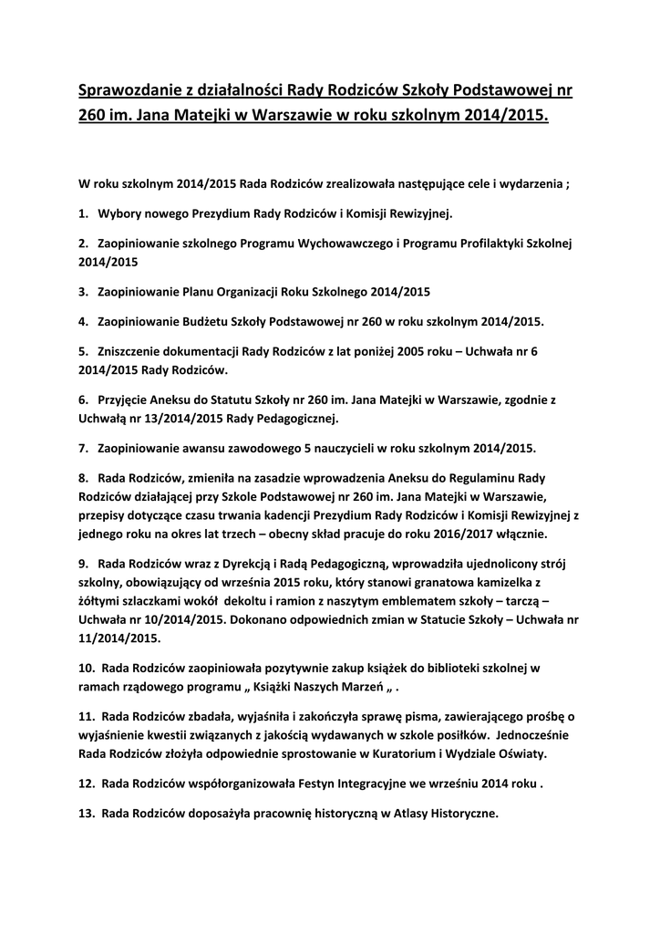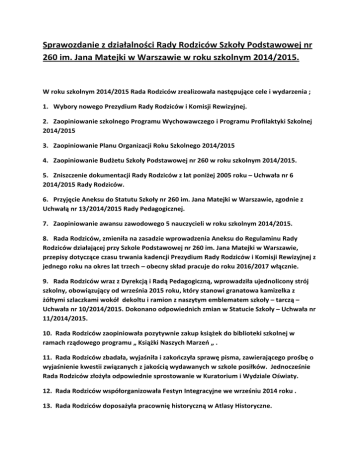 Sprawozdanie z działalności Rady Rodziców Szkoły Podstawowej nr 260 im. Jana Matejki w Warszawie w roku szkolnym 2014/2015. W roku szkolnym 2014/2015 Rada Rodziców zrealizowała następujące cele i wydarzenia ; 1. Wybory nowego Prezydium Rady Rodziców i Komisji Rewizyjnej. 2. Zaopiniowanie szkolnego Programu Wychowawczego i Programu Profilaktyki Szkolnej 2014/2015 3. Zaopiniowanie Planu Organizacji Roku Szkolnego 2014/2015 4. Zaopiniowanie Budżetu Szkoły Podstawowej nr 260 w roku szkolnym 2014/2015. 5. Zniszczenie dokumentacji Rady Rodziców z lat poniżej 2005 roku – Uchwała nr 6 2014/2015 Rady Rodziców. 6. Przyjęcie Aneksu do Statutu Szkoły nr 260 im. Jana Matejki w Warszawie, zgodnie z Uchwałą nr 13/2014/2015 Rady Pedagogicznej. 7. Zaopiniowanie awansu zawodowego 5 nauczycieli w roku szkolnym 2014/2015. 8. Rada Rodziców, zmieniła na zasadzie wprowadzenia Aneksu do Regulaminu Rady Rodziców działającej przy Szkole Podstawowej nr 260 im. Jana Matejki w Warszawie, przepisy dotyczące czasu trwania kadencji Prezydium Rady Rodziców i Komisji Rewizyjnej z jednego roku na okres lat trzech – obecny skład pracuje do roku 2016/2017 włącznie. 9. Rada Rodziców wraz z Dyrekcją i Radą Pedagogiczną, wprowadziła ujednolicony strój szkolny, obowiązujący od września 2015 roku, który stanowi granatowa kamizelka z żółtymi szlaczkami wokół dekoltu i ramion z naszytym emblematem szkoły – tarczą – Uchwała nr 10/2014/2015. Dokonano odpowiednich zmian w Statucie Szkoły – Uchwała nr 11/2014/2015. 10. Rada Rodziców zaopiniowała pozytywnie zakup książek do biblioteki szkolnej w ramach rządowego programu „ Książki Naszych Marzeń „ . 11. Rada Rodziców zbadała, wyjaśniła i zakończyła sprawę pisma, zawierającego prośbę o wyjaśnienie kwestii związanych z jakością wydawanych w szkole posiłków. Jednocześnie Rada Rodziców złożyła odpowiednie sprostowanie w Kuratorium i Wydziale Oświaty. 12. Rada Rodziców współorganizowała Festyn Integracyjne we wrześniu 2014 roku . 13. Rada Rodziców doposażyła pracownię historyczną w Atlasy Historyczne. 14. Rada Rodziców wspierała finansowo wyjazdy Chóru Szkolnego na Konkursy Wokalne na terenie Warszawy i nie tylko. 15. Rada Rodziców wspierała finansowo działalność Samorządu Szkolnego i organizowane przez Niego konkursy i wydarzenia. 16. Rada Rodziców wykonała dekorację sali gimnastycznej na Jasełka i Bal Karnawałowy + słodycze. 17. Rada Rodziców wraz z Gronem Pedagogicznym , zorganizowała Festyn Świąteczny grudzień 2014 – Odwiedziny Mikołajów + słodycze. Zebrane fundusze klasy przeznaczyły na atrakcje wewnątrzklasowe. 18. Rada Rodziców zorganizowała semestralny konkurs klasowy na najwyższą zebraną składkę na RR i nagrodziła w I semestrze klasę Va – tort i nagroda finansowa i w II semestrze klasę Ib – tort i nagroda finansowa. 19. Rada Rodziców wraz z Gronem Pedagogicznym zorganizowała i sfinansowała, Wielki Festyn Rodzinny z okazji Dnia Dziecka, Dnia Matki i Dnia Ojca – zebrane fundusze klasy przeznaczyły na atrakcje wewnątrzklasowe. 20. Rada Rodziców sfinansowała zakup dyplomów i nagród na zakończenie Roku Szkolnego 2014/2015. 21. Rada Rodziców dofinansowała organizację Konkursu Omnibus. 22. Rada Rodziców złożyła apteczki WOŚP – dla naszych przeszkolonych młodych ratowników. Wcześniej Rada Rodziców zgłosiła szkołę do Fundacji WOŚP do wznowienia szkoleń z zakresu resuscytacji i pierwszej pomocy. Szkolenia przeprowadziła Pani Małgorzata Kliszewska, której serdecznie dziękujemy za wspaniałą współpracę. Ponadto Rada Rodziców cały rok szkolny 2014/2015 efektywnie uczestniczyła w życiu szkoły, a okresie wakacyjnym wspierała radą Panią Dyrektor w zakresie prac remontowych wykonywanych na terenie szkoły.