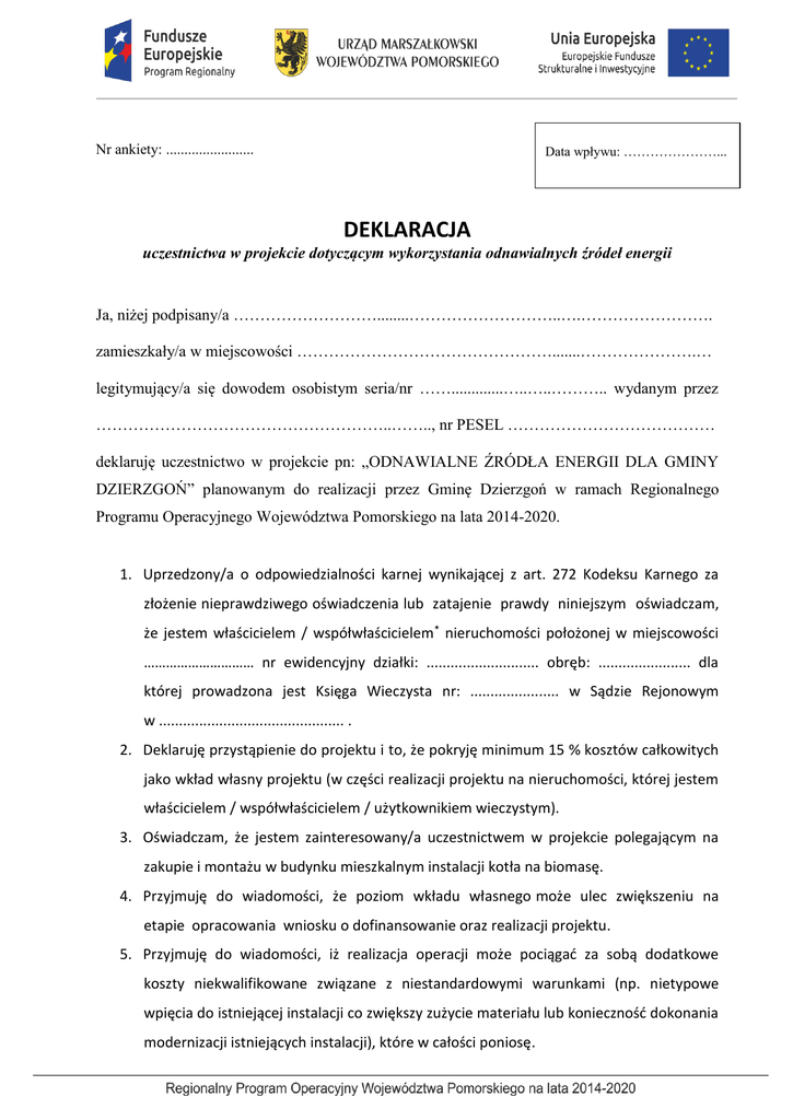 Nr ankiety: ........................ Data wpływu: …………………... DEKLARACJA uczestnictwa w projekcie dotyczącym wykorzystania odnawialnych źródeł energii Ja, niżej podpisany/a ………………………........………………………..….……………………. zamieszkały/a w miejscowości ………………………………………….......………………….… legitymujący/a się dowodem osobistym seria/nr …….............…..…..……….. wydanym przez ………………………………………………..…….., nr PESEL ………………………………… deklaruję uczestnictwo w projekcie pn: „ODNAWIALNE ŹRÓDŁA ENERGII DLA GMINY DZIERZGOŃ” planowanym do realizacji przez Gminę Dzierzgoń w ramach Regionalnego Programu Operacyjnego Województwa Pomorskiego na lata 2014-2020. 1. Uprzedzony/a o odpowiedzialności karnej wynikającej z art. 272 Kodeksu Karnego za złożenie nieprawdziwego oświadczenia lub zatajenie prawdy niniejszym oświadczam, że jestem właścicielem / współwłaścicielem* nieruchomości położonej w miejscowości ………………………… nr ewidencyjny działki: ............................ obręb: ....................... dla której prowadzona jest Księga Wieczysta nr: ...................... w Sądzie Rejonowym w .............................................. . 2. Deklaruję przystąpienie do projektu i to, że pokryję minimum 15 % kosztów całkowitych jako wkład własny projektu (w części realizacji projektu na nieruchomości, której jestem właścicielem / współwłaścicielem / użytkownikiem wieczystym). 3. Oświadczam, że jestem zainteresowany/a uczestnictwem w projekcie polegającym na zakupie i montażu w budynku mieszkalnym instalacji kotła na biomasę. 4. Przyjmuję do wiadomości, że poziom wkładu własnego może ulec zwiększeniu na etapie opracowania wniosku o dofinansowanie oraz realizacji projektu. 5. Przyjmuję do wiadomości, iż realizacja operacji może pociągać za sobą dodatkowe koszty niekwalifikowane związane z niestandardowymi warunkami (np. nietypowe wpięcia do istniejącej instalacji co zwiększy zużycie materiału lub konieczność dokonania modernizacji istniejących instalacji), które w całości poniosę. 6. Przyjmuję do wiadomości, iż w przypadku, gdy: konstrukcja i stan techniczny dachu lub elewacji albo ukształtowanie nieruchomości uniemożliwi instalację urządzenia, kryteria formalne określone przez Instytucję organizującą konkurs (Urząd Marszałkowski Województwa Pomorskiego) wyłączą moją nieruchomość/ osobę z możliwości dofinansowania, nie będę mógł wziąć udziału w programie. 7. Ponadto oświadczam, że: a. Liczba osób zamieszkałych stale w budynku mieszkalnym wynosi: ............... . b. W budynku nie jest prowadzona działalność: gospodarcza ani rolnicza, oraz że instalacja OZE będzie wykorzystywana tylko i wyłącznie na cele mieszkaniowe. c. Adres budynku jest / nie jest* miejscem administracyjnej rejestracji działalności gospodarczej. d. Udostępnię nieruchomość przedstawicielom Gminy Dzierzgoń oraz wykonawcom dla celów projektowych, montażu instalacji i eksploatacji urządzeń objętych projektem. e. W przypadku uzyskania dofinansowania, na realizację projektu przez Gminę Dzierzgoń niezwłocznie podpiszę stosowną umowę oraz przedłożę dokumentację potwierdzającą posiadanie prawa do dysponowania nieruchomością na cele budowlane. f. Wyrażę zgodę na umieszczenie i utrzymywanie na powyższej nieruchomości, przez okres co najmniej 5 lat po zakończeniu realizacji projektu, zamontowanej instalacji oraz umieszczonego oznaczenia o sfinansowaniu projektu ze środków Europejskiego Funduszu Rozwoju Regionalnego w ramach Regionalnego Programu Operacyjnego Województwa Pomorskiego na lata 2014 – 2020. g. Wyrażam zgodę na przetwarzanie moich danych osobowych dla potrzeb niezbędnych do przygotowania oraz realizacji projektu zgodnie z ustawą z dnia 29 sierpnia 1997 r . o ochronie danych osobowych (tekst jednolity: Dz.U. 2015 r. poz. 2135 późn. zm.) ANKIETA DOT. UDZIAŁU W PROJEKCIE – KOCIOŁ NA BIOMASĘ Powierzchnia budynku (ogrzewana) Wysokość pomieszczeń (ogrzewana) Istniejący rodzaj źródła ciepła (kocioł stałopalny, z podajnikiem, na biomasę, gazowy, olejowy, węglowy) Rodzaj paliwa (drewno, węgiel, ekogroszek, miał, wiór, słoma, zboża, pestki, łupiny, olej, gaz) Moc istniejącego źródła ciepła (kW) Rodzaj komina (cegła, rura kwasówka, bloczek) Wysokość komina (m) Przekrój komina (cm x cm) lub średnica (cm) Rodzaj materiału z którego wykonano budynek (cegła, ytong, poroterm) Grubość ścian zewnętrznych (cm) Ocieplenie ścian, rodzaj i grubość (cm) Ocieplenie podłogi na gruncie, rodzaj i grubość (cm) Ocieplenie stropu/poddasza, rodzaj i grubość (cm) Rodzaj ogrzewania (grzejniki, podłogówka, mieszane) Dodatkowe źródło ciepła (np. kominek, pompa ciepła) Liczba osób w gospodarstwie korzystających z ciepłej wody Ilość łazienek Duża wanna (200-300 litrów) (TAK/NIE) Instalacja CWU i CO przystosowana do podłączenia pieca na biomasę (TAK/NIE) Czy w obiekcie jest już wykorzystywana instalacja z odnawialnych źródeł energii Tak (jaka?) …………….…………………. Nie Uwaga: Złożenie ankiety nie gwarantuje realizacji inwestycji. Realizacja zależna jest wyłącznie od uzyskania środków UE. Czytelny podpis wszystkich osób posiadających tytuł prawny do dysponowania nieruchomością: ………………………….. czytelny podpis ………………………….. czytelny podpis ………………………….. czytelny podpis …………………………….. miejscowość i data ……………………………… miejscowość i data ………………………………….. miejscowość i data …………………………….. nr telefonu kontaktowego …………………………….. nr telefonu kontaktow