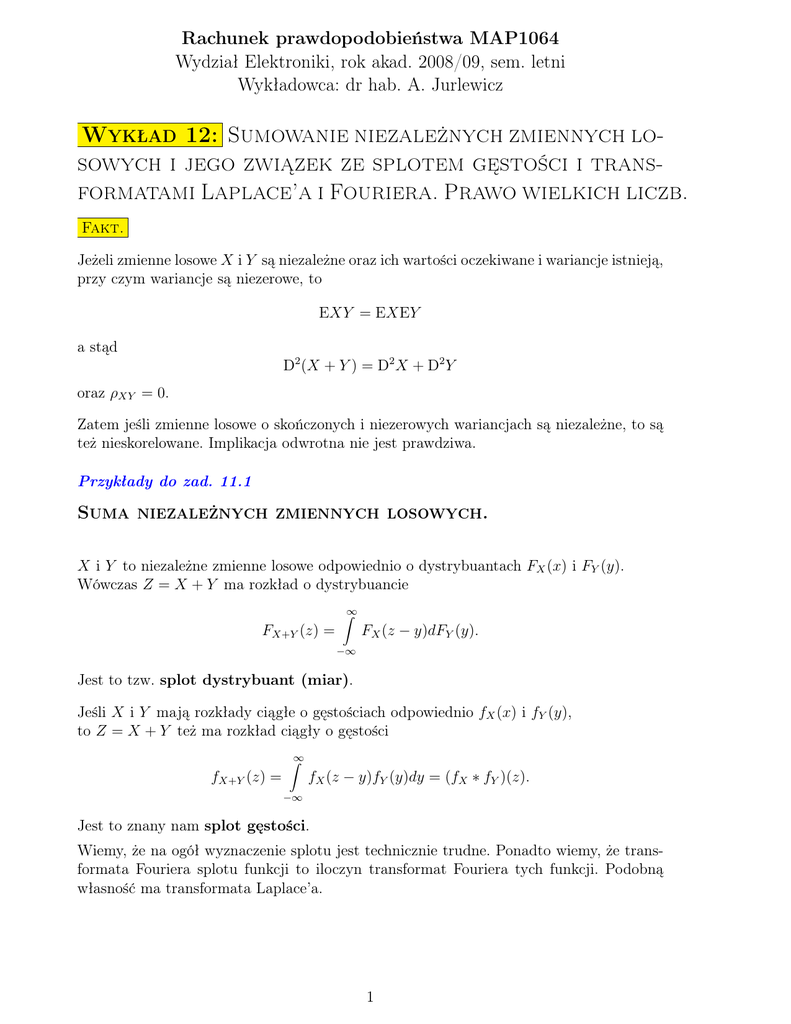 Wykład 12: Sumowanie niezależnych zmiennych losowych i jego związek ze splotem gęstości i transformatami Laplace’a i Fouriera. Prawo wielkich liczb.