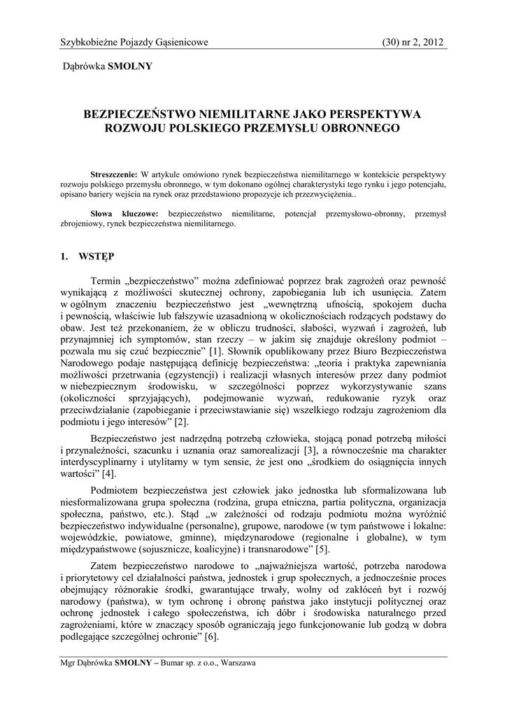 Szybkobieżne Pojazdy Gąsienicowe (30) nr 2, 2012 Dąbrówka SMOLNY BEZPIECZEŃSTWO NIEMILITARNE JAKO PERSPEKTYWA ROZWOJU POLSKIEGO PRZEMYSŁU OBRONNEGO Streszczenie: W artykule omówiono rynek bezpieczeństwa niemilitarnego w kontekście perspektywy rozwoju polskiego przemysłu obronnego, w tym dokonano ogólnej charakterystyki tego rynku i jego potencjału, opisano bariery wejścia na rynek oraz przedstawiono propozycje ich przezwyciężenia.. Słowa kluczowe: bezpieczeństwo niemilitarne, zbrojeniowy, rynek bezpieczeństwa niemilitarnego. 1. potencjał przemysłowo-obronny, przemysł WSTĘP Termin „bezpieczeństwo” można zdefiniować poprzez brak zagrożeń oraz pewność wynikającą z możliwości skutecznej ochrony, zapobiegania lub ich usunięcia. Zatem w ogólnym znaczeniu bezpieczeństwo jest „wewnętrzną ufnością, spokojem ducha i pewnością, właściwie lub fałszywie uzasadnioną w okolicznościach rodzących podstawy do obaw. Jest też przekonaniem, że w obliczu trudności, słabości, wyzwań i zagrożeń, lub przynajmniej ich symptomów, stan rzeczy – w jakim się znajduje określony podmiot – pozwala mu się czuć bezpiecznie” [1]. Słownik opublikowany przez Biuro Bezpieczeństwa Narodowego podaje następującą definicję bezpieczeństwa: „teoria i praktyka zapewniania możliwości przetrwania (egzystencji) i realizacji własnych interesów przez dany podmiot w niebezpiecznym środowisku, w szczególności poprzez wykorzystywanie szans (okoliczności sprzyjających), podejmowanie wyzwań, redukowanie ryzyk oraz przeciwdziałanie (zapobieganie i przeciwstawianie się) wszelkiego rodzaju zagrożeniom dla podmiotu i jego interesów” [2]. Bezpieczeństwo jest nadrzędną potrzebą człowieka, stojącą ponad potrzebą miłości i przynależności, szacunku i uznania oraz samorealizacji [3], a równocześnie ma charakter interdyscyplinarny i utylitarny w tym sensie, że jest ono „środkiem do osiągnięcia innych wartości” [4]. Podmiotem bezpieczeństwa jest człowiek jako jednostka lub sformalizowana lub niesformalizowana grupa społeczna (rodzina, grupa etniczna, partia polityczna, organizacja społeczna, państwo, etc.). Stąd „w zależności od rodzaju podmiotu można wyróżnić bezpieczeństwo indywidualne (personalne), grupowe, narodowe (w tym państwowe i lokalne: wojewódzkie, powiatowe, gminne), międzynarodowe (regionalne i globalne), w tym międzypaństwowe (sojusznicze, koalicyjne) i transnarodowe” [5]. Zatem bezpieczeństwo narodowe to „najważniejsza wartość, potrzeba narodowa i priorytetowy cel działalności państwa, jednostek i grup społecznych, a jednocześnie proces obejmujący różnorakie środki, gwarantujące trwały, wolny od zakłóceń byt i rozwój narodowy (państwa), w tym ochronę i obronę państwa jako instytucji politycznej oraz ochronę jednostek i całego społeczeństwa, ich dóbr i środowiska naturalnego przed zagrożeniami, które w znaczący sposób ograniczają jego funkcjonowanie lub godzą w dobra podlegające szczególnej ochronie” [6]. Mgr Dąbrówka SMOLNY – Bumar sp. z o.o., Warszawa Dąbrówka SMOLNY Uwzględniając z kolei przedmiot bezpieczeństwa, można rozróżnić te rodzaje, dziedziny czy obszary, w których określony podmiot prowadzi jakąś aktywność. Wobec tego bezpieczeństwo narodowe Polski można podzielić na dwa konstytucyjne obszary: bezpieczeństwo zewnętrzne i wewnętrzne oraz trzy podstawowe dziedziny: obronność (obrona narodowa, czyli bezpieczeństwo militarne), ochrona (bezpieczeństwo cywilne, niemilitarne) i bezpieczeństwo ekonomiczno-kulturowe [7]. W konsekwencji przemian zachodzących w świecie zmieniła się istota bezpieczeństwa państwa. Obok klasycznych zagrożeń militarnych, wpływających na bezpieczeństwo państwa i jego obywateli zaczęto przywiązywać znaczenie do wyzwań i zagrożeń pozamilitarnych, w tym kwestii ekonomicznych i społecznych. Na tę jakościową zmianę w rozumieniu bezpieczeństwa wpłynęły: rewolucja naukowo-techniczna, delegalizacja wojny napastniczej, zakończenie zimnej wojny i dwubiegunowego podziału świata, a w konsekwencji międzynarodowa kontrola zbrojeń, a także wzrost znaczenia podmiotów pozarządowych oraz wzrost współzależności międzynarodowych. Aktualnie, jako najważniejsze czynniki zagrażające bezpieczeństwu narodowemu wymienia się: destabilizację systemu politycznego, źle funkcjonujące mechanizmy gospodarcze i społeczne, masowe naruszanie praw człowieka, zubożenie społeczeństwa, konflikty społeczne, których władze państwowe nie są w stanie rozwiązać, akcje masowych ruchów społecznych (np. strajki), degradację środowiska i klęski żywiołowe (np. powodzie, susze, trzęsienia ziemi, tsunami, huragany), degradację środowiska naturalnego, nielegalne migracje, przestępczość zorganizowaną; terroryzm, zagrożenia informatyczne (cybernetyczne) [8]. Zatem bezpieczeństwo niemilitarne można zdefiniować jako szeroko pojętą ochronę, związaną z bezpieczeństwem cywilnym, w tym ochroną ludności, zasobów, infrastruktury i struktur państwa przed takimi zagrożeniami jak: terroryzm, przestępczość zorganizowana, korupcja, migracje, znaczne ubożenie społeczeństwa, zamieszki, demonstracje i inne działania godzące w porządek konstytucyjny państwa, klęski naturalne, awarie techniczne itp.1 2. POTENCJAŁ RYNKU BEZPIECZEŃSTWA NIEMILITARNEGO W wyniku zmiany w postrzeganiu bezpieczeństwa i równoczesnego procesu ograniczania wydatków na obronę, w związku z zakończeniem zimnowojennego wyścigu zbrojeń, firmy zbrojeniowe zaczęły poszerzać portfolio produktów i usług o ofertę dla podmiotów zapewniających bezpieczeństwo niemilitarne, w tym bezpieczeństwo ludności i mienia, porządek publiczny, ochronę infrastruktury krytycznej itp. Wśród zmian wpływających na wielkość i charakter produkcji firma konsultingowa A.T. Kearney wymienia: ogólny spadek 