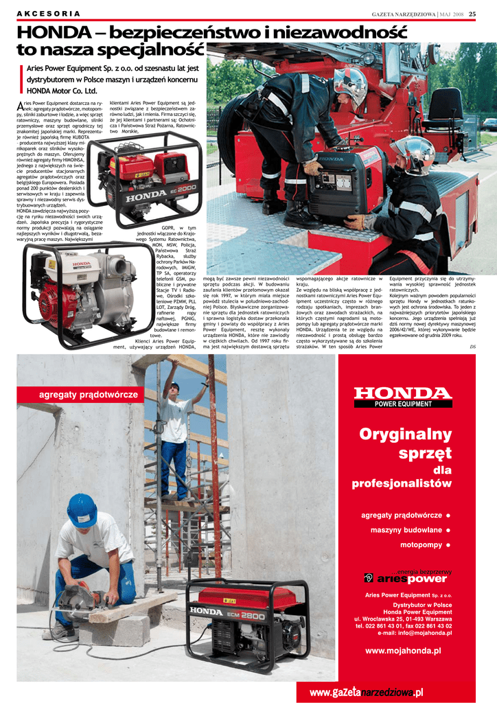 Akcesoria GAZETA NARZĘDZIOWA | MAJ 2008 25 HONDA – bezpieczeństwo i niezawodność to nasza specjalność Aries Power Equipment Sp. z o.o. od szesnastu lat jest dystrybutorem w Polsce maszyn i urządzeń koncernu HONDA Motor Co. Ltd. A ries Power Equipment dostarcza na rynek: agregaty prądotwórcze, motopompy, silniki zaburtowe i łodzie, a więc sprzęt ratowniczy, maszyny budowlane, silniki przemysłowe oraz sprzęt ogrodniczy tej znakomitej japońskiej marki. Reprezentuje również japońską firmę KUBOTA – producenta najwyższej klasy minikoparek oraz silników wysokoprężnych do maszyn. Oferujemy również agregaty firmy HIMOINSA, jednego z największych na świecie producentów stacjonarnych agregatów prądotwórczych oraz belgijskiego Europowera. Posiada ponad 200 punktów dealerskich i serwisowych w kraju i zapewnia sprawny i niezawodny serwis dystrybuowanych urządzeń. HONDA zawdzięcza najwyższą pozycję na rynku niezawodności swoich urządzeń. Japońska precyzja i rygorystyczne normy produkcji pozwalają na osiąganie najlepszych wyników i długotrwałą, bezawaryjną pracę maszyn. Największymi klientami Aries Power Equipment są jednostki związane z bezpieczeństwem zarówno ludzi, jak i mienia. Firma szczyci się, że jej klientami i partnerami są: Ochotnicza i Państwowa Straż Pożarna, Ratownictwo Morskie, GOPR, w tym jednostki włączone do Krajowego Systemu Ratownictwa, MON, MSW, Policja, Państwowa Straż Rybacka, służby ochrony Parków Narodowych, IMiGW, TP SA, operatorzy telefonii GSM, publiczne i prywatne Stacje TV i Radiowe, Ośrodki szkoleniowe PZMW, PLL LOT, Zarządy Dróg, rafinerie ropy naftowej, PGNiG, największe firmy budowlane i remontowe. Klienci Aries Power Equipment, używający urządzeń HONDA, mogą być zawsze pewni niezawodności sprzętu podczas akcji. W budowaniu zaufania klientów przełomowym okazał się rok 1997, w którym miała miejsce powódź stulecia w południowo-zachodniej Polsce. Błyskawiczne zorganizowanie sprzętu dla jednostek ratowniczych i sprawna logistyka dostaw przekonała gminy i powiaty do współpracy z Aries Power Equipment, resztę wykonały urządzenia HONDA, które nie zawiodły w ciężkich chwilach. Od 1997 roku firma jest największym dostawcą sprzętu wspomagającego akcje ratownicze w kraju. Ze względu na bliską współpracę z jednostkami ratowniczymi Aries Power Equipment uczestniczy często w różnego rodzaju spotkaniach, imprezach branżowych oraz zawodach strażackich, na których częstymi nagrodami są motopompy lub agregaty prądotwórcze marki HONDA. Urządzenia te ze względu na niezawodność i prostą obsługę bardzo często wykorzystywane są do szkolenia strażaków. W ten sposób Aries Power Equipment przyczynia się do utrzymywania wysokiej sprawność jednostek ratowniczych. Kolejnym ważnym powodem popularności sprzętu Hondy w jednostkach ratunkowych jest ochrona środowiska. To jeden z najważniejszych priorytetów japońskiego koncernu. Jego urządzenia spełniają już dziś normy nowej dyrektywy maszynowej 2006/42/WE, której wykonywanie będzie egzekwowane od grudnia 2009 roku. DS
