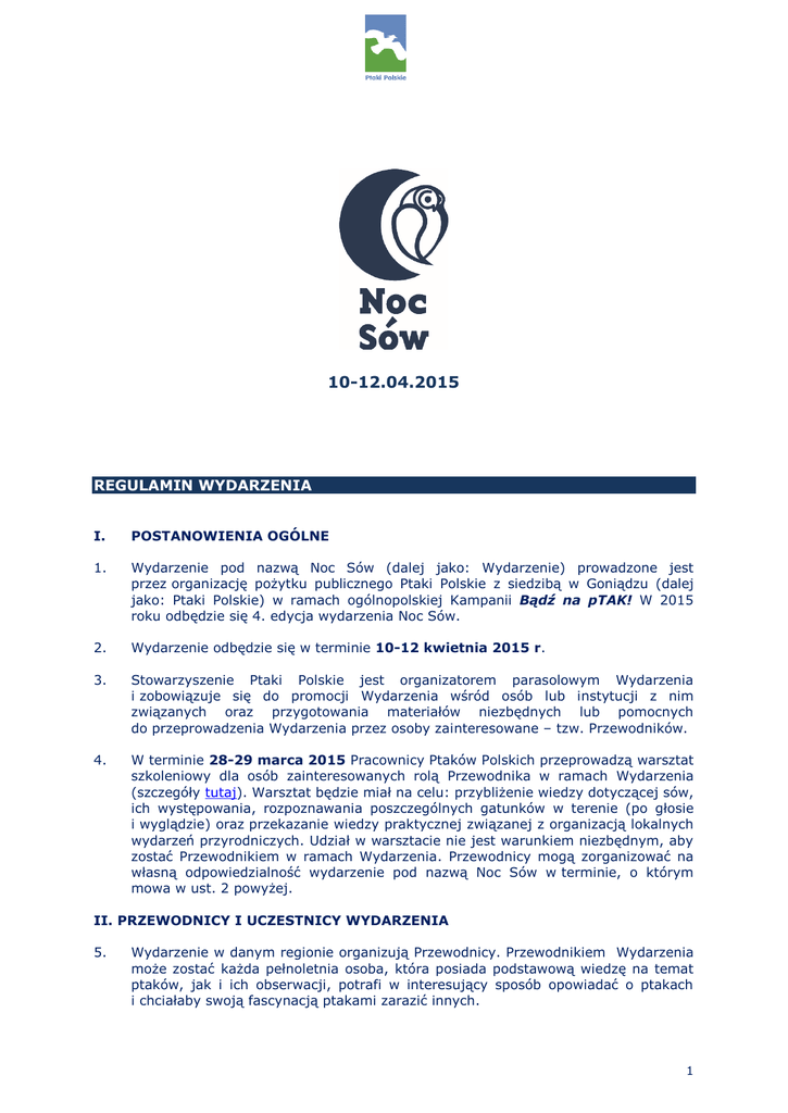 10-12.04.2015 REGULAMIN WYDARZENIA I. POSTANOWIENIA OGÓLNE 1. Wydarzenie pod nazwą Noc Sów (dalej jako: Wydarzenie) prowadzone jest przez organizację pożytku publicznego Ptaki Polskie z siedzibą w Goniądzu (dalej jako: Ptaki Polskie) w ramach ogólnopolskiej Kampanii Bądź na pTAK! W 2015 roku odbędzie się 4. edycja wydarzenia Noc Sów. 2. Wydarzenie odbędzie się w terminie 10-12 kwietnia 2015 r. 3. Stowarzyszenie Ptaki Polskie jest organizatorem parasolowym Wydarzenia i zobowiązuje się do promocji Wydarzenia wśród osób lub instytucji z nim związanych oraz przygotowania materiałów niezbędnych lub pomocnych do przeprowadzenia Wydarzenia przez osoby zainteresowane – tzw. Przewodników. 4. W terminie 28-29 marca 2015 Pracownicy Ptaków Polskich przeprowadzą warsztat szkoleniowy dla osób zainteresowanych rolą Przewodnika w ramach Wydarzenia (szczegóły tutaj). Warsztat będzie miał na celu: przybliżenie wiedzy dotyczącej sów, ich występowania, rozpoznawania poszczególnych gatunków w terenie (po głosie i wyglądzie) oraz przekazanie wiedzy praktycznej związanej z organizacją lokalnych wydarzeń przyrodniczych. Udział w warsztacie nie jest warunkiem niezbędnym, aby zostać Przewodnikiem w ramach Wydarzenia. Przewodnicy mogą zorganizować na własną odpowiedzialność wydarzenie pod nazwą Noc Sów w terminie, o którym mowa w ust. 2 powyżej. II. PRZEWODNICY I UCZESTNICY WYDARZENIA 5. Wydarzenie w danym regionie organizują Przewodnicy. Przewodnikiem Wydarzenia może zostać każda pełnoletnia osoba, która posiada podstawową wiedzę na temat ptaków, jak i ich obserwacji, potrafi w interesujący sposób opowiadać o ptakach i chciałaby swoją fascynacją ptakami zarazić innych. 1 6. Wydarzenie w swojej okolicy mogą organizować także szkoły bądź inne instytucje wychowawcze, w których na czas Wydarzenia zostanie wytypowany nauczyciel pełniący funkcję Przewodnika. 7. Aby zostać Przewodnikiem, należy wybrać miejsce, w którym chce się przeprowadzić Wydarzenie dla potencjalnych Uczestników, wypełnić formularz zgłoszeniowy i przesłać go do dnia 1 kwietnia 2015 r. drogą elektroniczną na adres email: [email protected]. Formularz zgłoszeniowy jest dostępny na stronie www.ptakipolskie.pl w zakładce Nasze Działania -> Noc Sów. 8. Wszelkie działania Przewodnika muszą być zgodne z Poradnikiem Przewodnika oraz Kodeksem Etycznym stowarzyszenia Ptaki Polskie, które są dostępne na stronie www.ptakipolskie.pl. 9. Ptaki Polskie nie odpowiadają za organizację i formę Wydarzeń lokalnych. Przewodnik ponosi pełną odpowiedzialność prawną za organizację Wydarzeń lokalnych. Przewodnik jest zobowiązany do uzyskania wszelkich zgód i pozwoleń wymaganych prawem w związku z organizacją przez niego lokalnego Wydarzenia. 10. Uczestnikiem Wydarzenia może zostać każdy, niezależnie od poziomu wiedzy na temat ptaków i przyrody. Osoby niepełnoletnie zobowiązane są do uczestnictwa pod opieką rodziców bądź opiekunów, lub do przedstawienia Przewodnikowi podpisanej przez rodzica bądź opiekuna pisemnej zgody na uczestnictwo w Wydarzeniu, według wzoru dostępnego na stronie Wydarzenia Noc Sów. 11. Pozyskanie Uczestników biorących udział w lokalnym Wydarzeniu leży po stronie Przewodnika przy jednoczesnym wsparciu i promocji ze strony Ptaków Polskich. 12. Przewodnik, przesyłając podpisany formularz zgłoszeniowy, o którym mowa w ust. 7, wyraża zgodę na zamieszczenie swoich danych osobowych (imię nazwisko, email i/lub numer telefonu, miejscowość, region) na stronie Wydarzenia Noc Sów w celu umożliwienia potencjalnym Uczestnikom zgłaszania się bezpośrednio do Przewodnika w danym regionie. III. PODSUMOWANIE WYDARZENIA 13. Przewodnicy zobowiązani są do przesłania do dnia 26 kwietnia 2015 drogą elektroniczną na adres: [email protected] fotorelacji wraz z krótkim artykułem (ok. pół strony A4), opisującym zorganizowane przez nich lokalne Wydarzenie oraz listy uczestników zawierającej imiona i nazwiska, adresy email oraz podpisy Uczestników organizowanego przez nich Wydarzenia. 14. Spośród relacji przesłanych przez przewodników Ptaki Polskie wybiorą najciekawsze, które zostaną nagrodzone ciekawymi materiałami na temat ptaków i przyrody. 15. Każdy Uczestnik Wydarzenia zobowiązuje się podpisać listę Uczestników Wydarzenia, którą będzie posiadał Przewodnik. Spośród osób zapisanych na listy Ptaki Polskie wybiorą po jednej osobie z każdego lokalnego Wydarzenia. Osoby te otrzymają nagrody specjalne, które zostaną przesłane pocztą tradycyjną. IV. WSPARCIE i WSPÓŁPRACA 16. Potencjalni Przewodnicy, którzy prześlą wypełniony formularz zgłoszeniowy, o którym mowa w ust. 7 w terminie do 1 kwietnia 2015, otrzymają zestaw materiałów w wersji elektronicznej niezbędnych lub pomocnych do przeprowadzenia Wydarzenia w regionie: prezentacje multimedialne o sowach, głosy sów, zdjęcia, film przyrodniczy, wzór plakatu, kartę obserwacji, listę obecności oraz wzór informacji prasowej. Materiały te mogą być wykorzystane przez Przewodników 2 wyłącznie w celu zorganizowania Wydarzenia. Zabrania się wykorzystywania powyższych materiałów w celach komercyjnych. 17. Materiały, o których mowa w ust. 16 stanowią własność intelektualną Ptaków Polskich i nie mogą zostać wykorzystane, powielane i przetwarzane bez ich zgody. 18. Ptaki Polskie służą wsparciem merytorycznym i organizacyjnym w zakresie przygotowywania lokalnych Wydarzeń. Wszelkie niezbędne informacje oraz materiały dotyczące Wydarzenia (z wyłączeniem tych, o których mowa w ust. 18) – m.in. regulamin, poradnik Przewodnika, program, formularz zgłoszeniowy – dostępne są na stronie internetowej Ptaków Polskich w zakładce Nasze Działania -> Noc Sów. 19. Wszelkich dodatkowych informacji oraz wsparcia przy organizacji Wydarzenia udziela Ewa Stróżniak, Koordynatorka ds. Edukacji – tel. 887 747