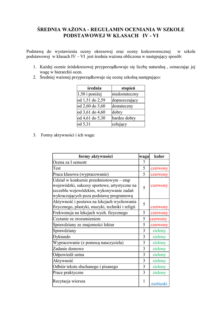 ŚREDNIA WAŻONA - REGULAMIN OCENIANIA W SZKOLE
